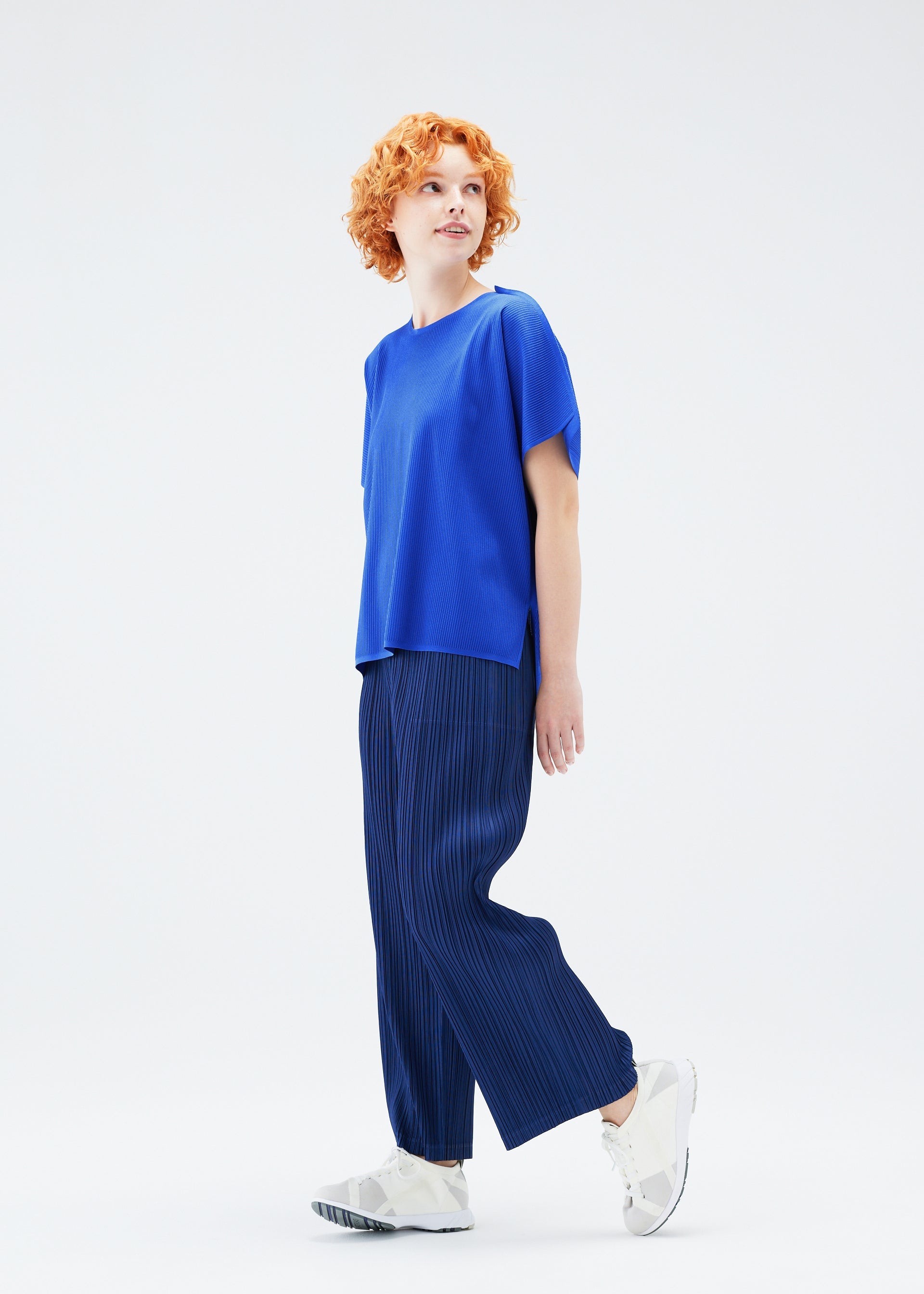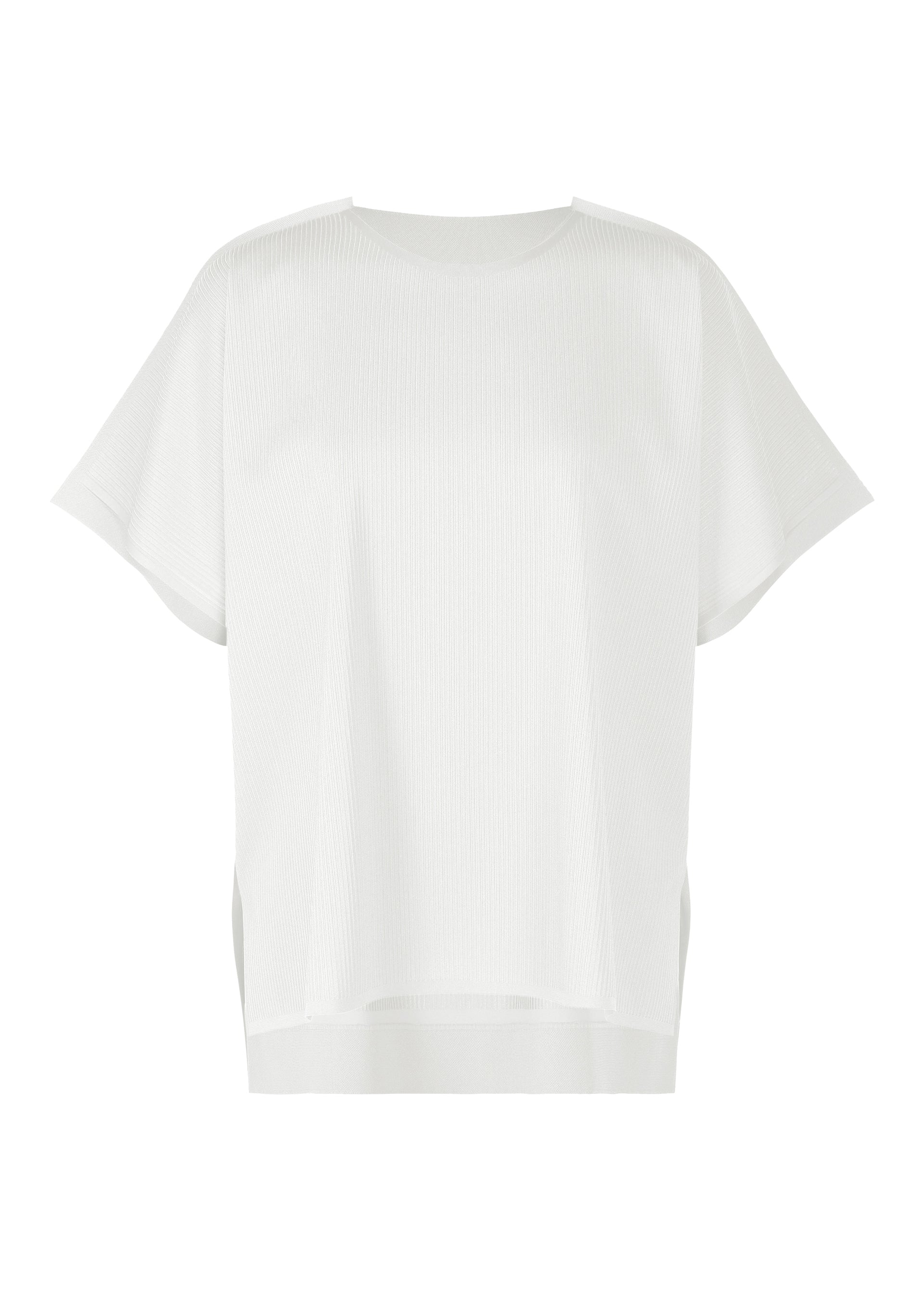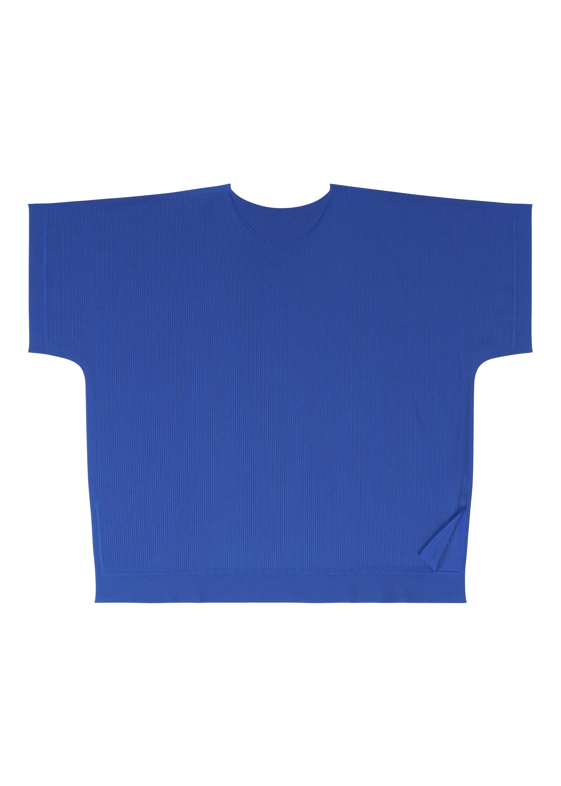 This round-neck, short-sleeved top has an A-POC structure featuring fine pleats. Its design is simple and makes it easy to use. The edges at the seams of the fabric accent the slits on both sides.