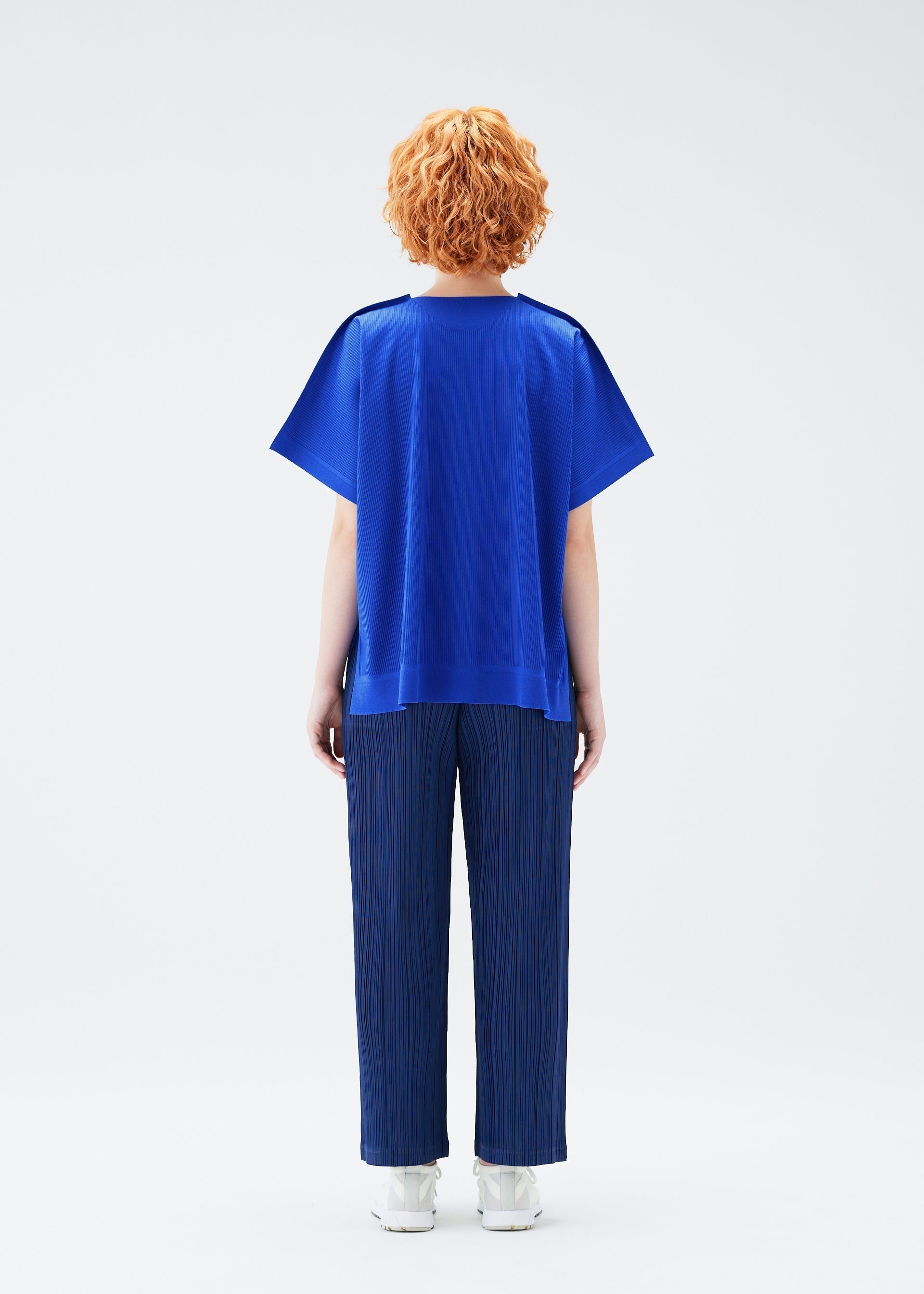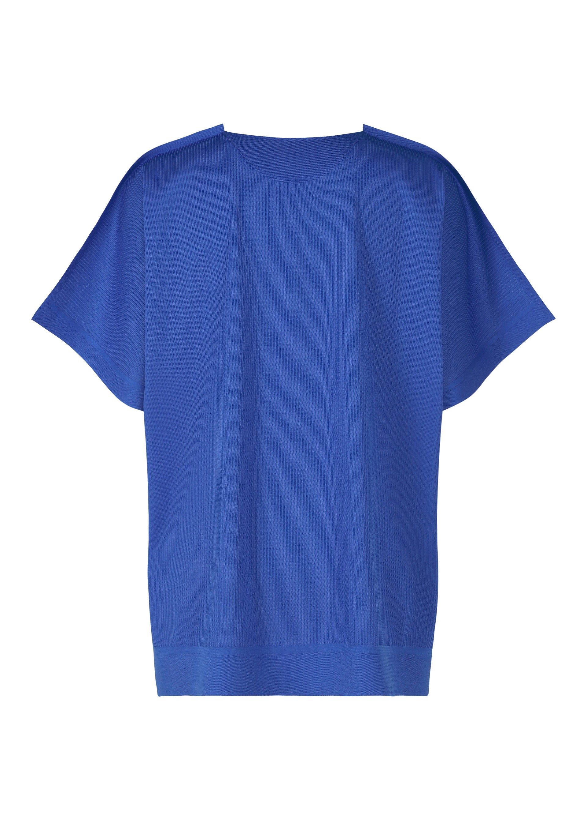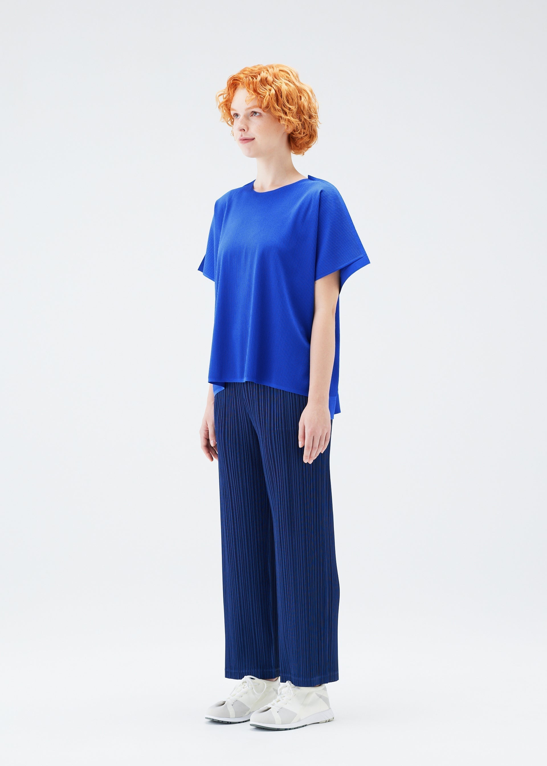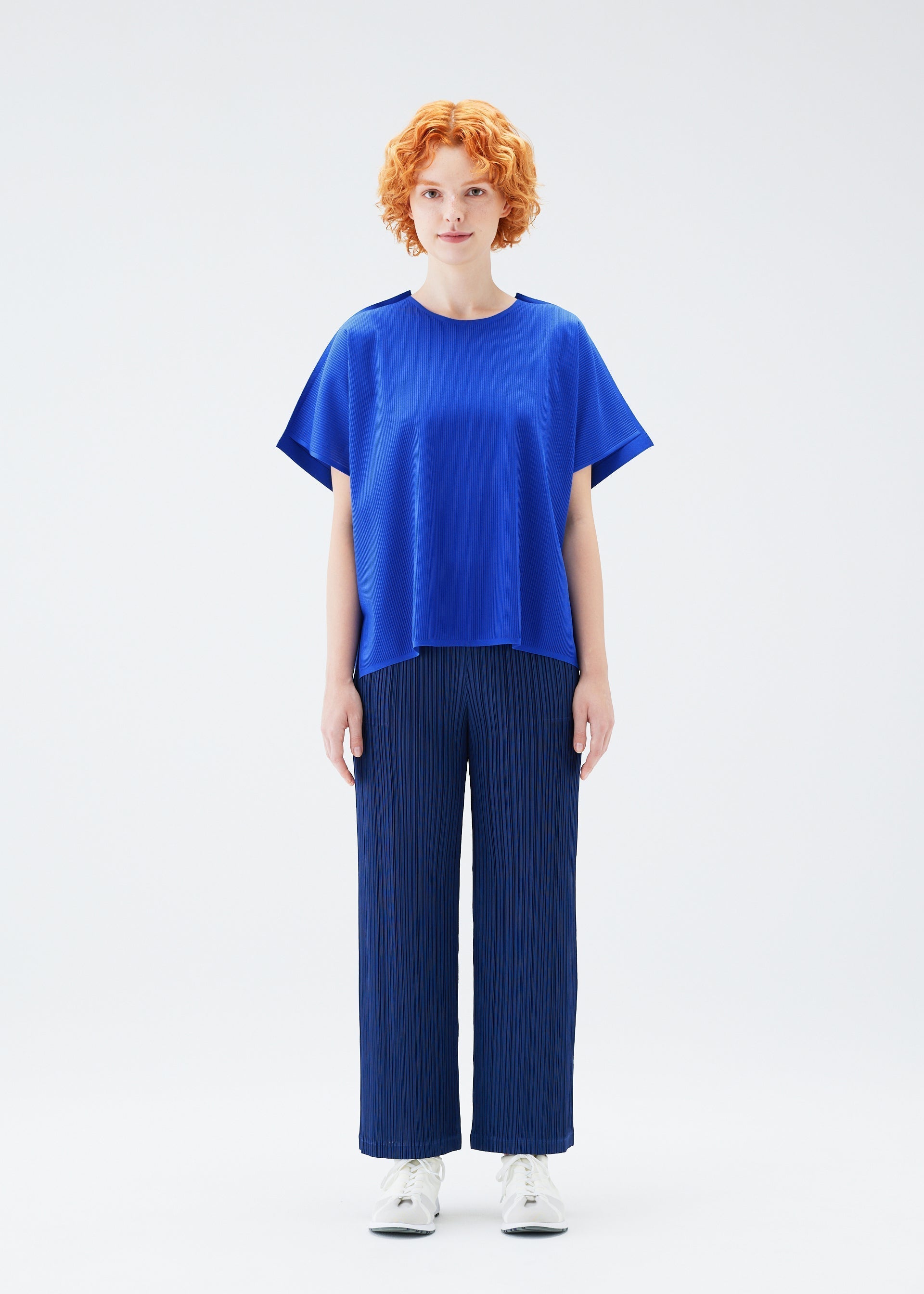 This round-neck, short-sleeved top has an A-POC structure featuring fine pleats. Its design is simple and makes it easy to use. The edges at the seams of the fabric accent the slits on both sides.