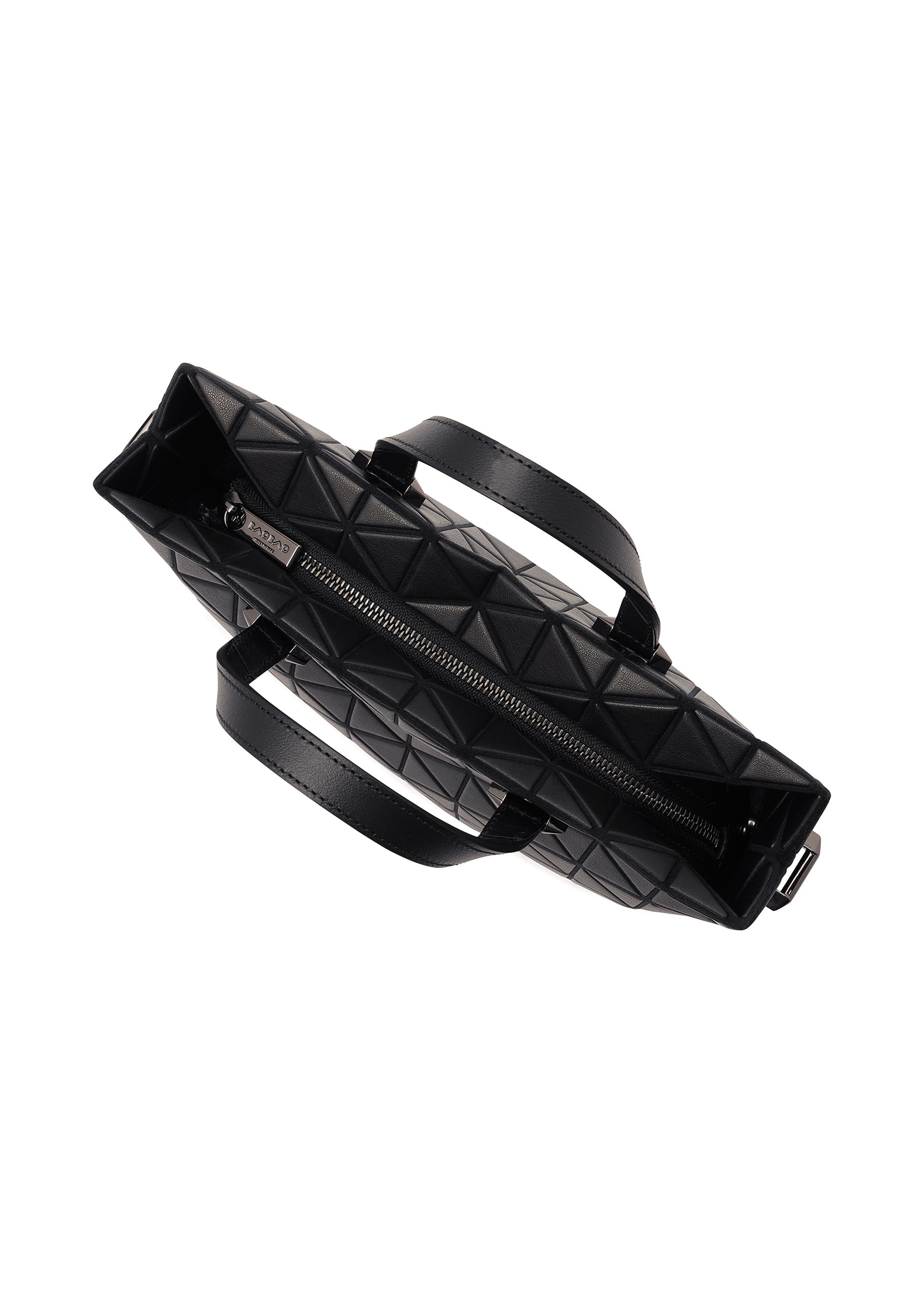 This mini handbag is characterized by its shape resembling a barrel (tonneau in French) composed of equilateral triangle pieces. The use of a leather-like matte material gives it an elegant feel. The strap is removable.