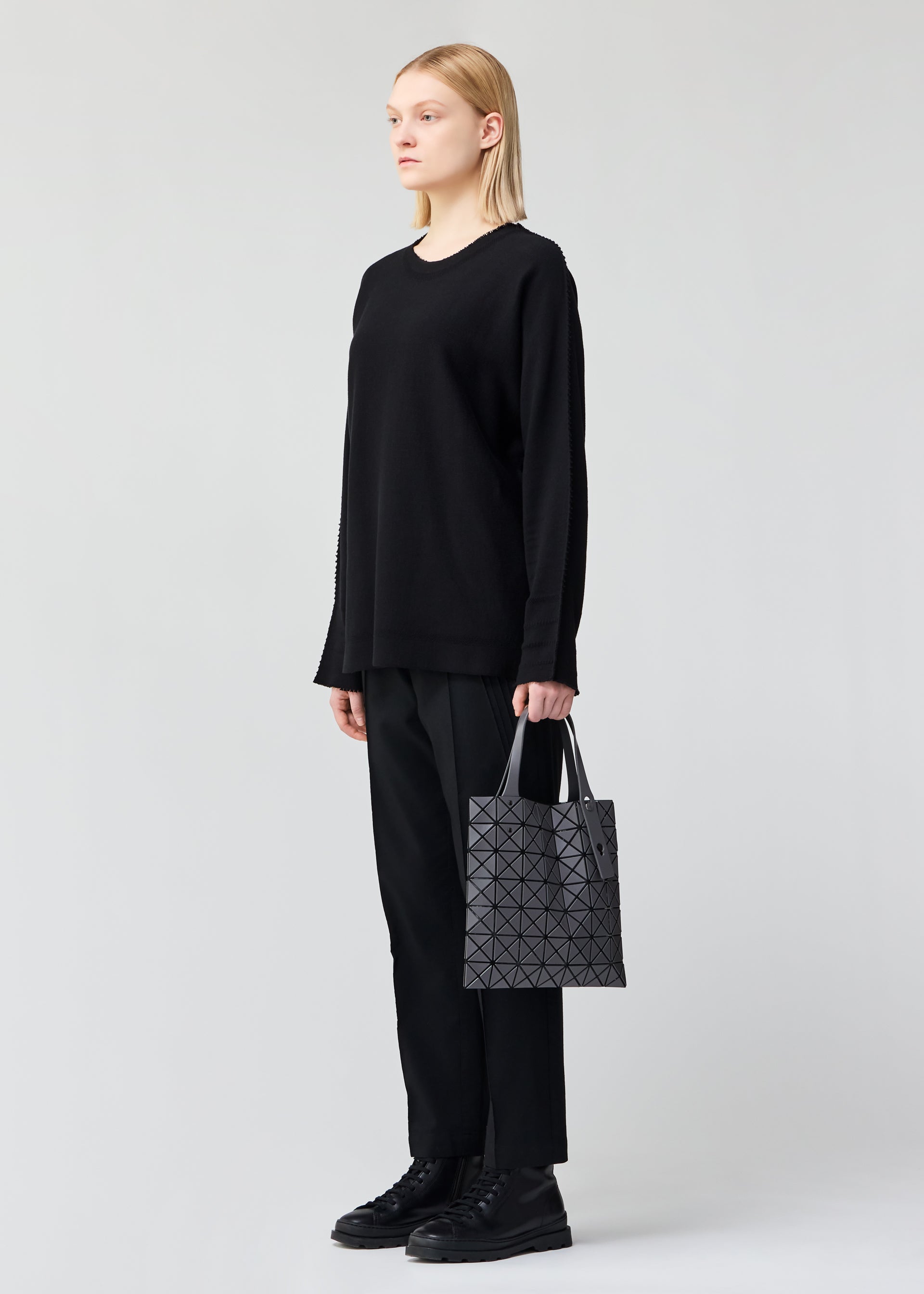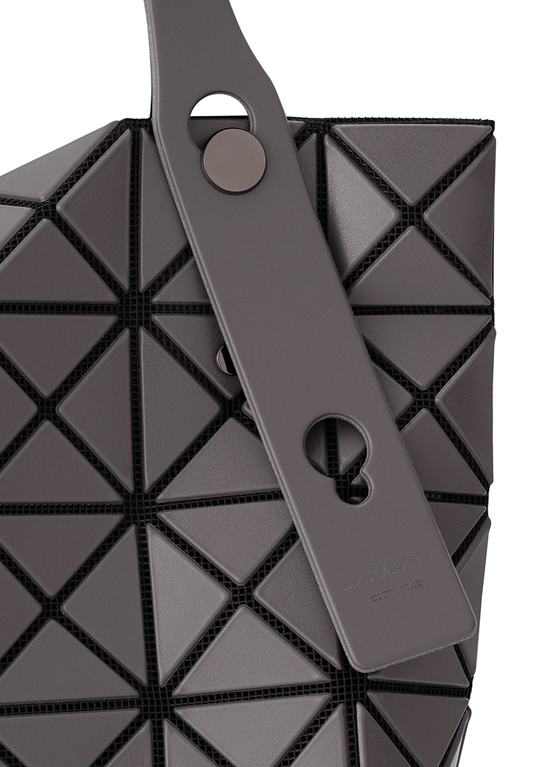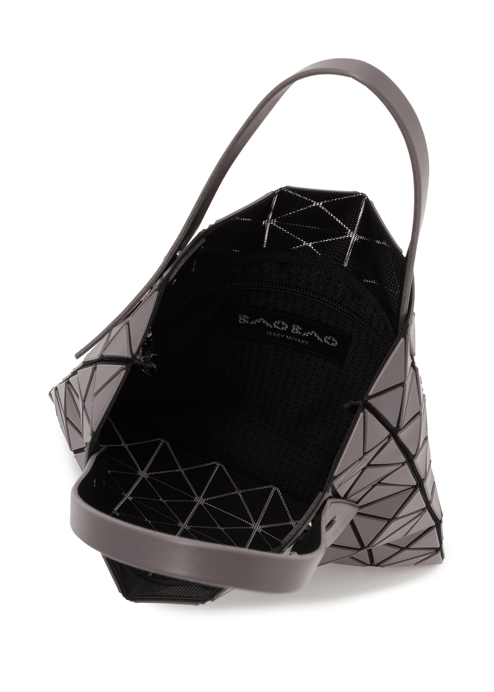 This PRISM series tote bag is made from leather-like matte material. The fine triangular pieces and soft sheen give it a subdued feel. There is a zippered inside pocket convenient for valuables such as your wallet and keys.