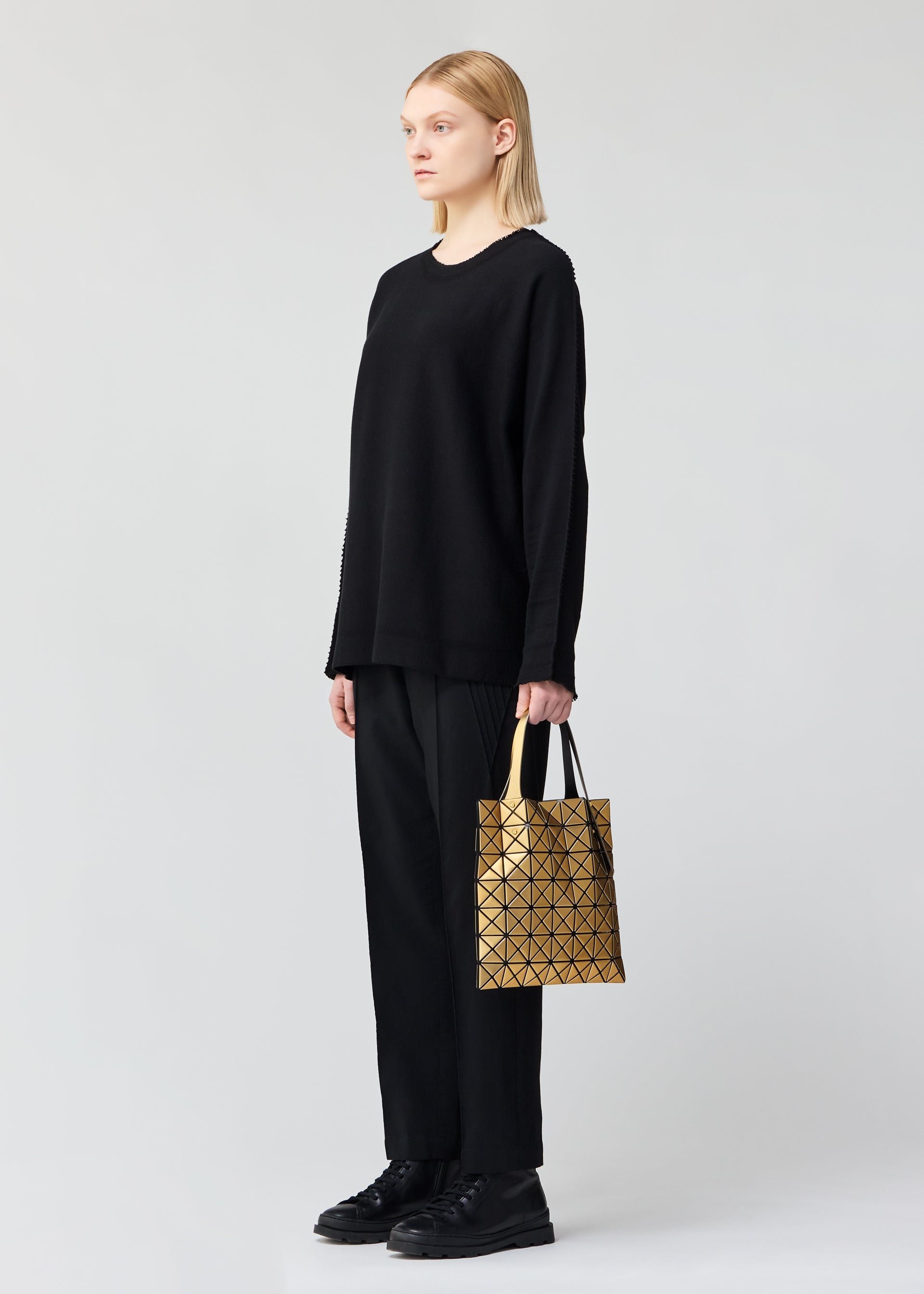 A tote bag from the PLATINUM series with a triangular piece of metallic material embossed with a fabric pattern. The entire bag can be worn as if it were a single accessory, giving it a luxurious feel that can be worn not only on special occasions, but also as an accent to your everyday outfit. There is an inner pocket with a zipper that is convenient for storing valuables such as wallets and keys.