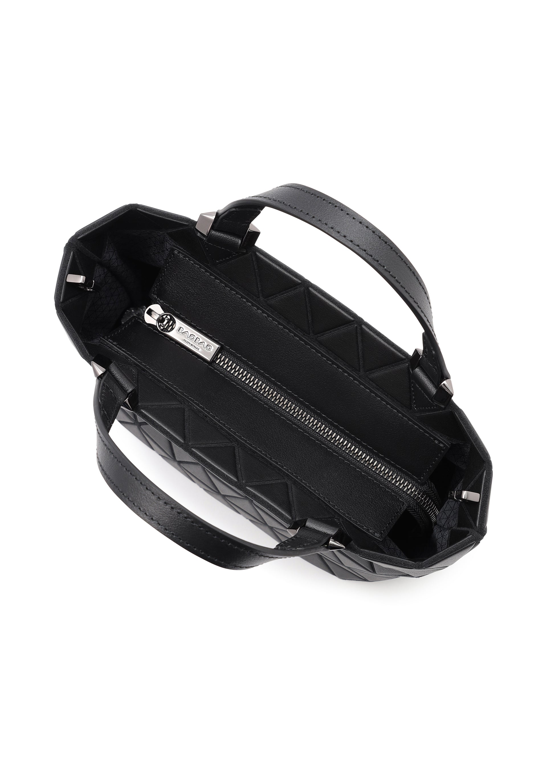 This chic mini handbag combines triangular pieces made from leather-like matte material with leather straps and handles. The straps are detachable. The two inside pockets are convenient for storing small items such as a card case and smartphone.