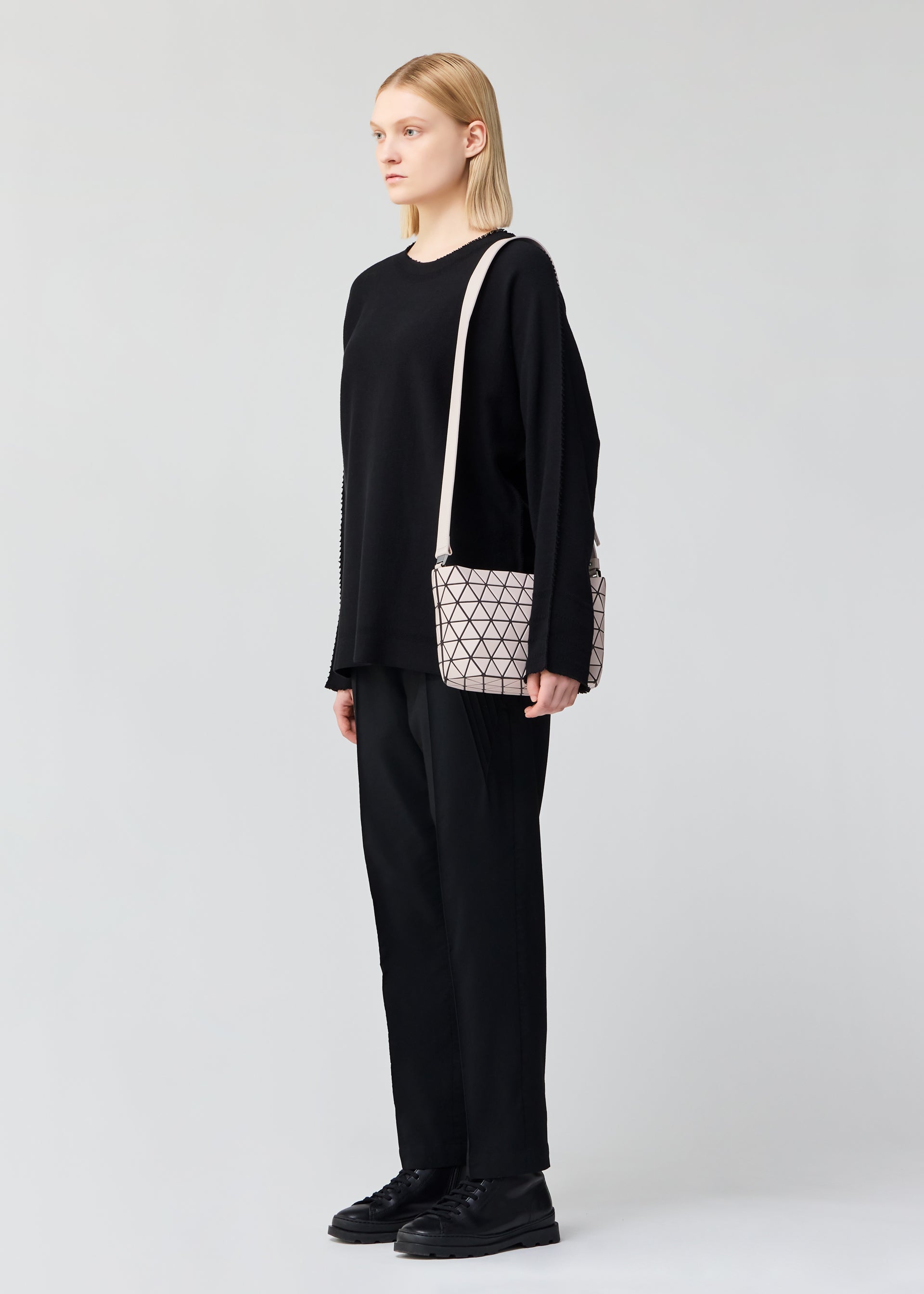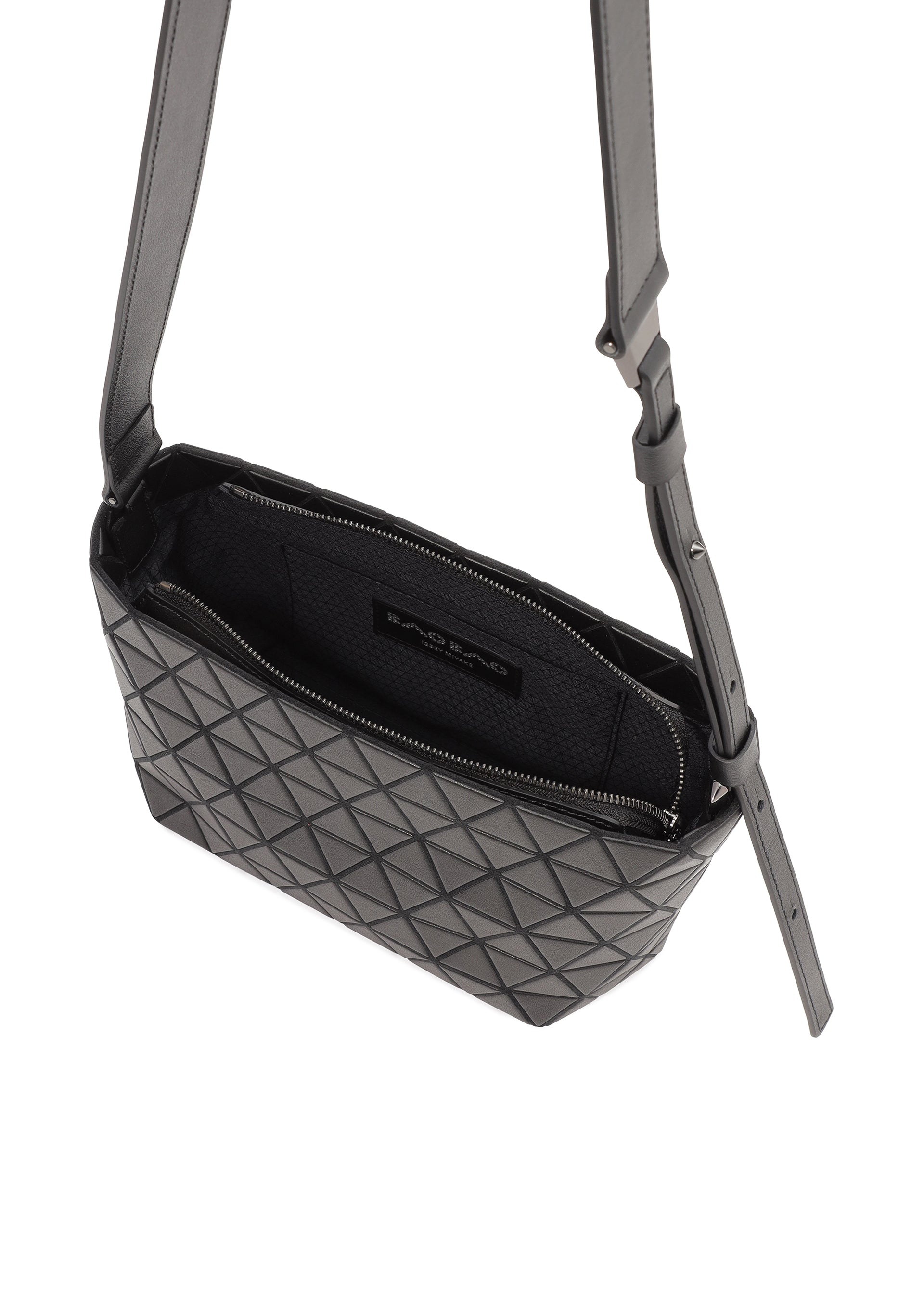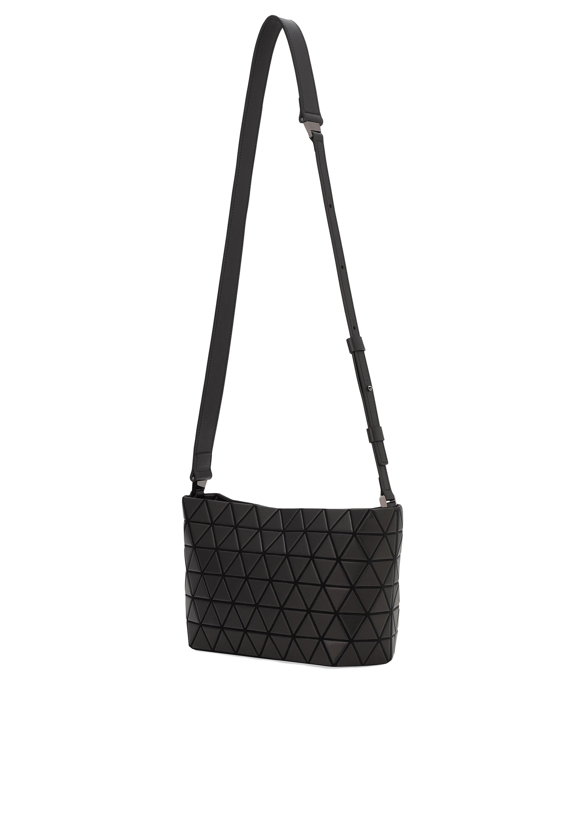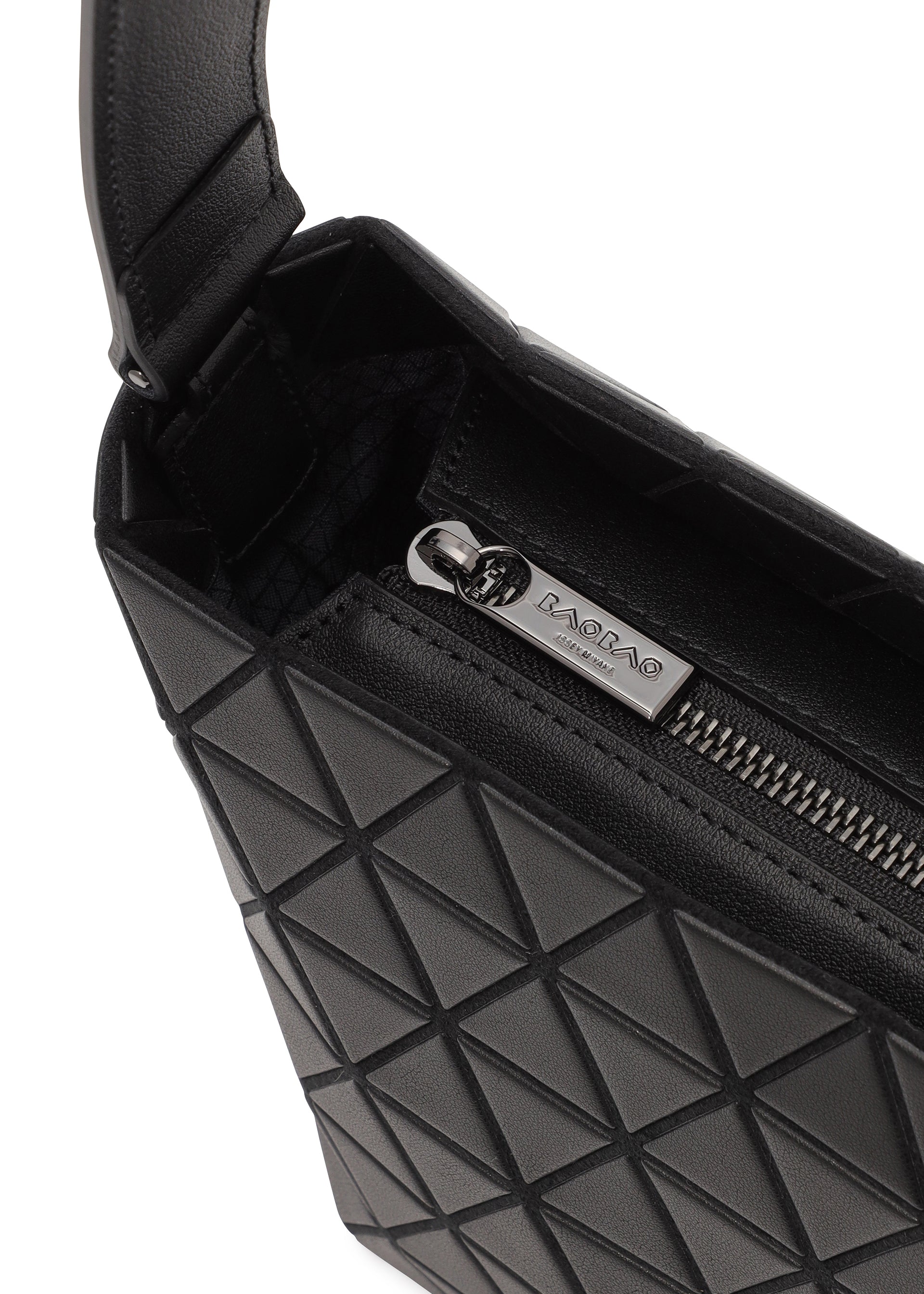 This chic shoulder bag combines triangular pieces made from leather-like matte material with leather straps and handles. The leather strap and metal fittings accent the design.