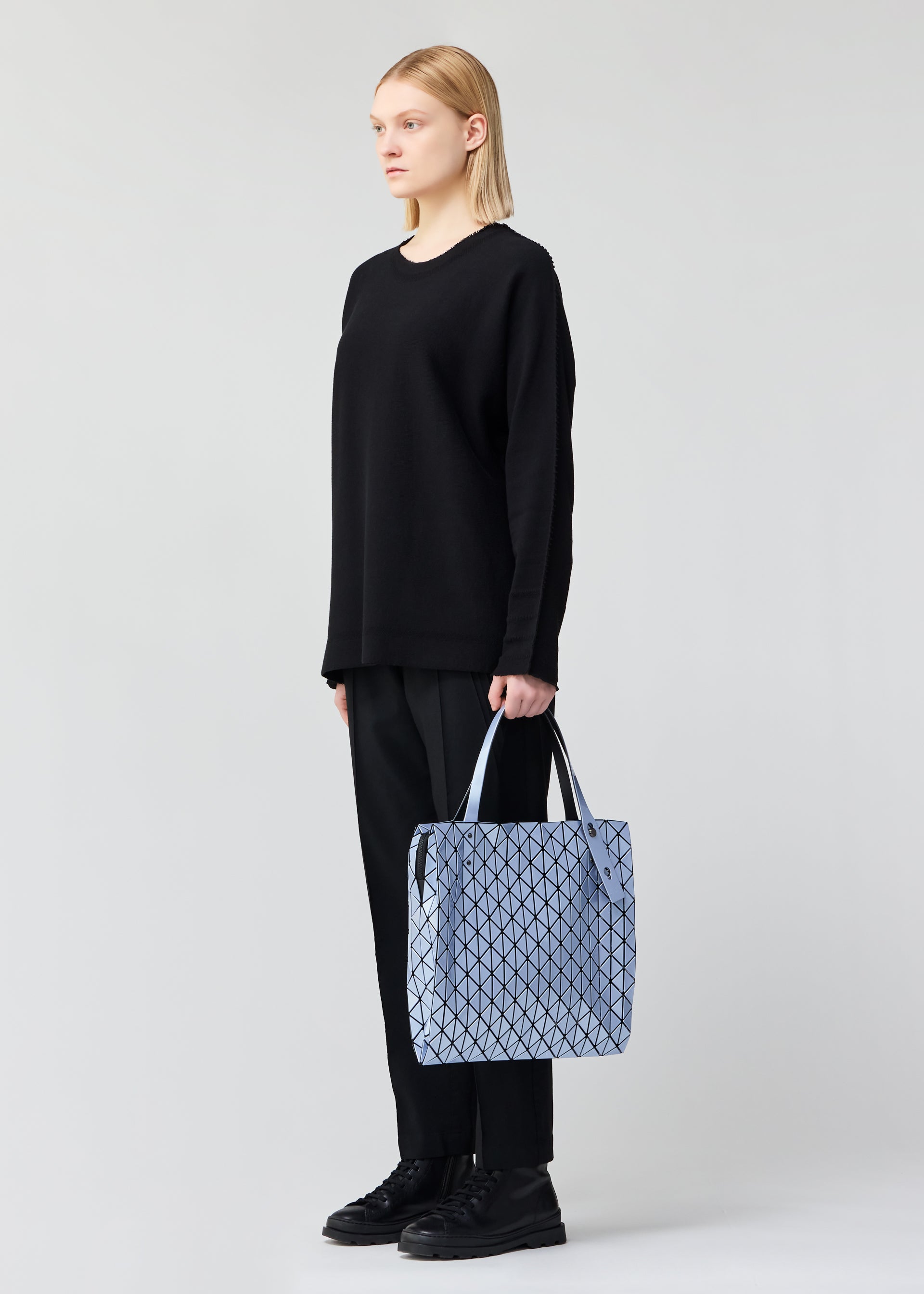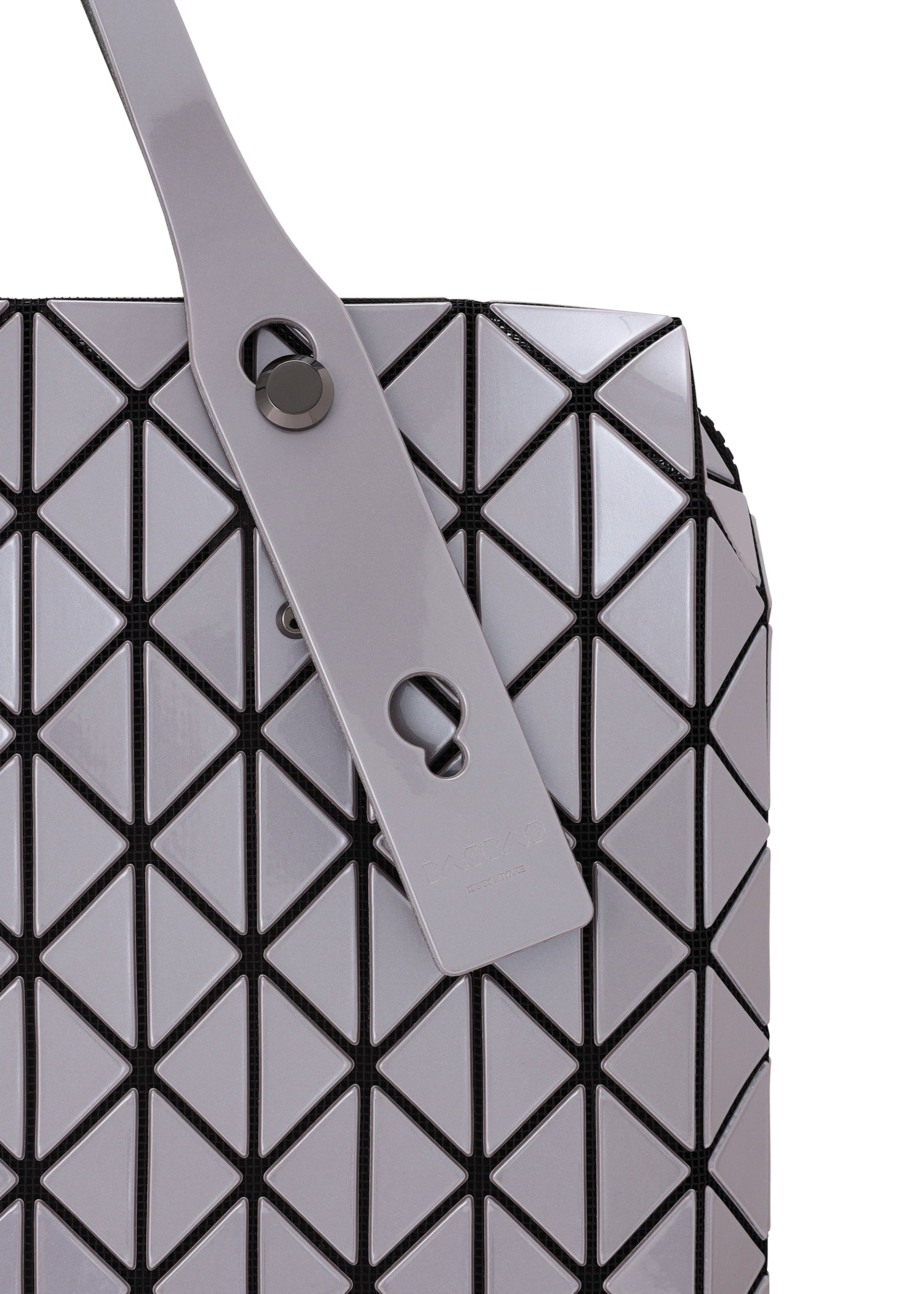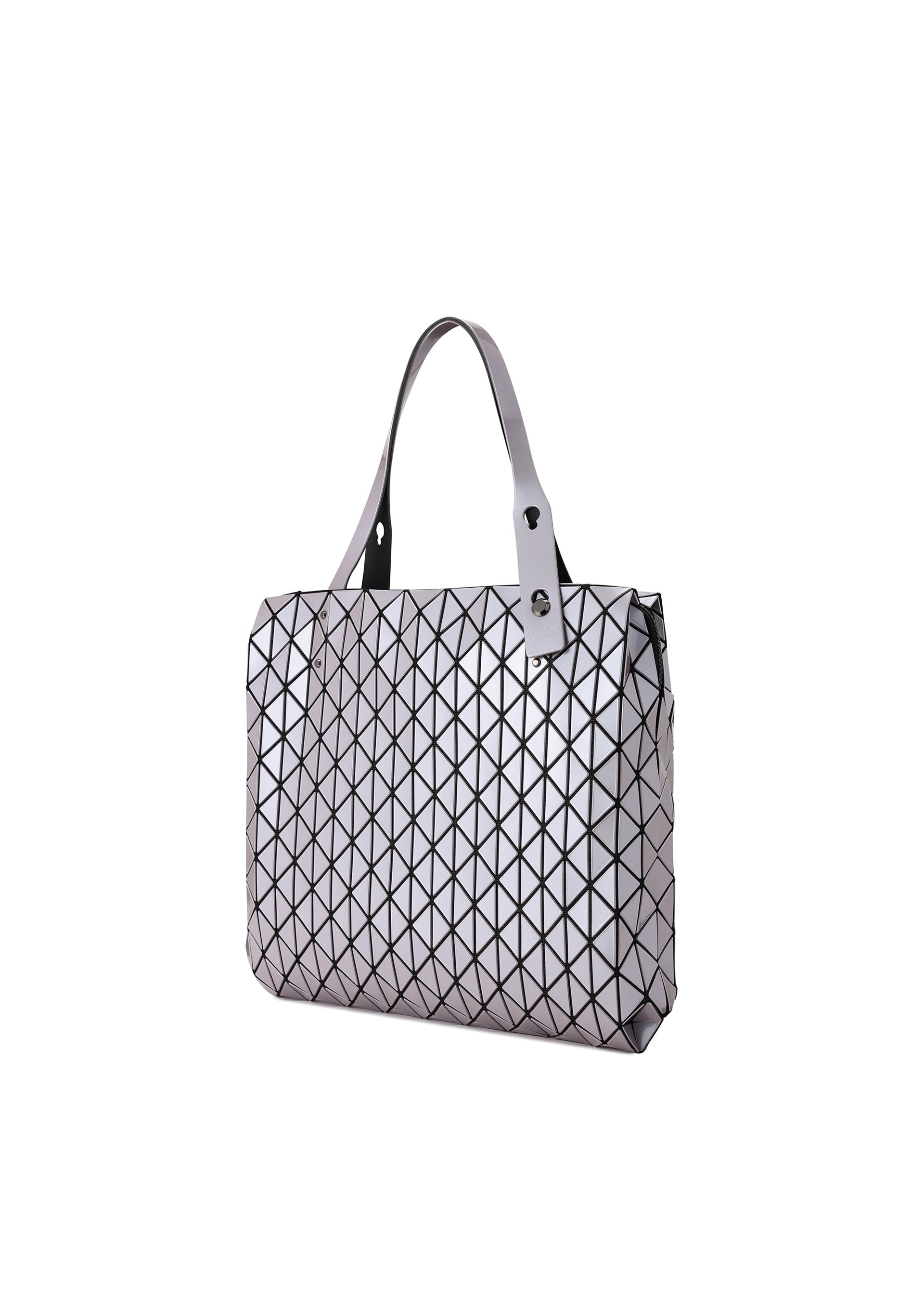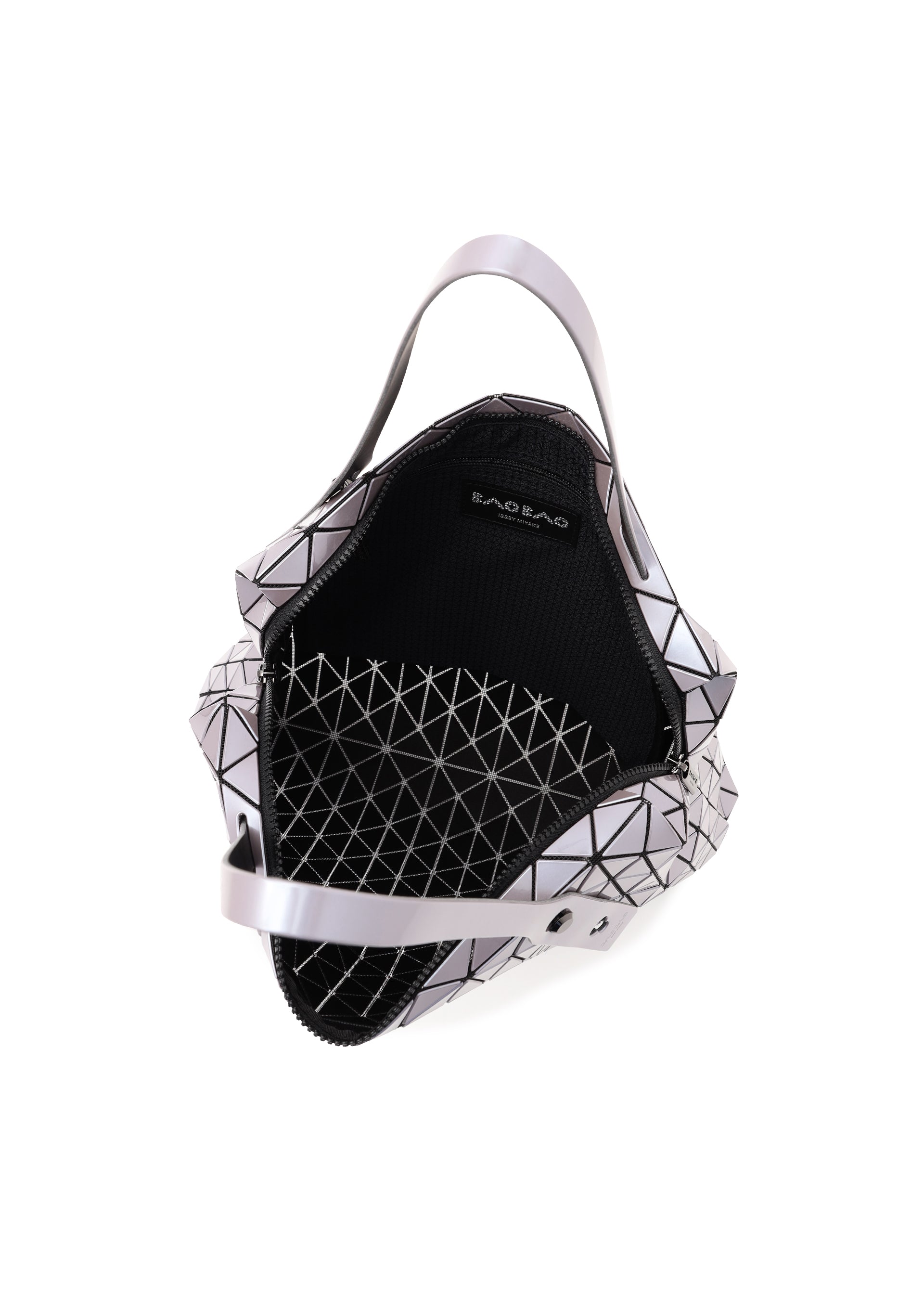 This handbag is made by vertically rearranging and reconstructing the triangular pieces of the PRISM series. Each piece made from polarized pearl material changes color softly depending on the way the light hits it, giving the bag a variety of looks in sorbet colors. The bag can hold thick A4-sized documents and a 13-inch laptop.