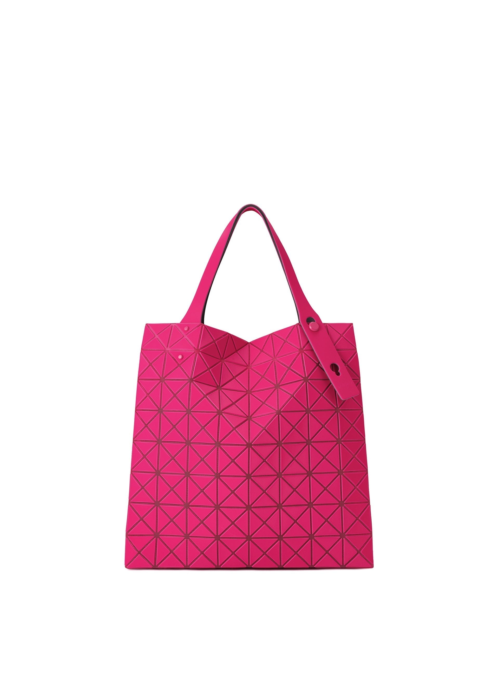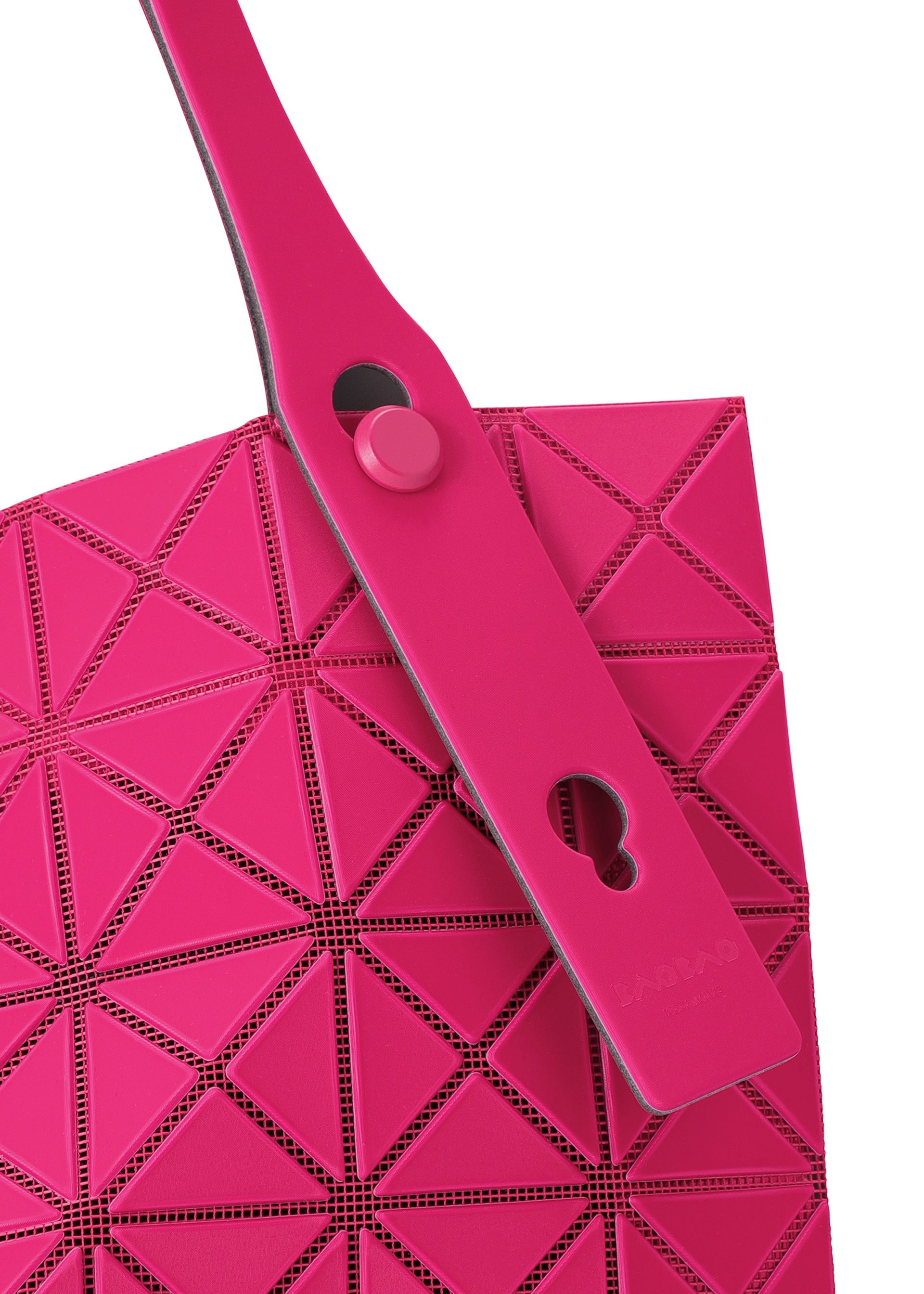 A PRISM series tote bag with a gusset made of textured material. The triangular pieces, mesh, and metal fittings are all unified in one tone. By folding the gusset to the side, it lies flat when stored, and when you put things in it, the gusset is woven into the inside, making it look like a shopping bag. It looks more compact than the standard PRISM series, but the storage capacity is almost the same.