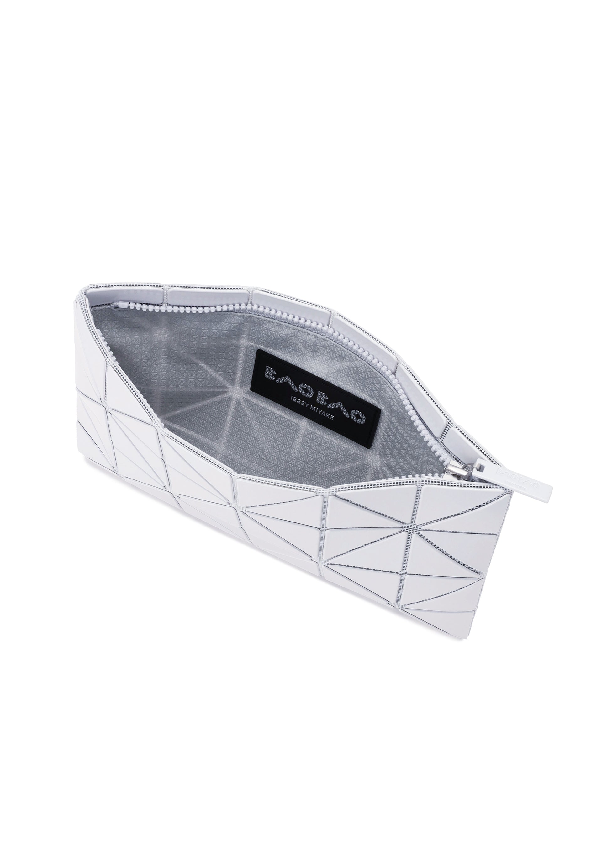 This LUCENT series pouch is made using glossy enamel material. The use of mesh fabric woven with threads in the same color as the triangular pieces, as well as the lining in the same color, gives a cohesive, stylish impression.