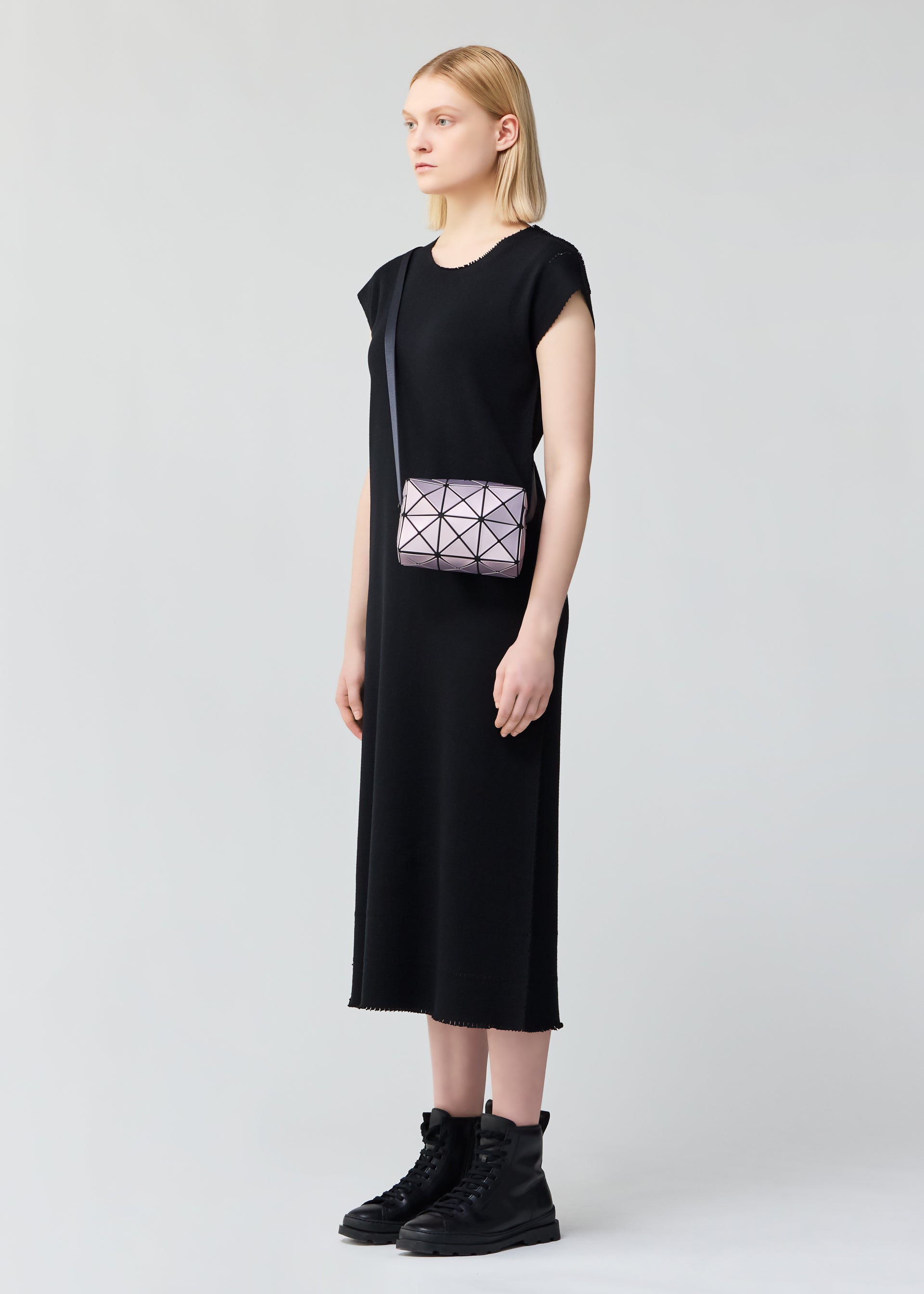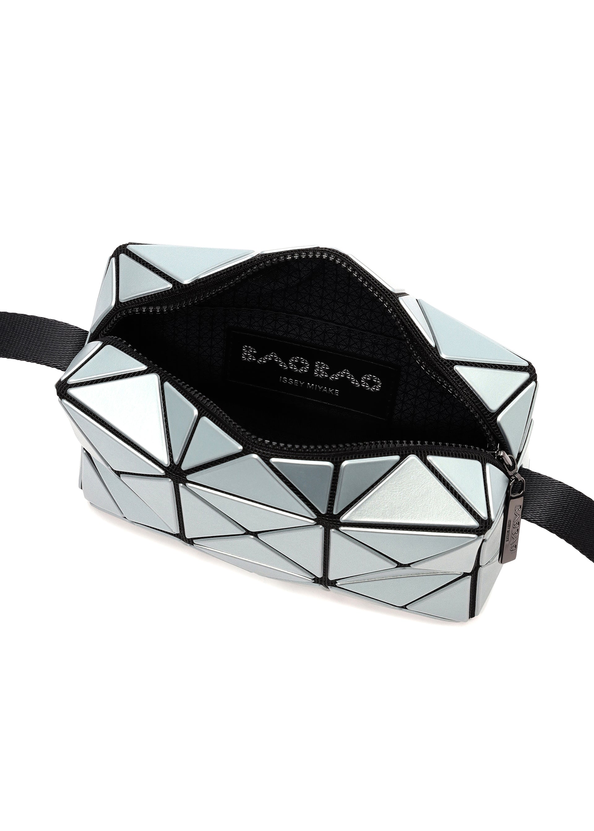 This shoulder bag is characterized by its cuboid shape composed of triangular pieces and is made using metallic material. Pockets and zippers are hidden in the joints of the triangular pieces, creating a seamless, minimalist design. The strap length can be adjusted with the internal hardware, allowing the shoulder bag to be used in a variety of styles.