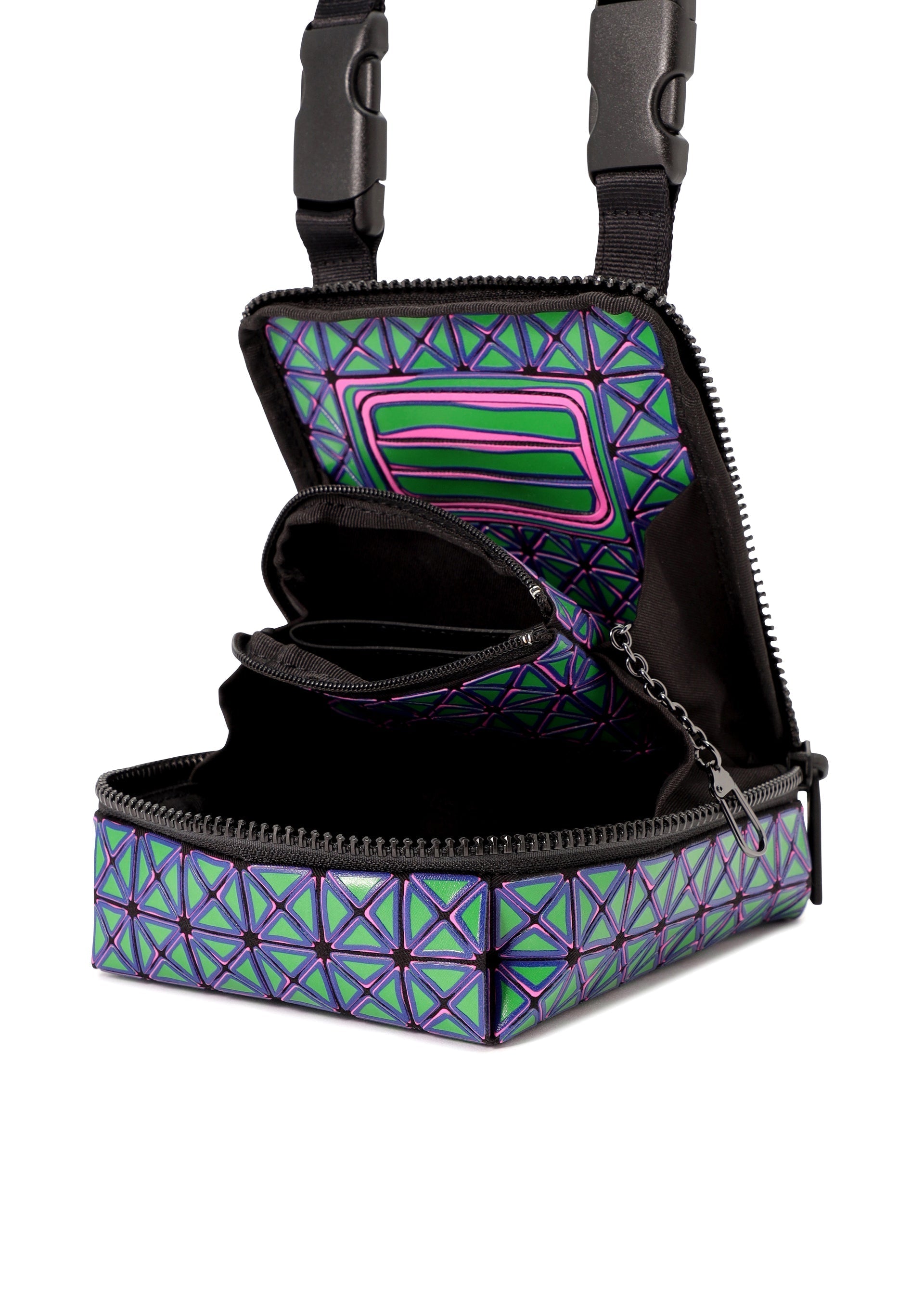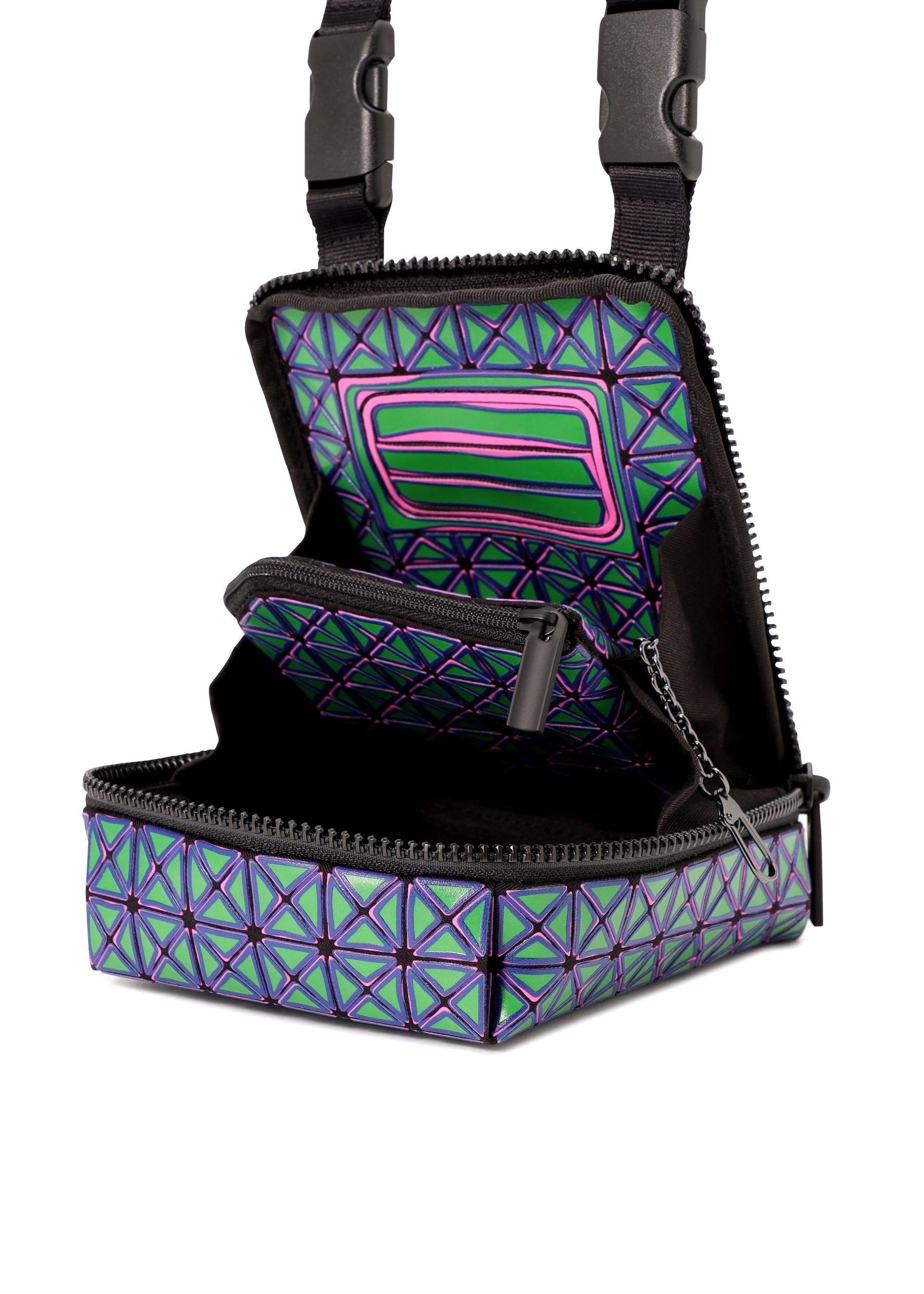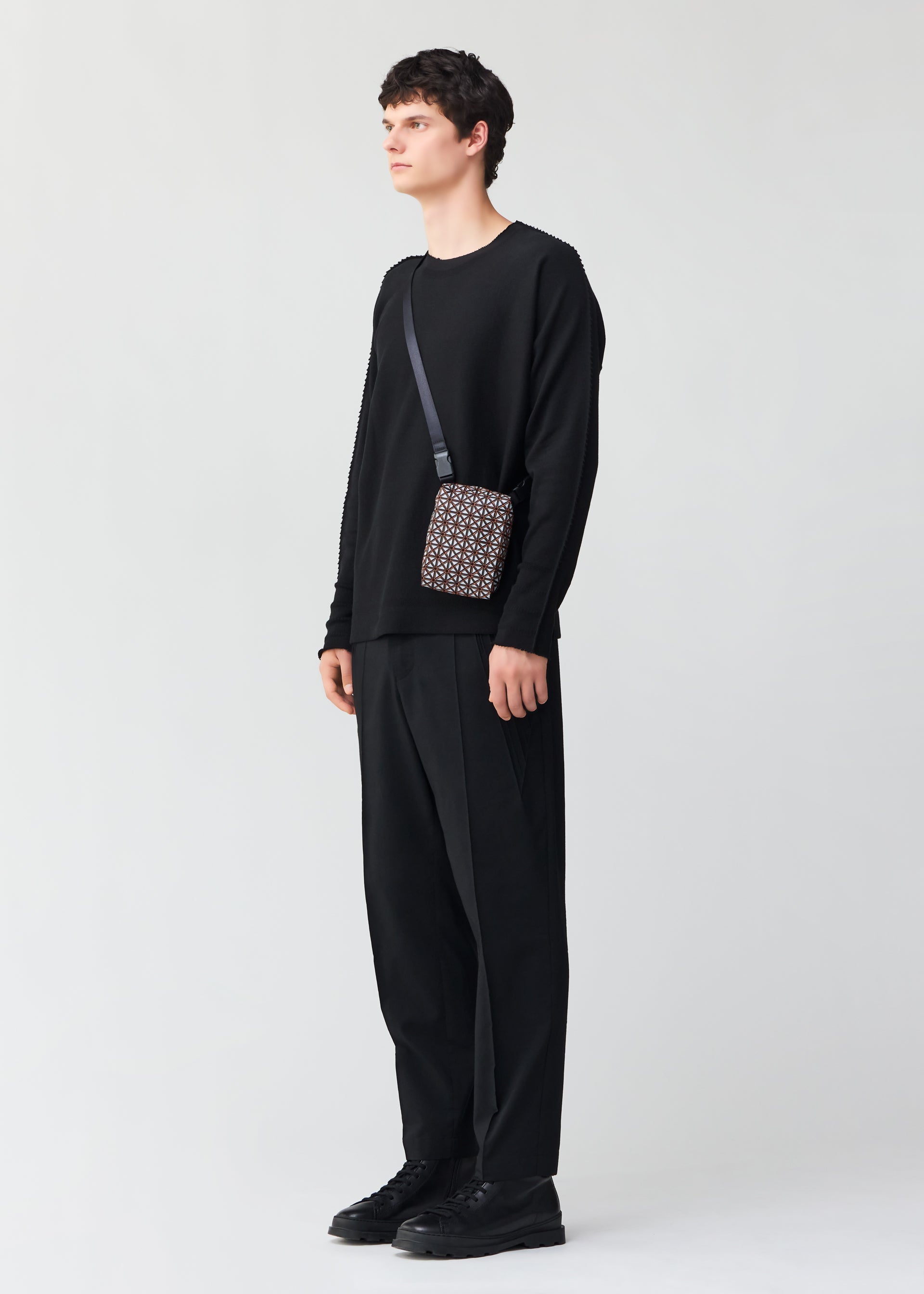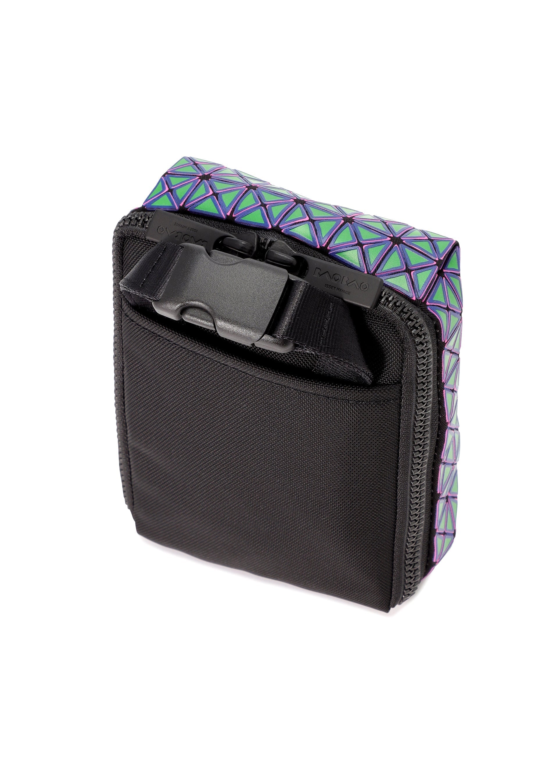 This KURO series multi-style case with a shoulder strap is characterized by its hand-drawn distorted triangles. A mysterious pattern was created by layering the neatly arranged triangular pieces. Despite its compact size, it is a highly functional item with a coin case, card slots, and even a removable key holder. It is also recommended for travel, as it can smoothly hold a smartphone and passport.