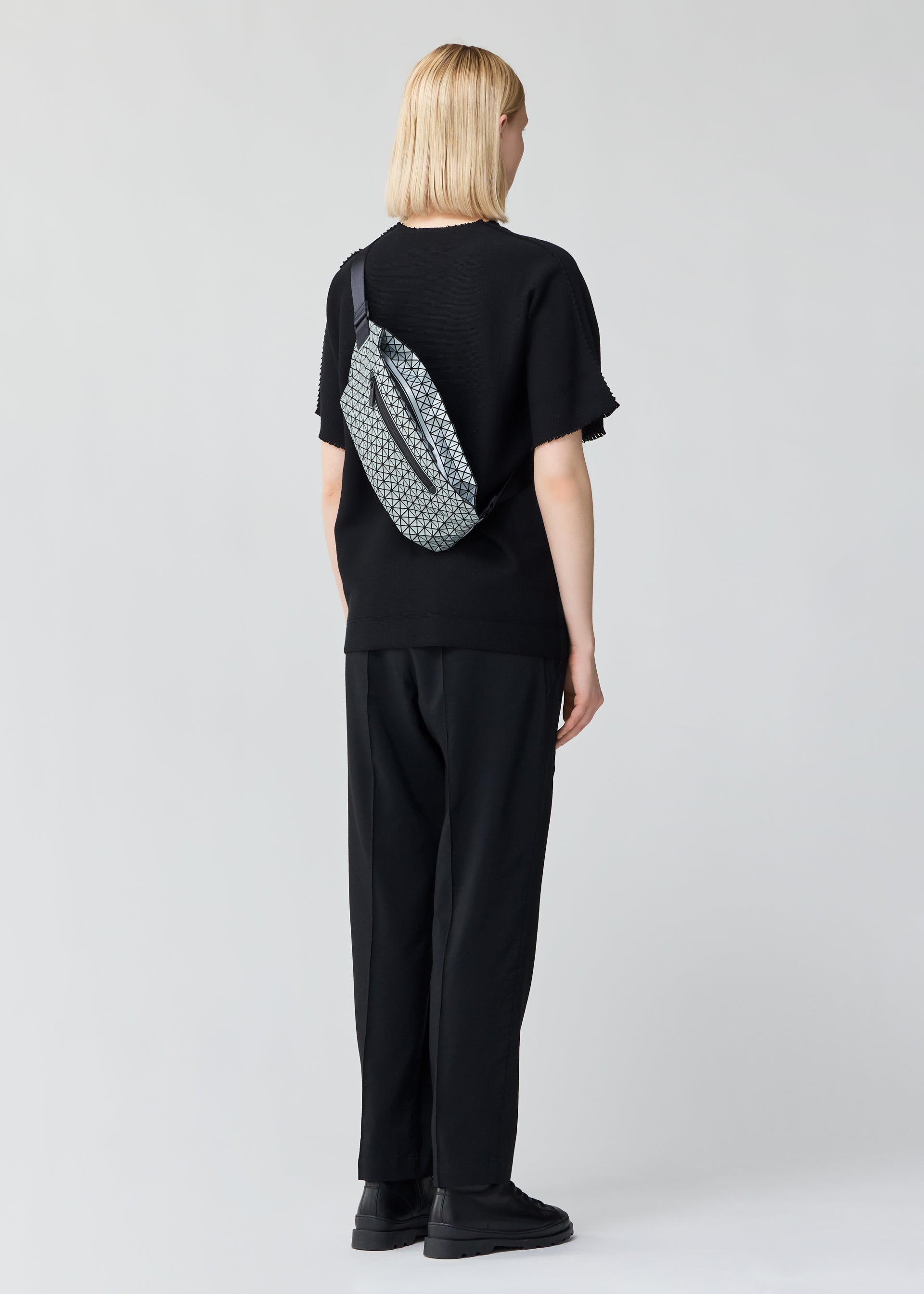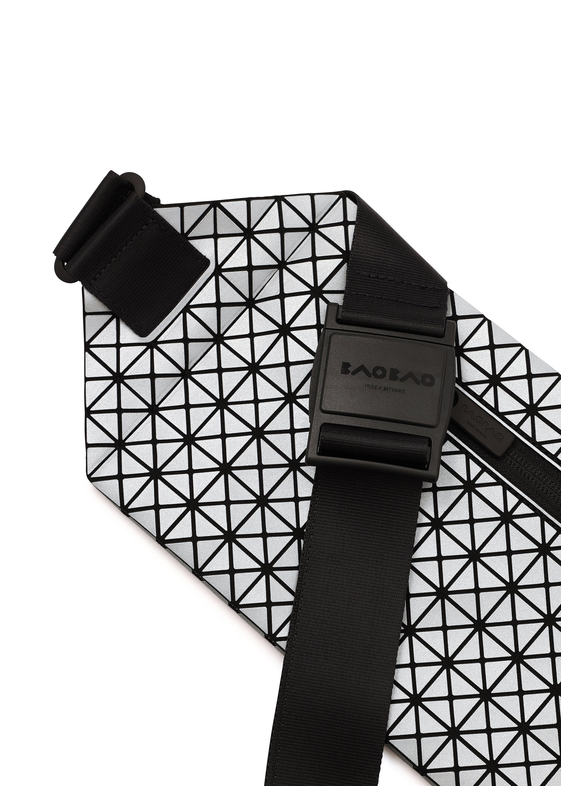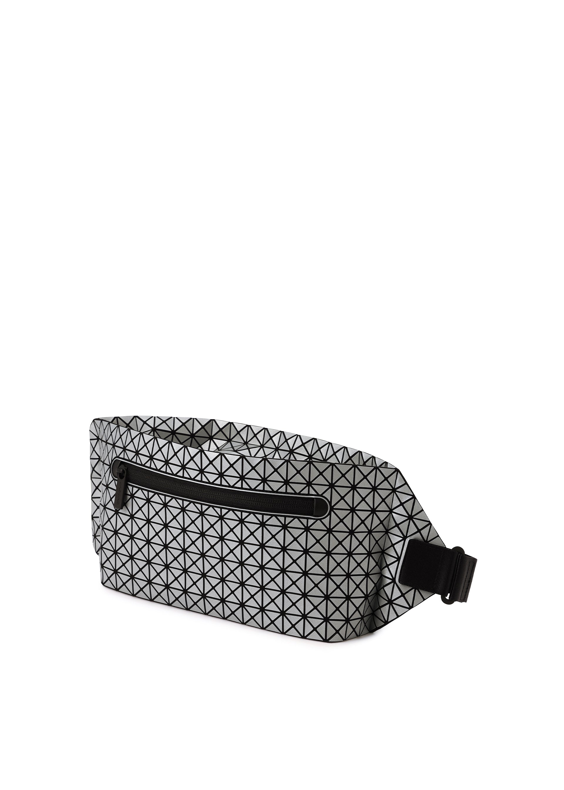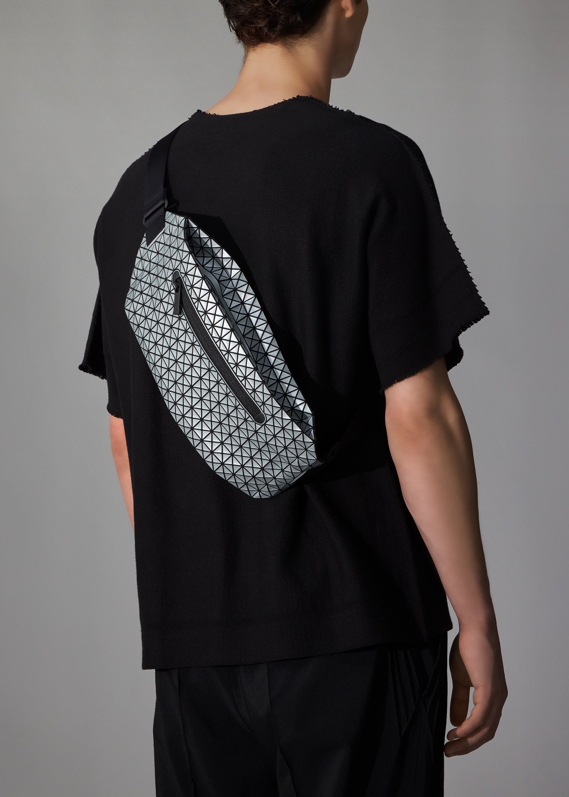 This KURO series belt bag is characterized by its fine, supple pieces. This series uses reflective material for the triangular pieces. When light hits the bag in the dark, its entire three-dimensional surface reflects the light. The metallic look of the material is apparent in bright places. In addition to an outside pocket, it has a inside pocket convenient for storing valuables such as your wallet and keys.