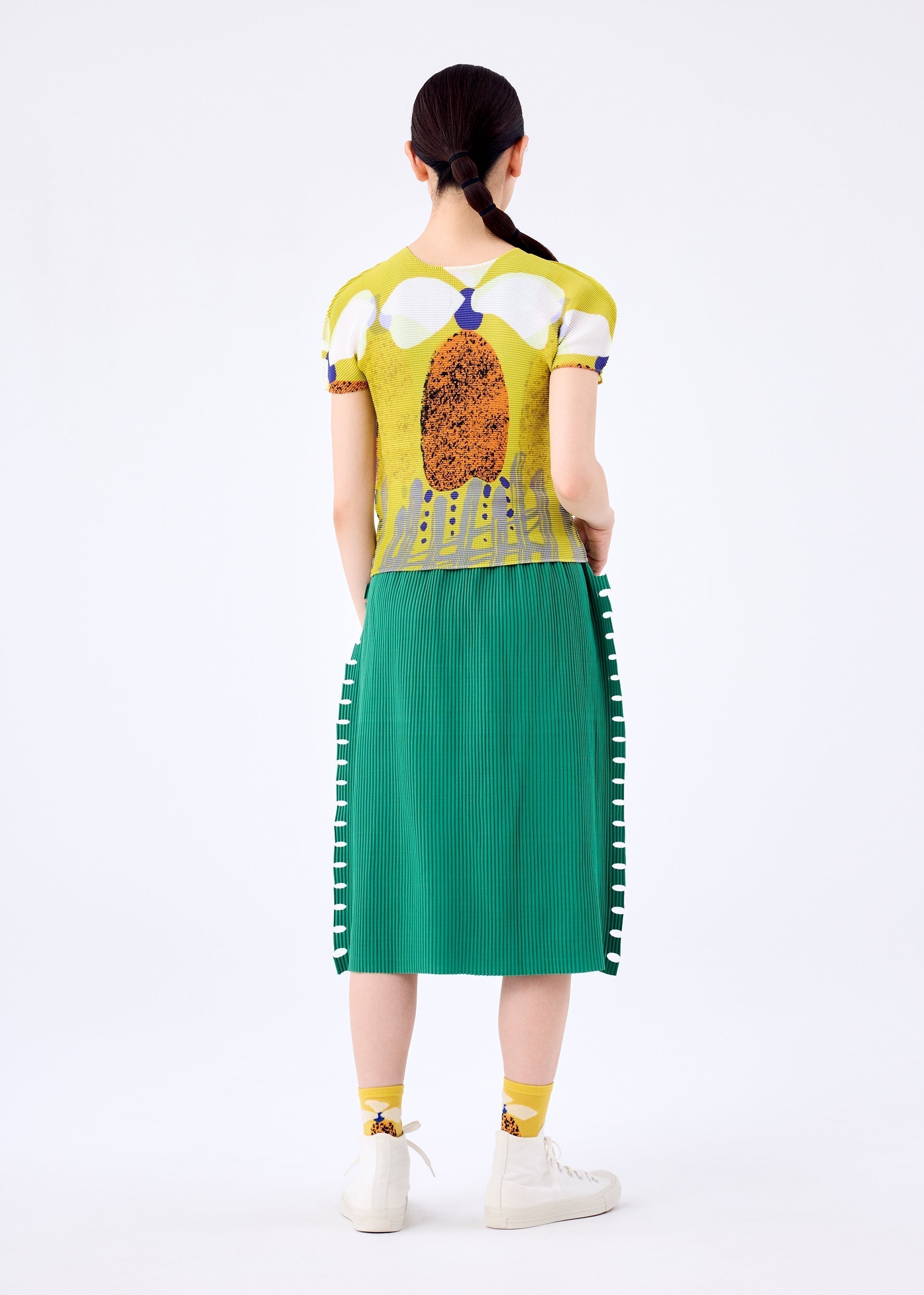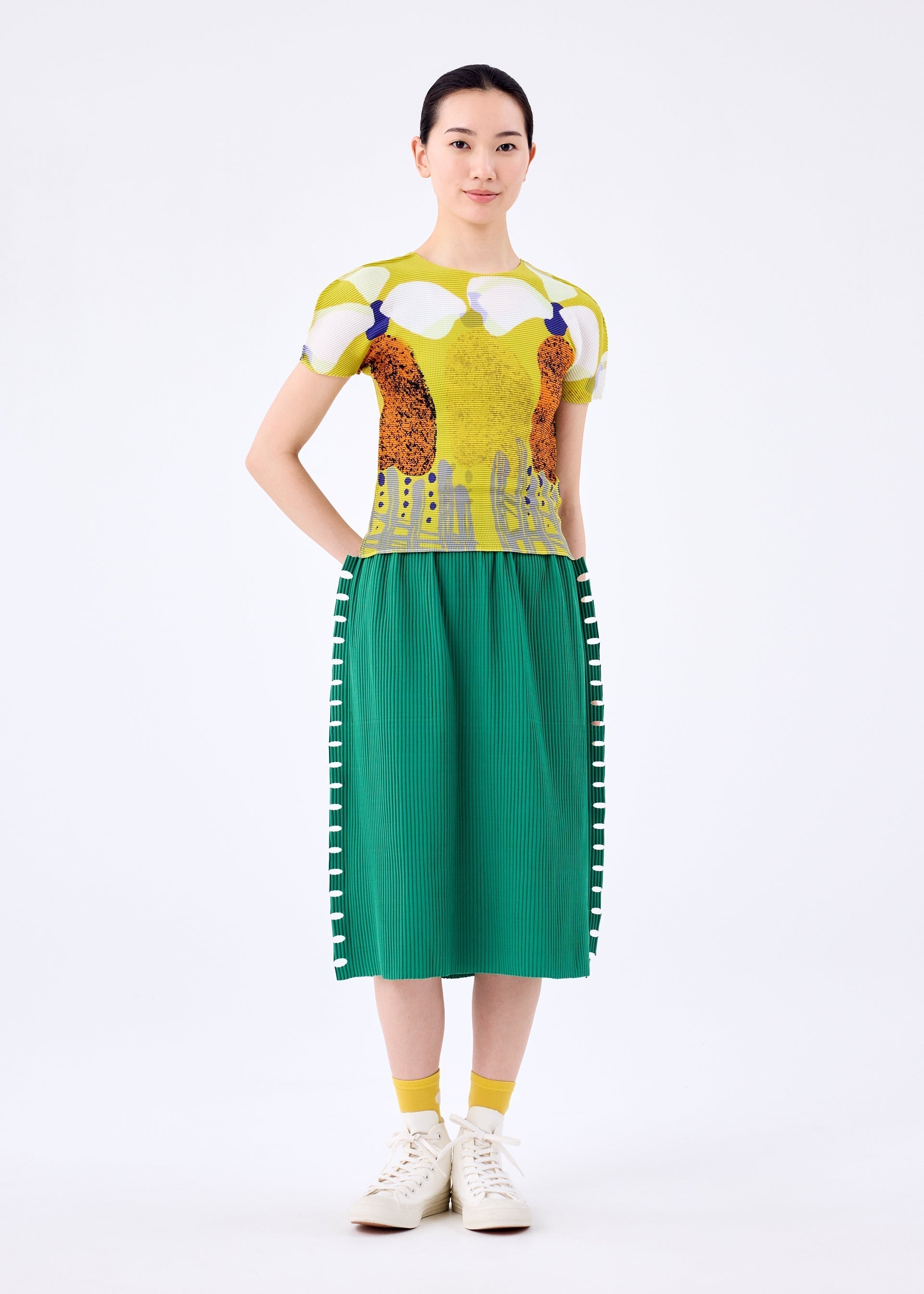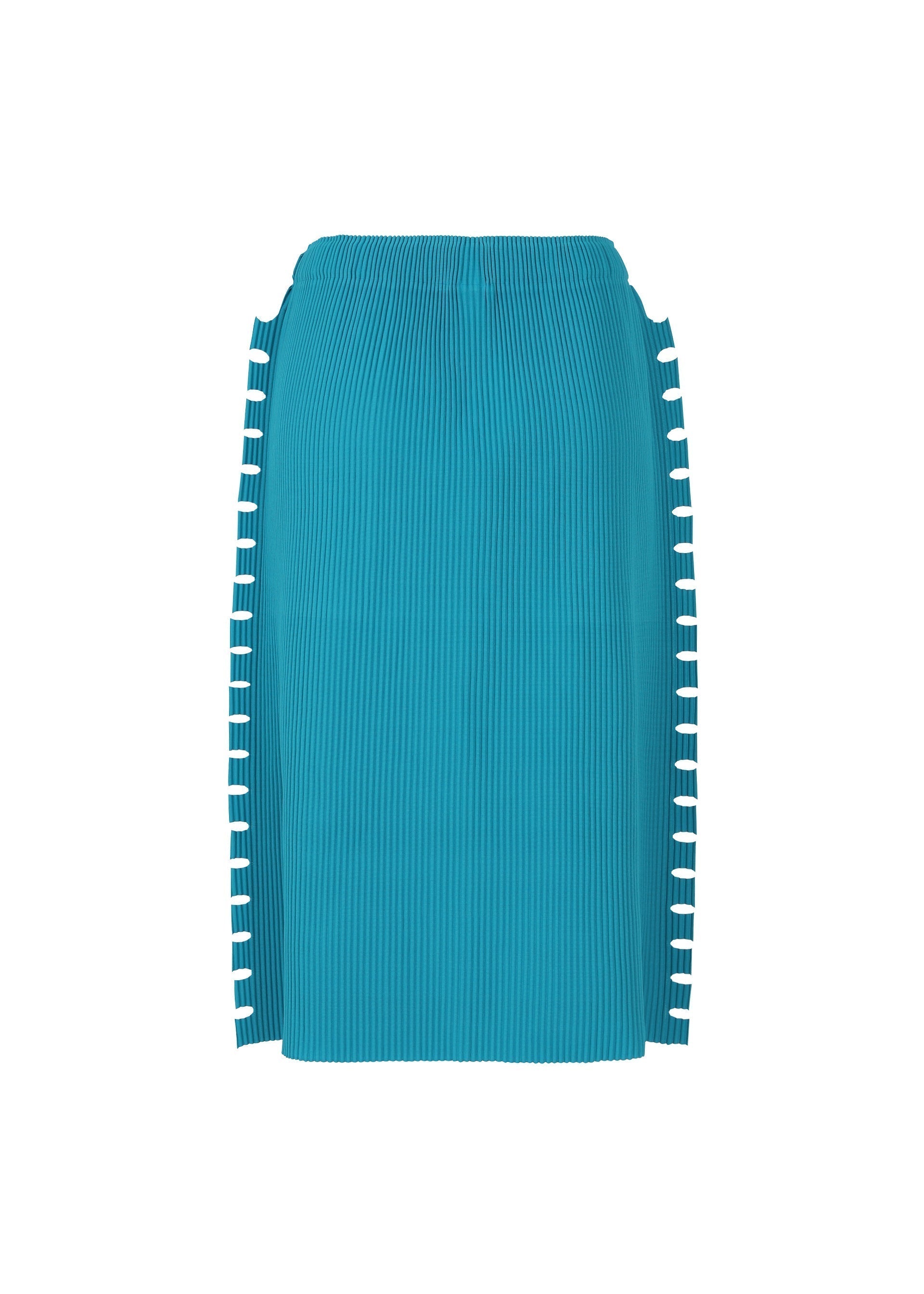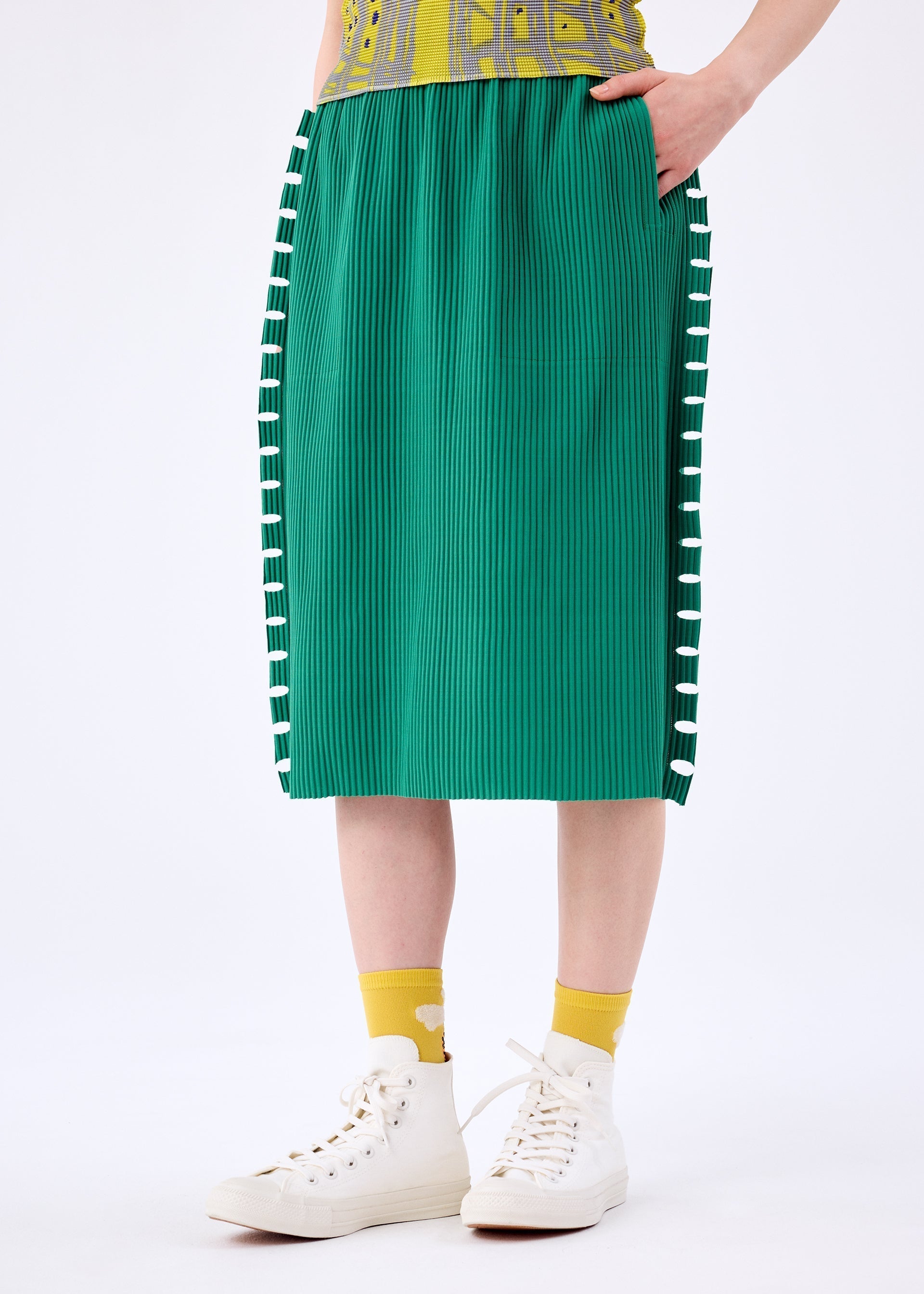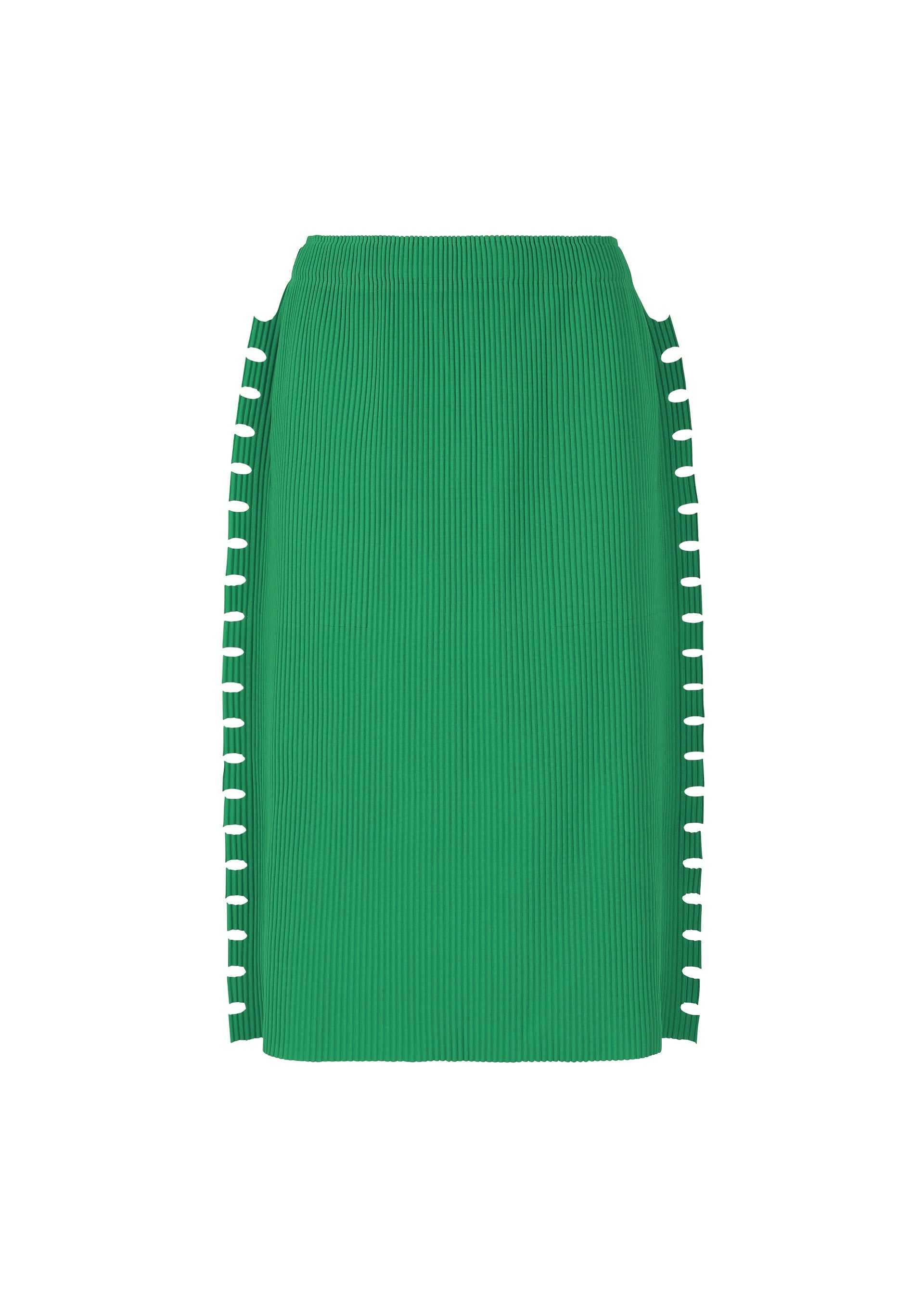 This FINE KNIT PLEATS skirt is characterized by its lightweight, soft feel and features pleats applied to knit material made with stretchy, thin, soft yarn. The bold design features fringes inspired by the thorns, forms, and textures of plants. There are pockets on both sides.