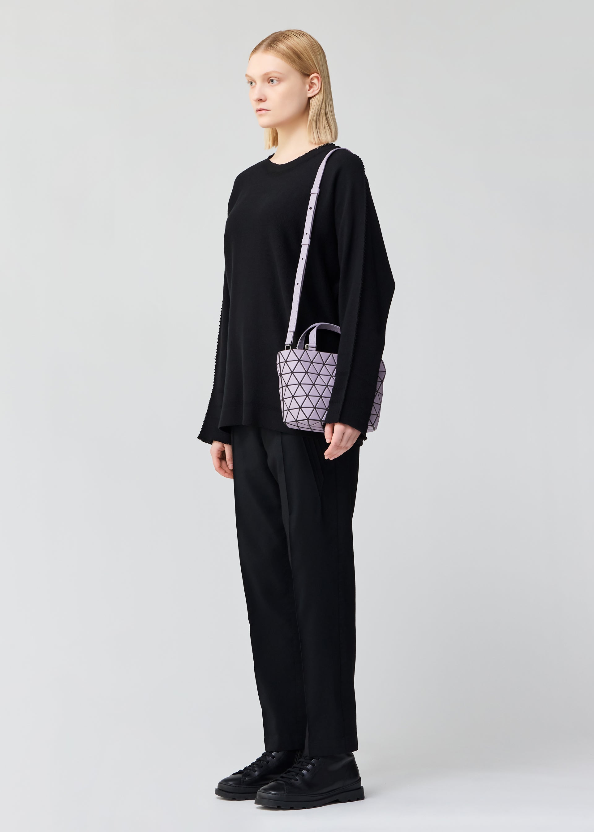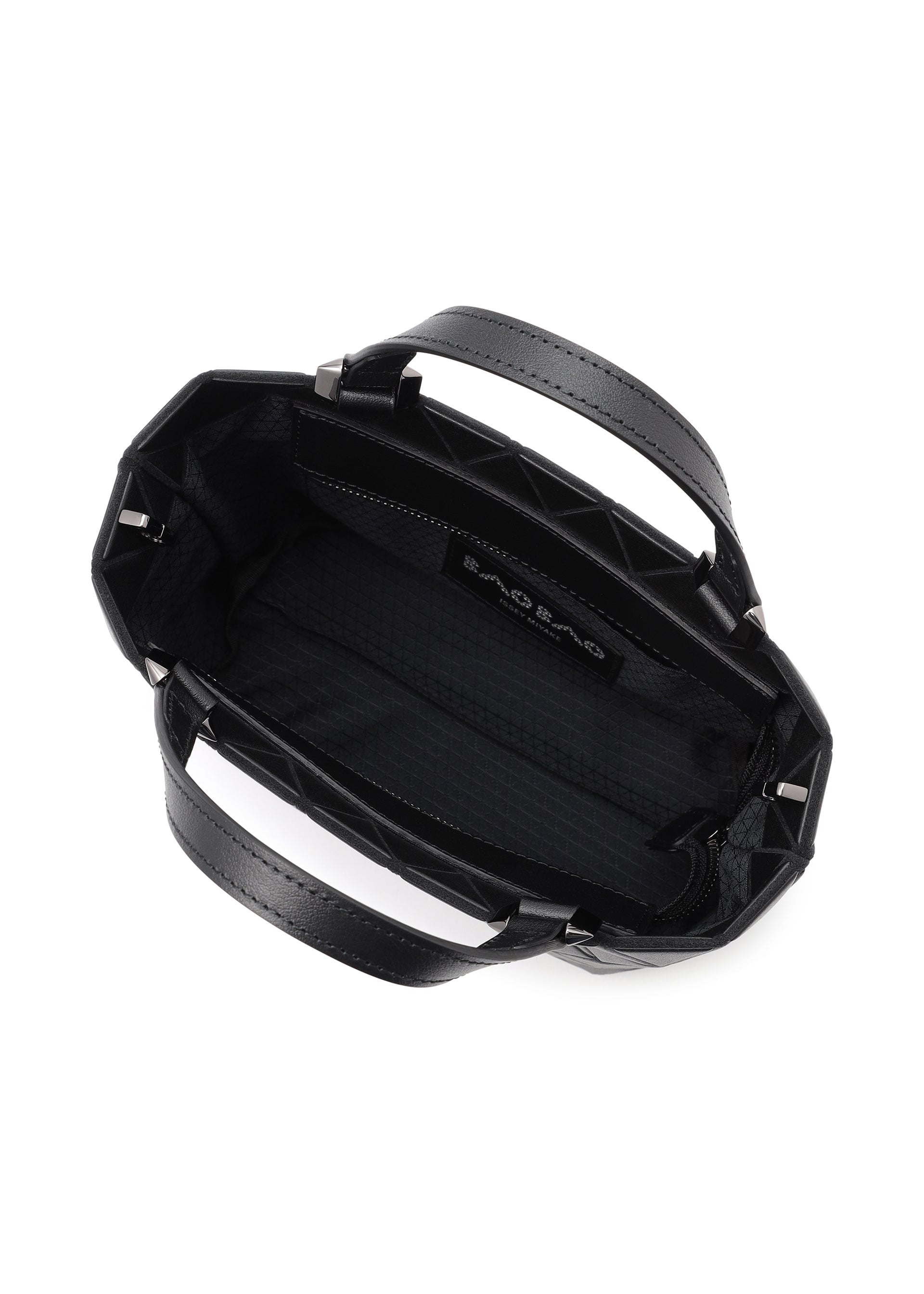 This chic mini handbag combines triangular pieces made from leather-like matte material with leather straps and handles. The straps are detachable. The two inside pockets are convenient for storing small items such as a card case and smartphone.