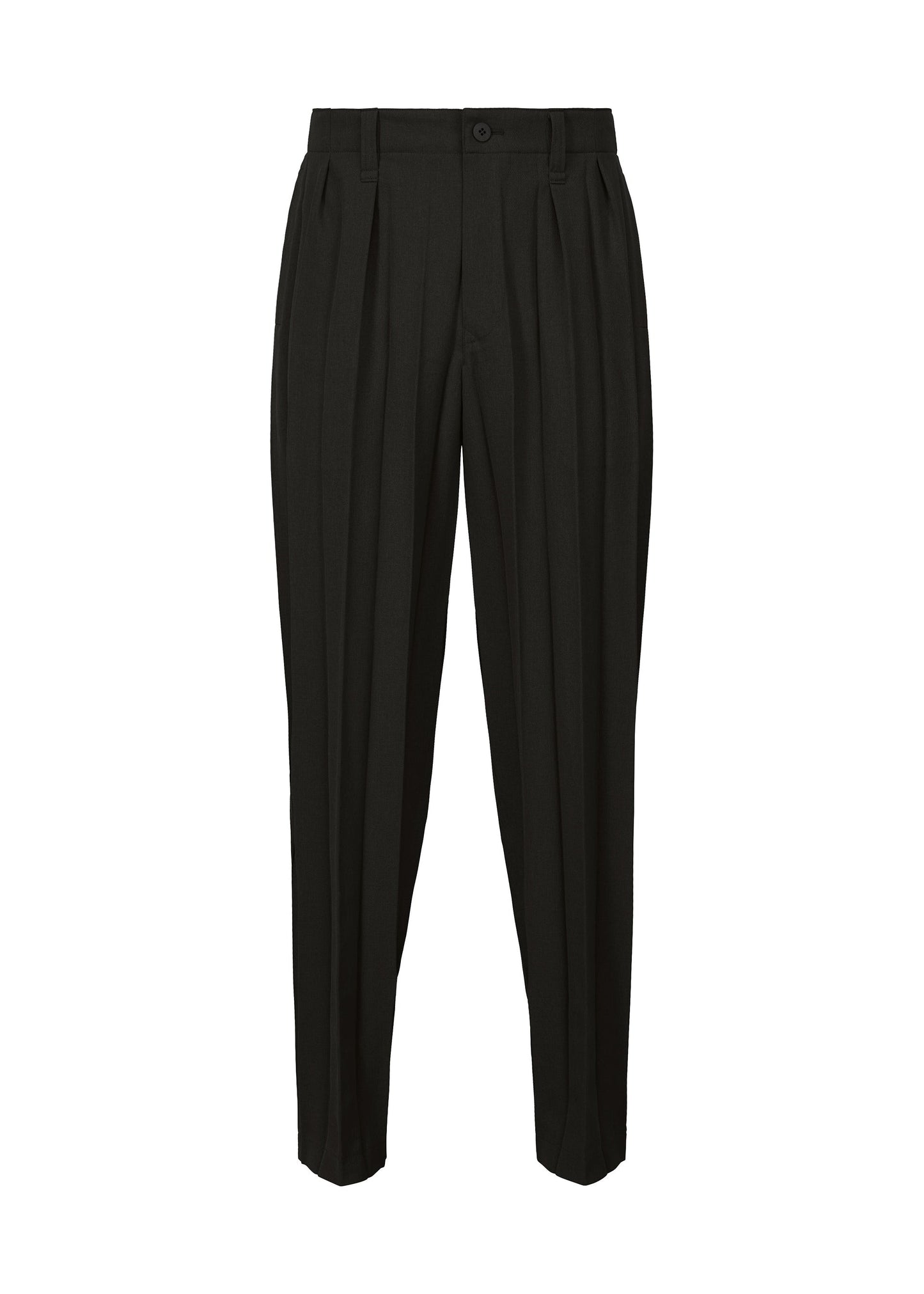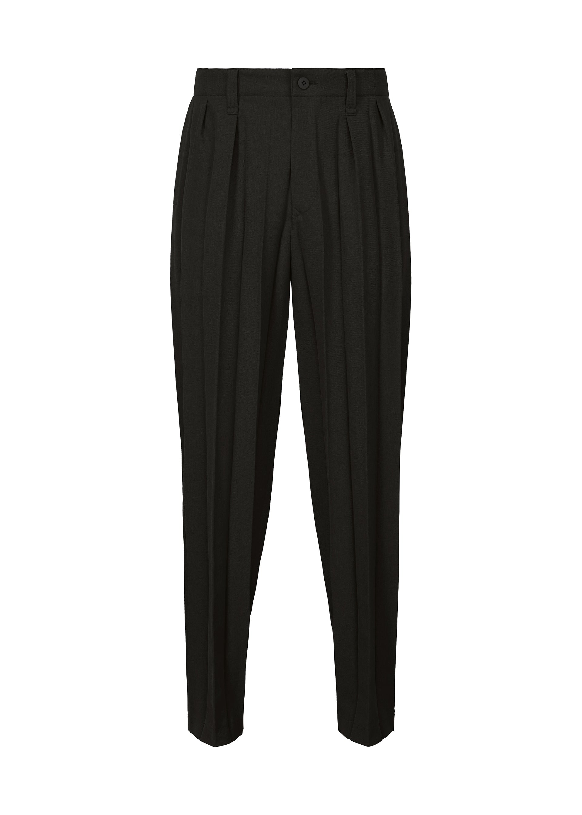 These tapered pants are made from glossy material with wide accordion pleats. They have pockets on both sides and belt loops at the waist. They have a button-fly design.