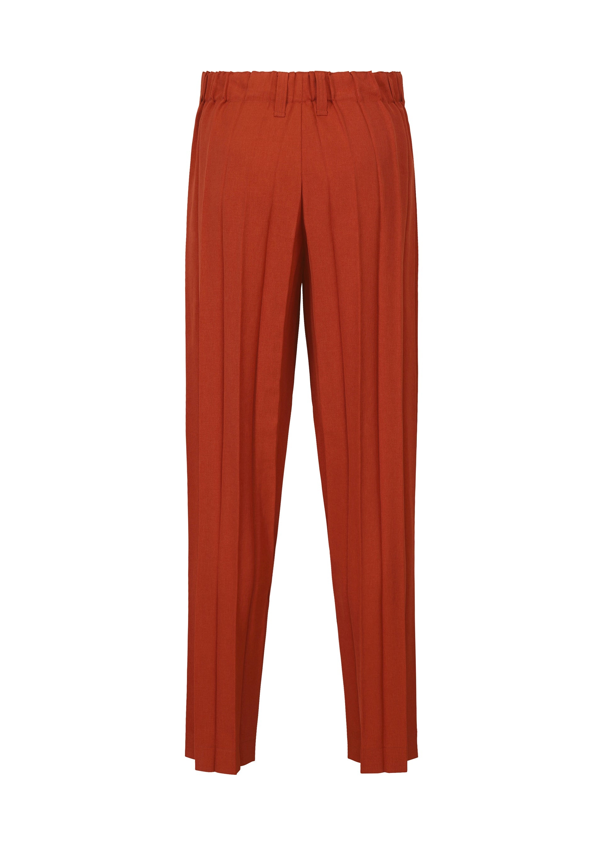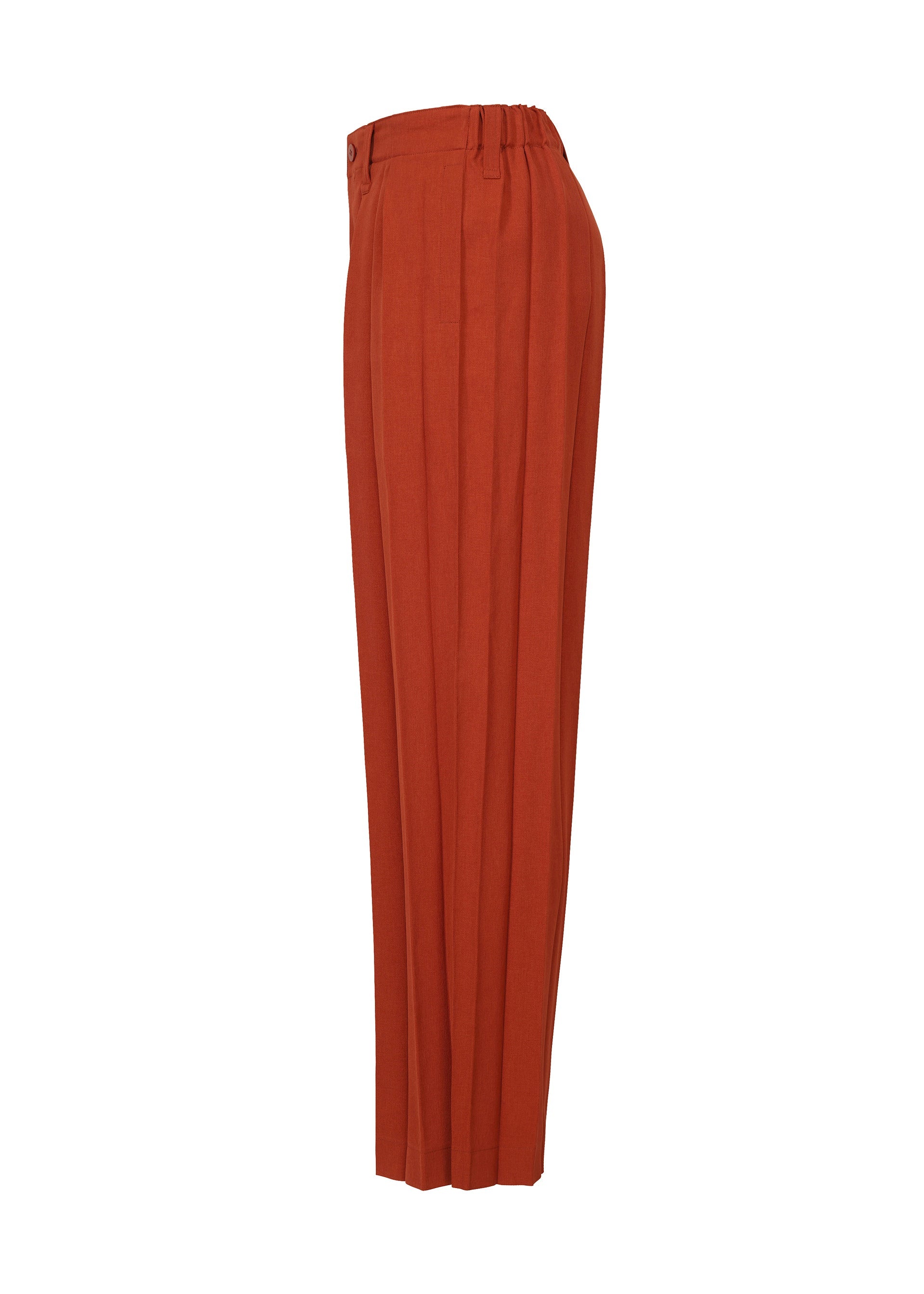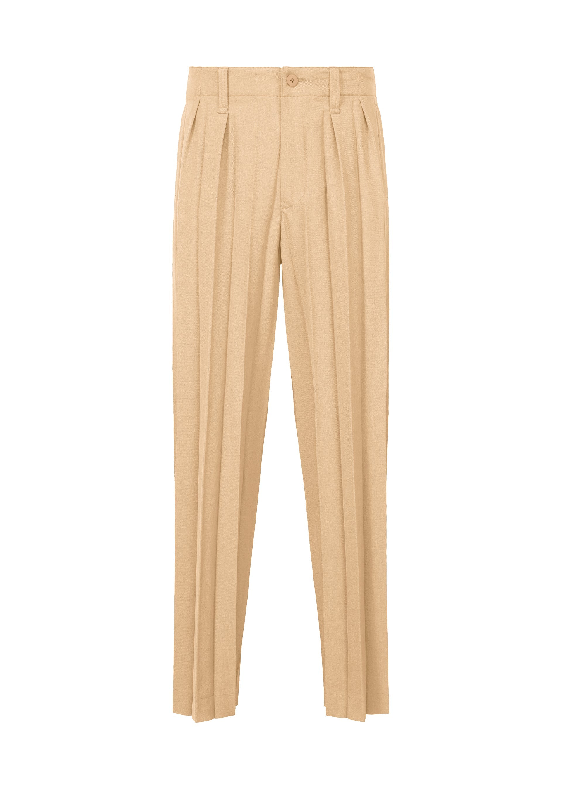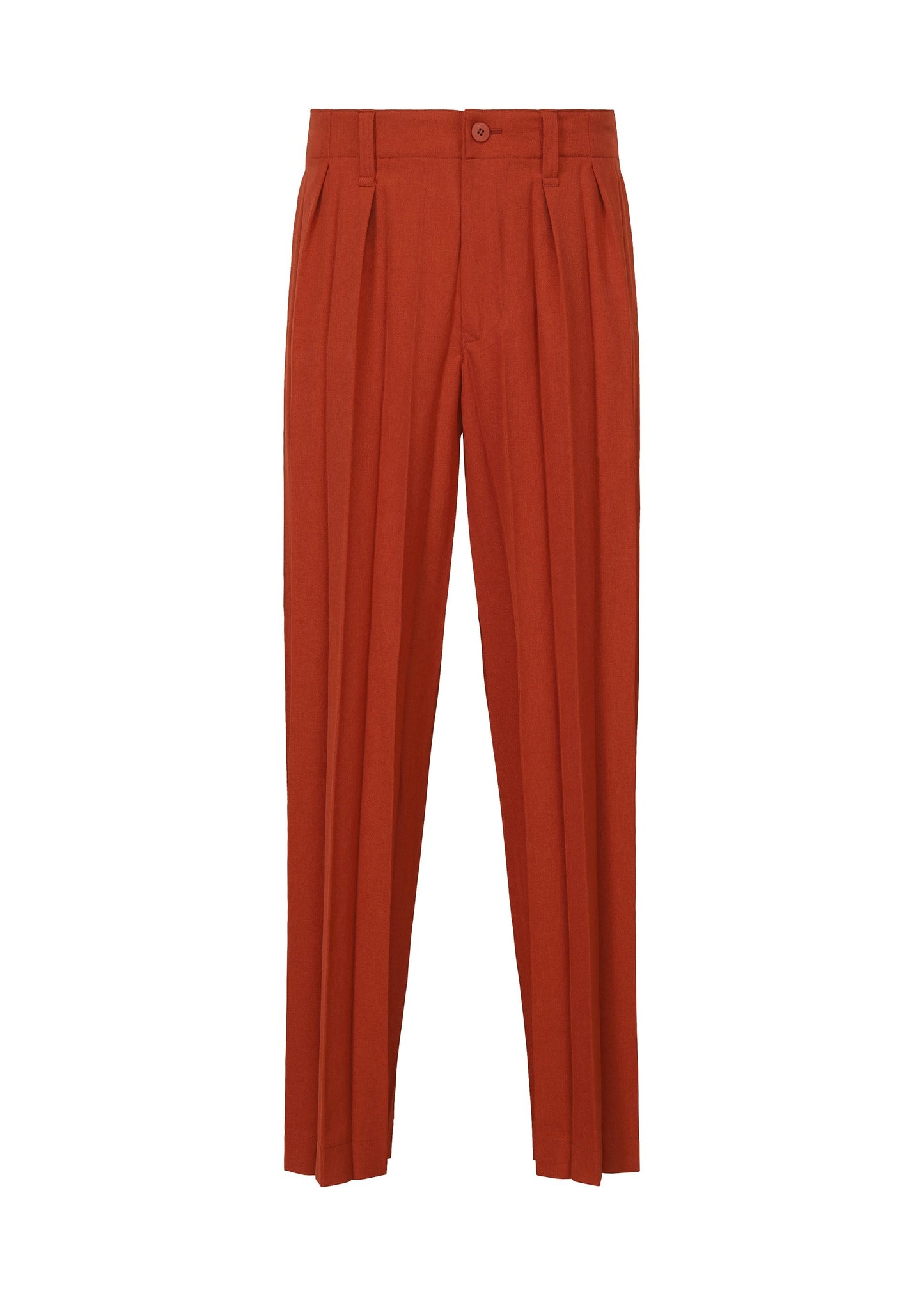 These straight pants are made from glossy material with wide accordion pleats. They have pockets on both sides, belt loops at the waist, and a button-fly design.