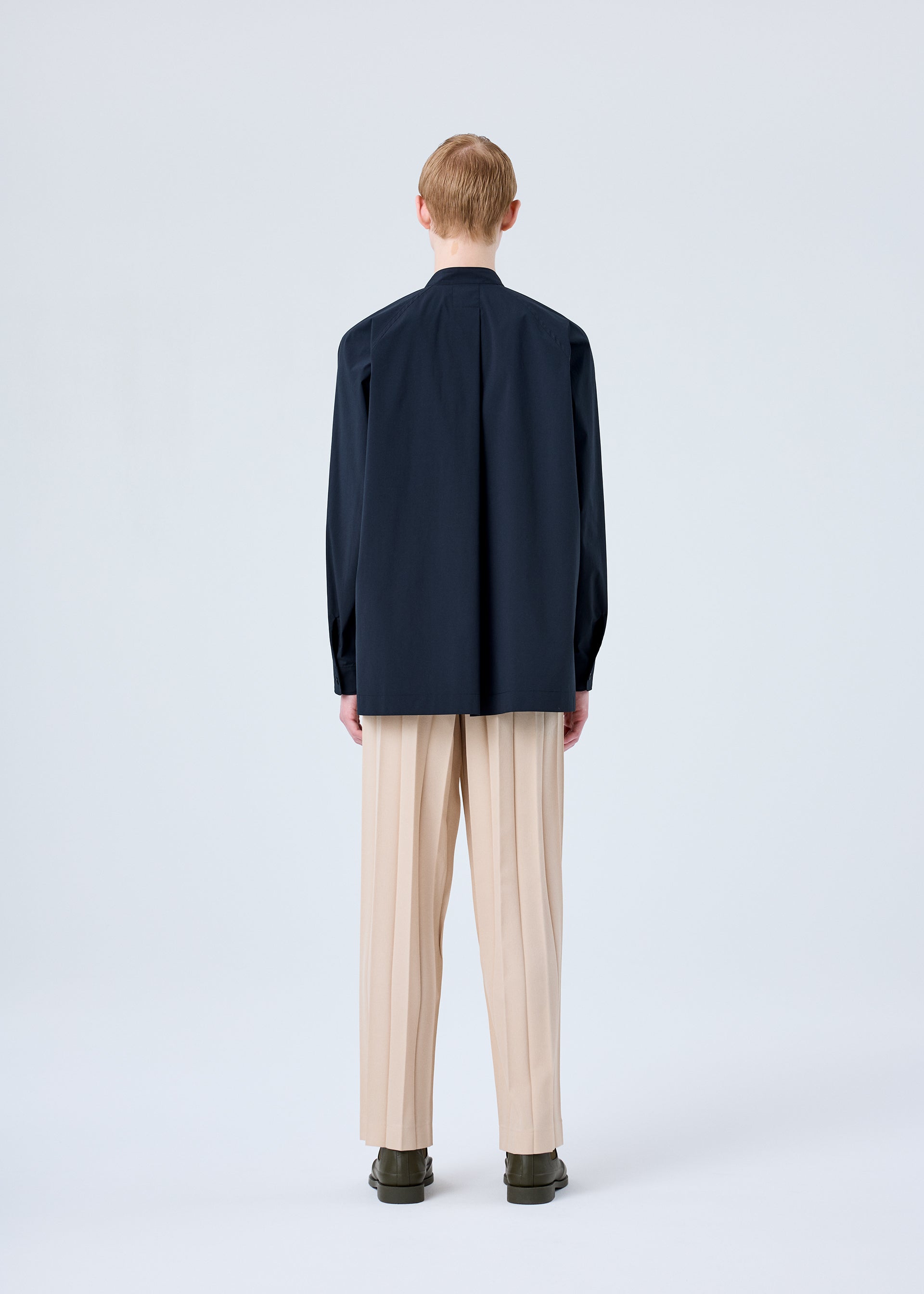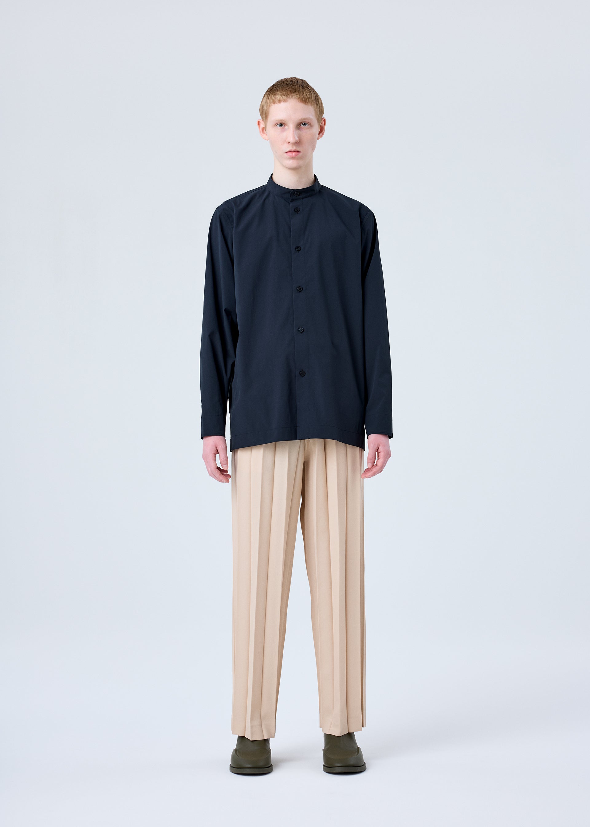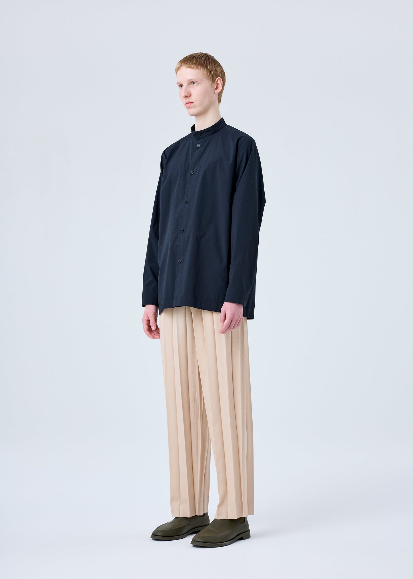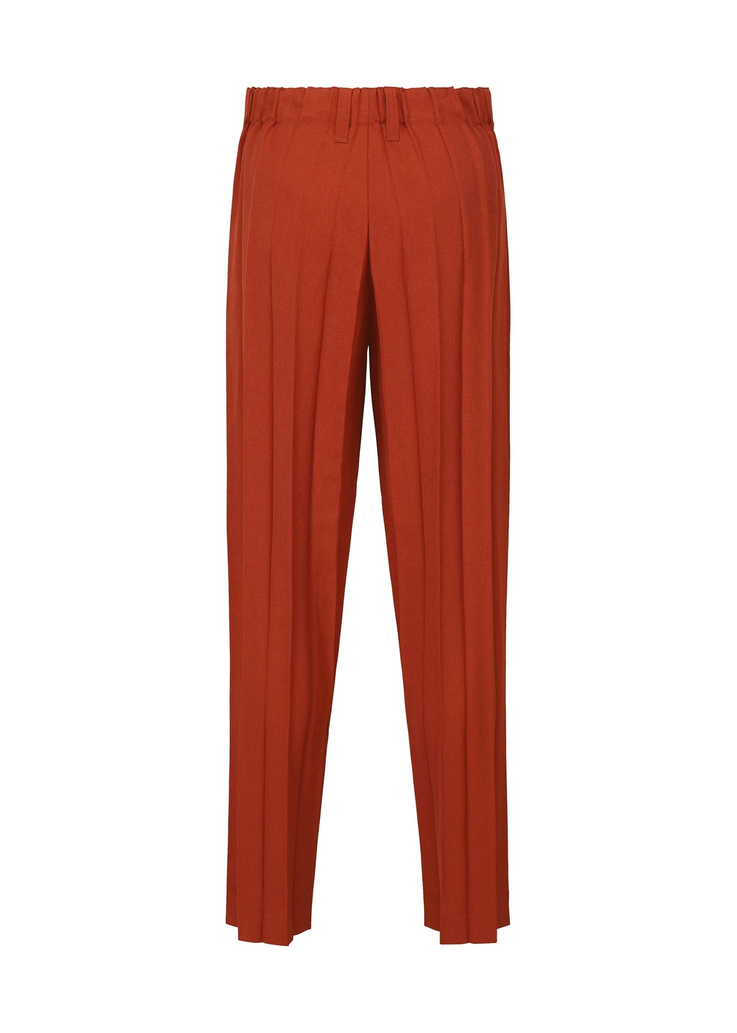 These straight pants are made from glossy material with wide accordion pleats. They have pockets on both sides, belt loops at the waist, and a button-fly design.