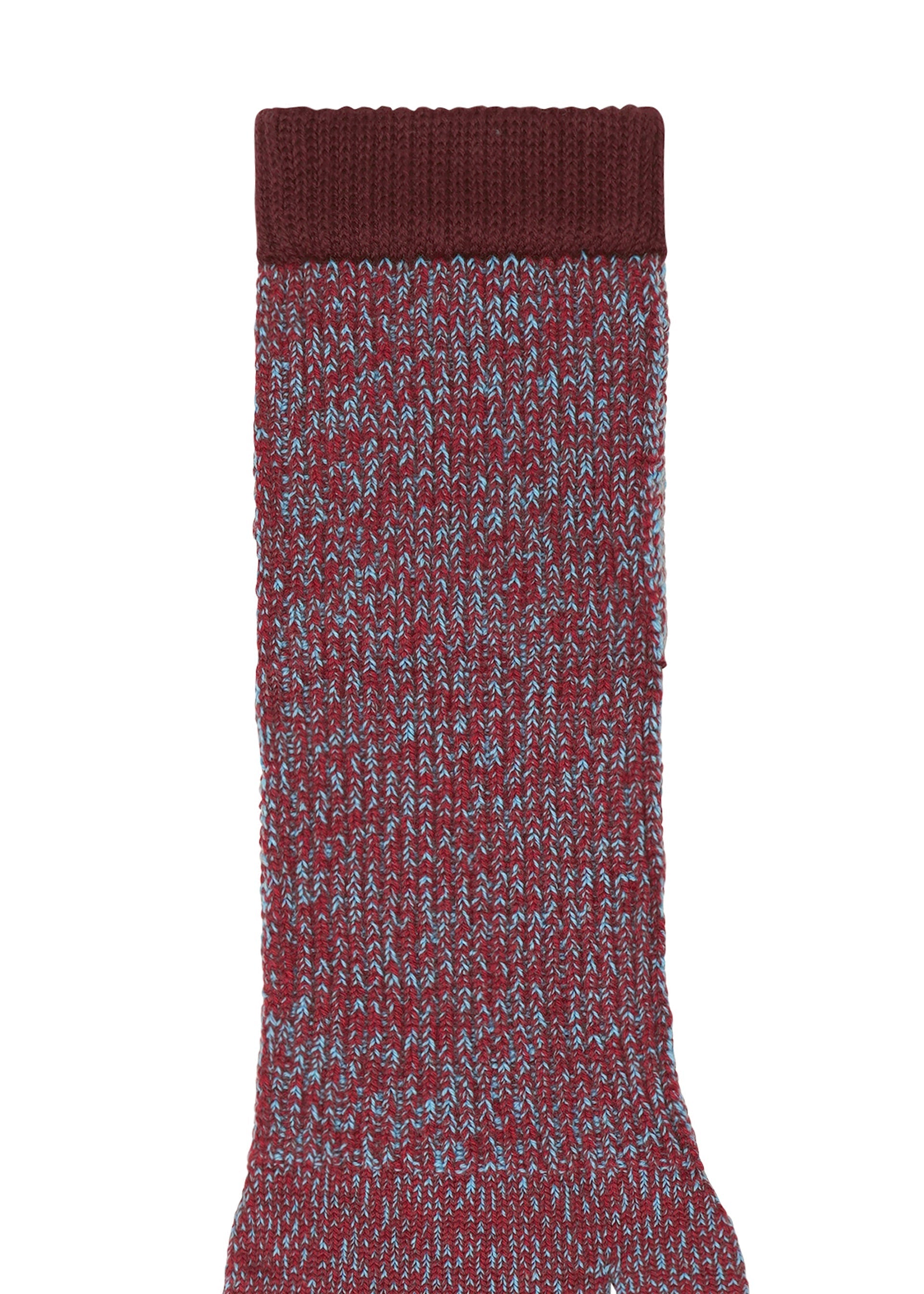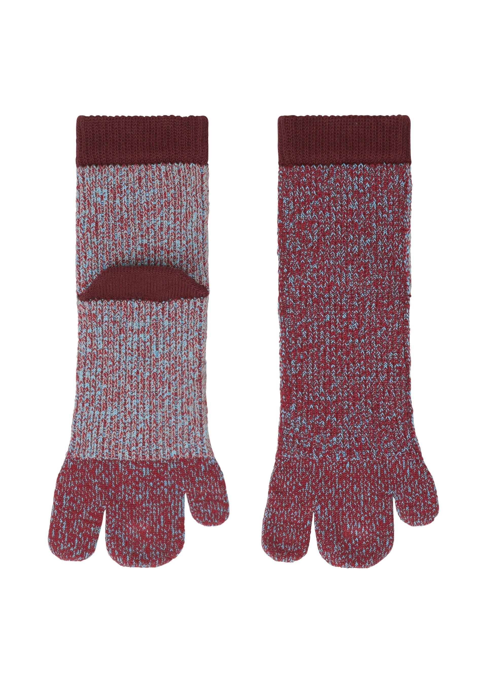 These socks with three areas for toes were inspired by the form of an artwork by designer/artist Ronan Bouroullec. The overlapping colors of the drawing are expressed using twisted threads.