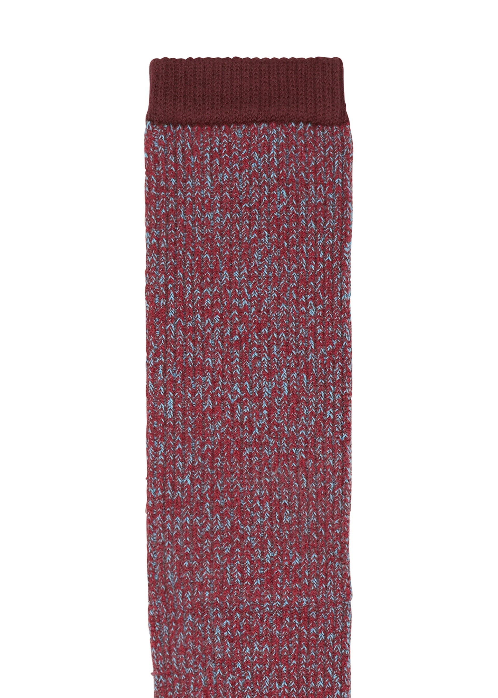 These socks with three areas for toes were inspired by the form of an artwork by designer/artist Ronan Bouroullec. The overlapping colors of the drawing are expressed using twisted threads.