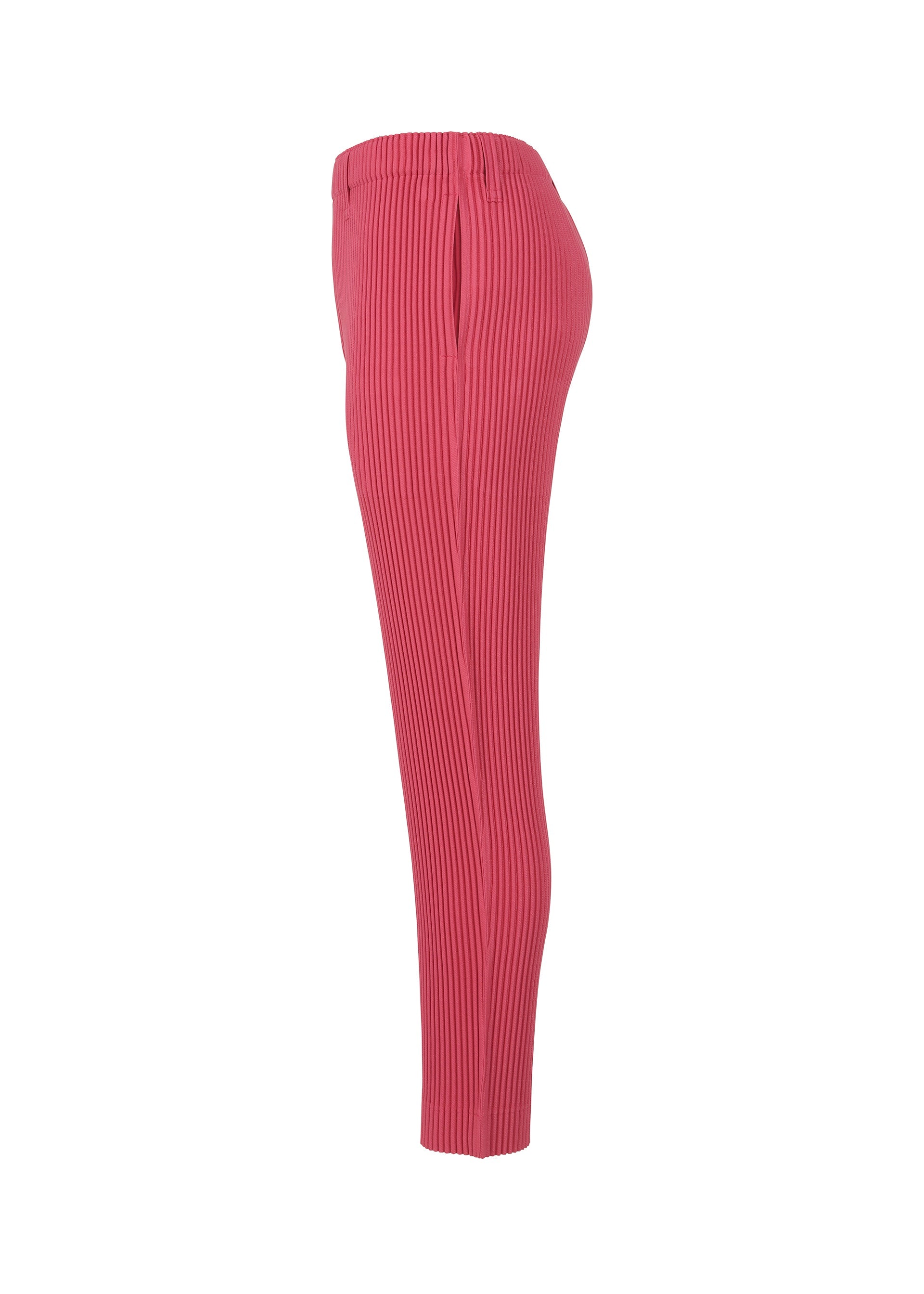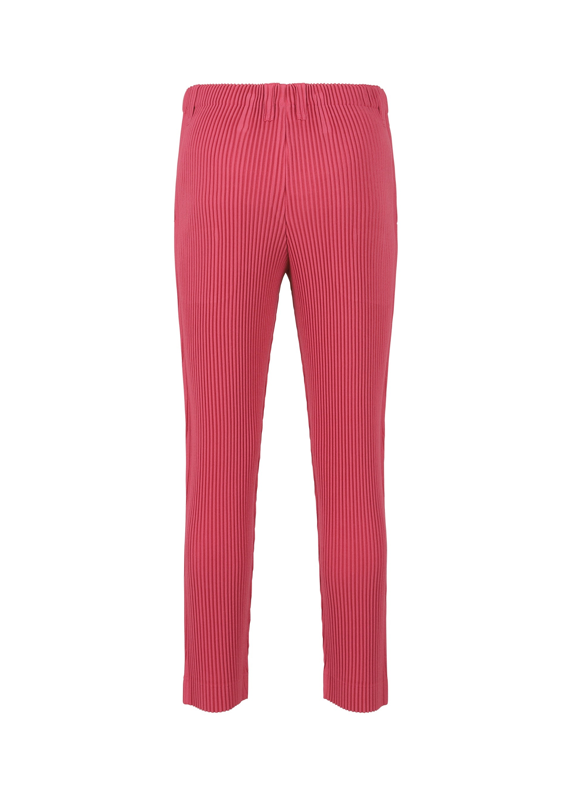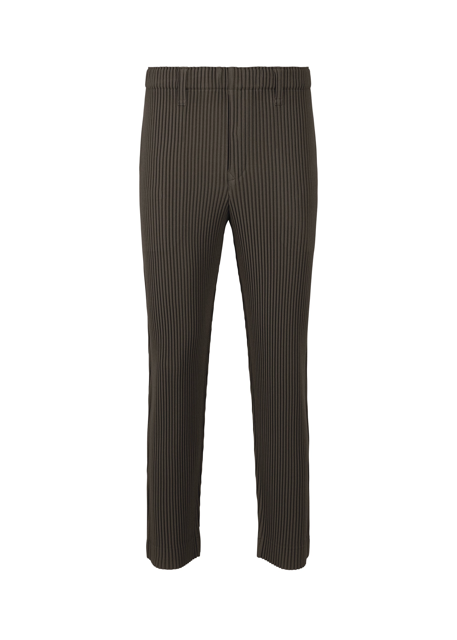 These thin, straight pants are made using material that resembles kersey (twill) with three-dimensional, diagonal ribbing. They are characterized by the thin, light feel of the material despite its wool-like fluffiness. They have pockets on both sides and belt loops at the waist. They have a button-fly design.