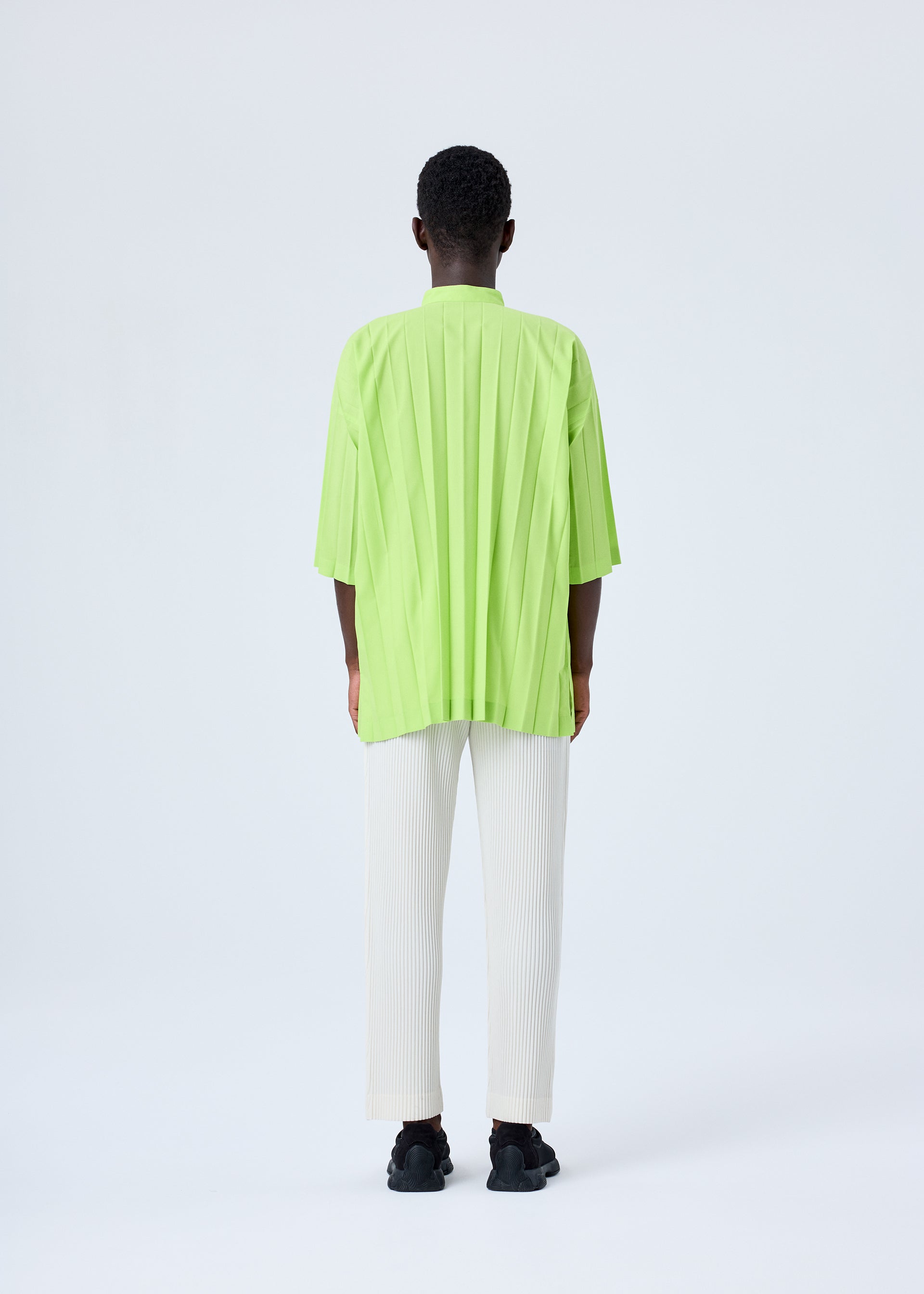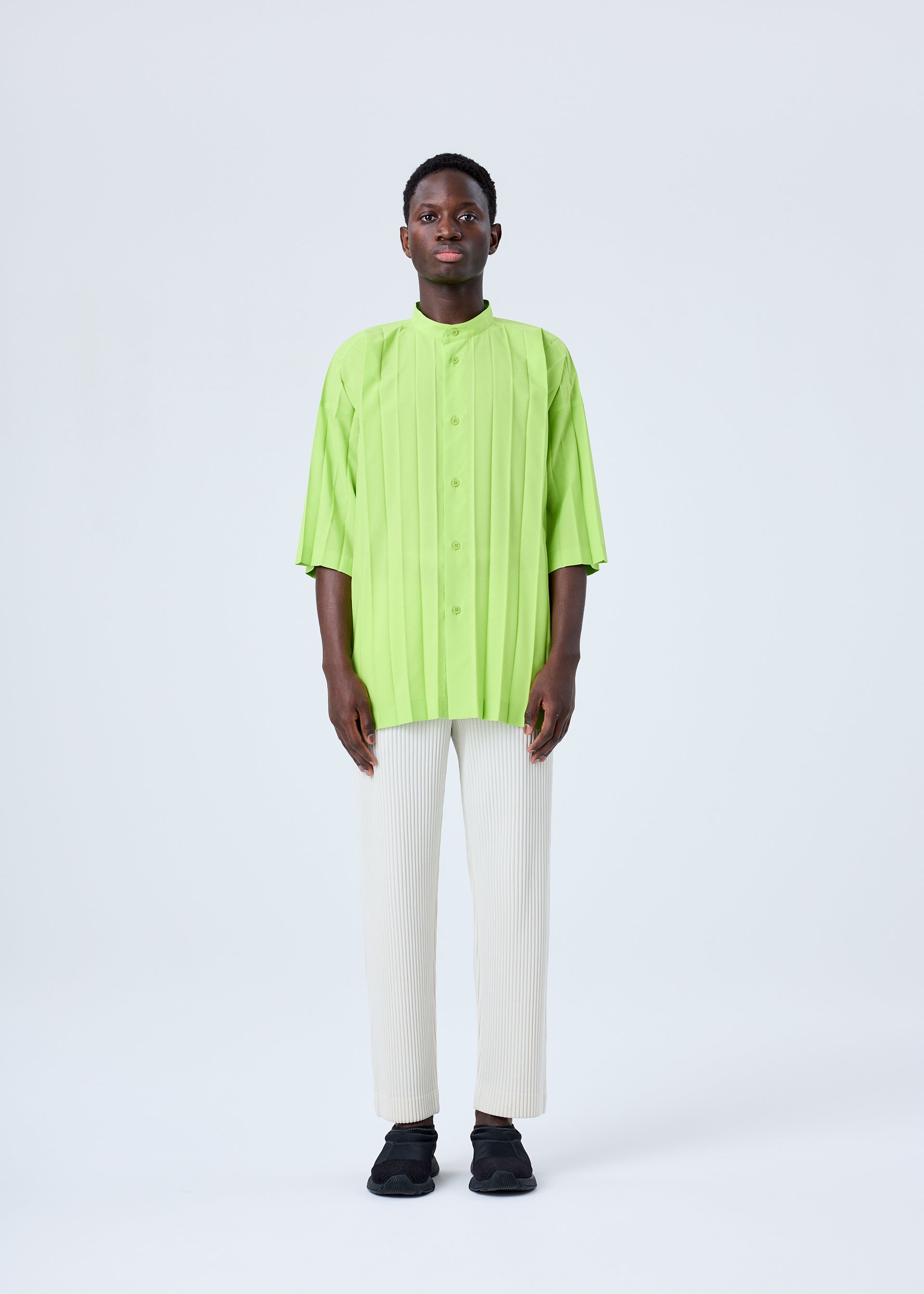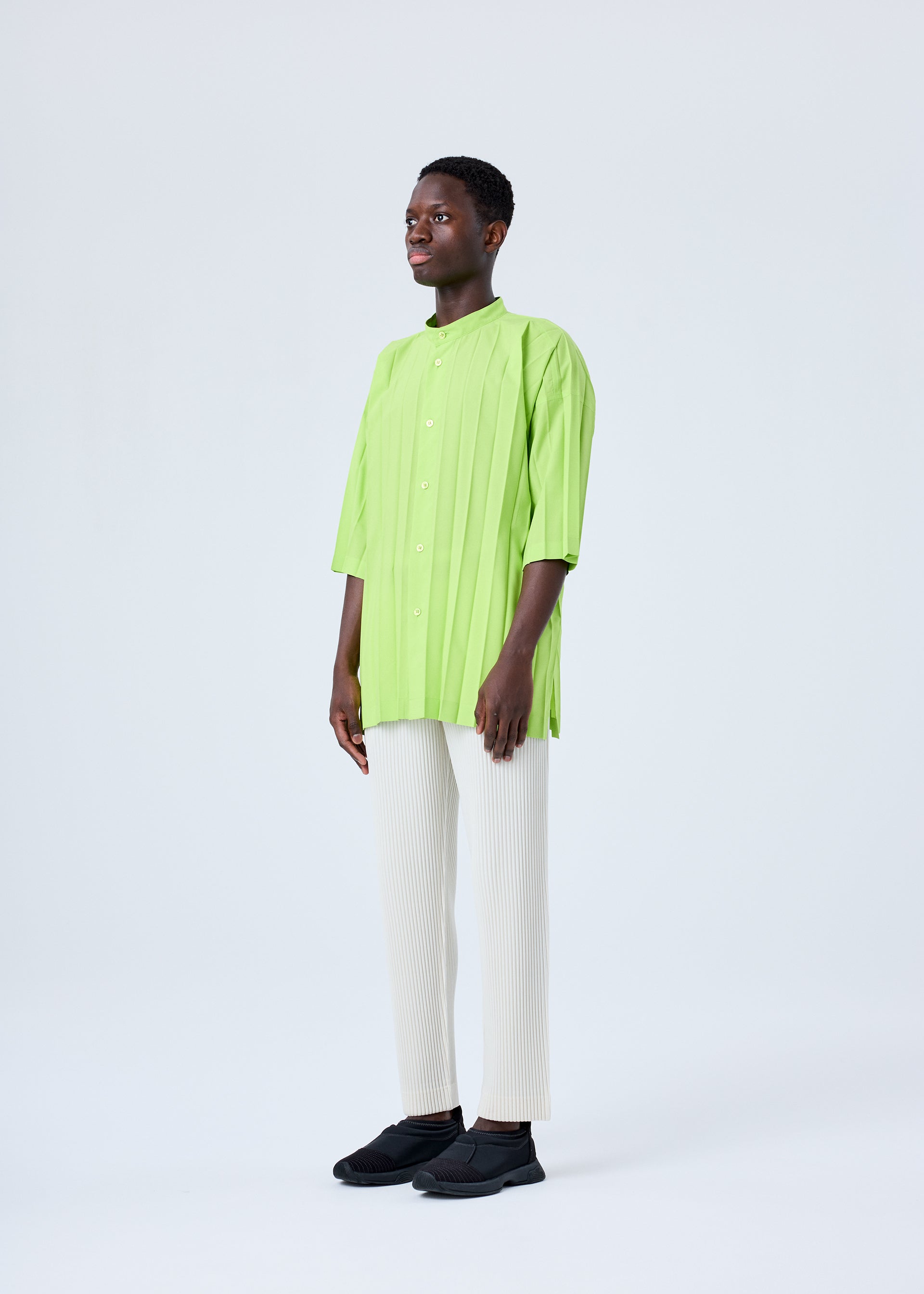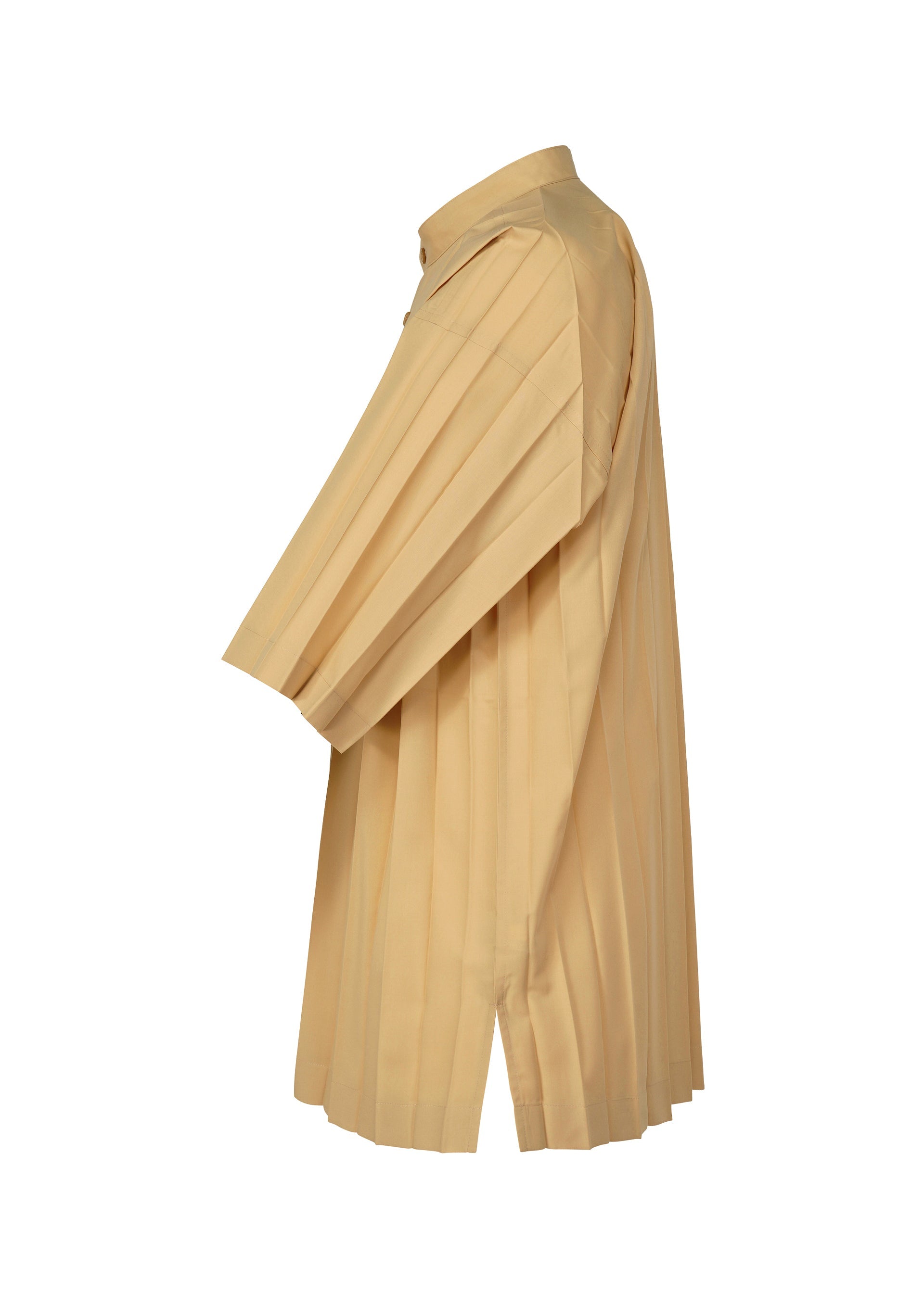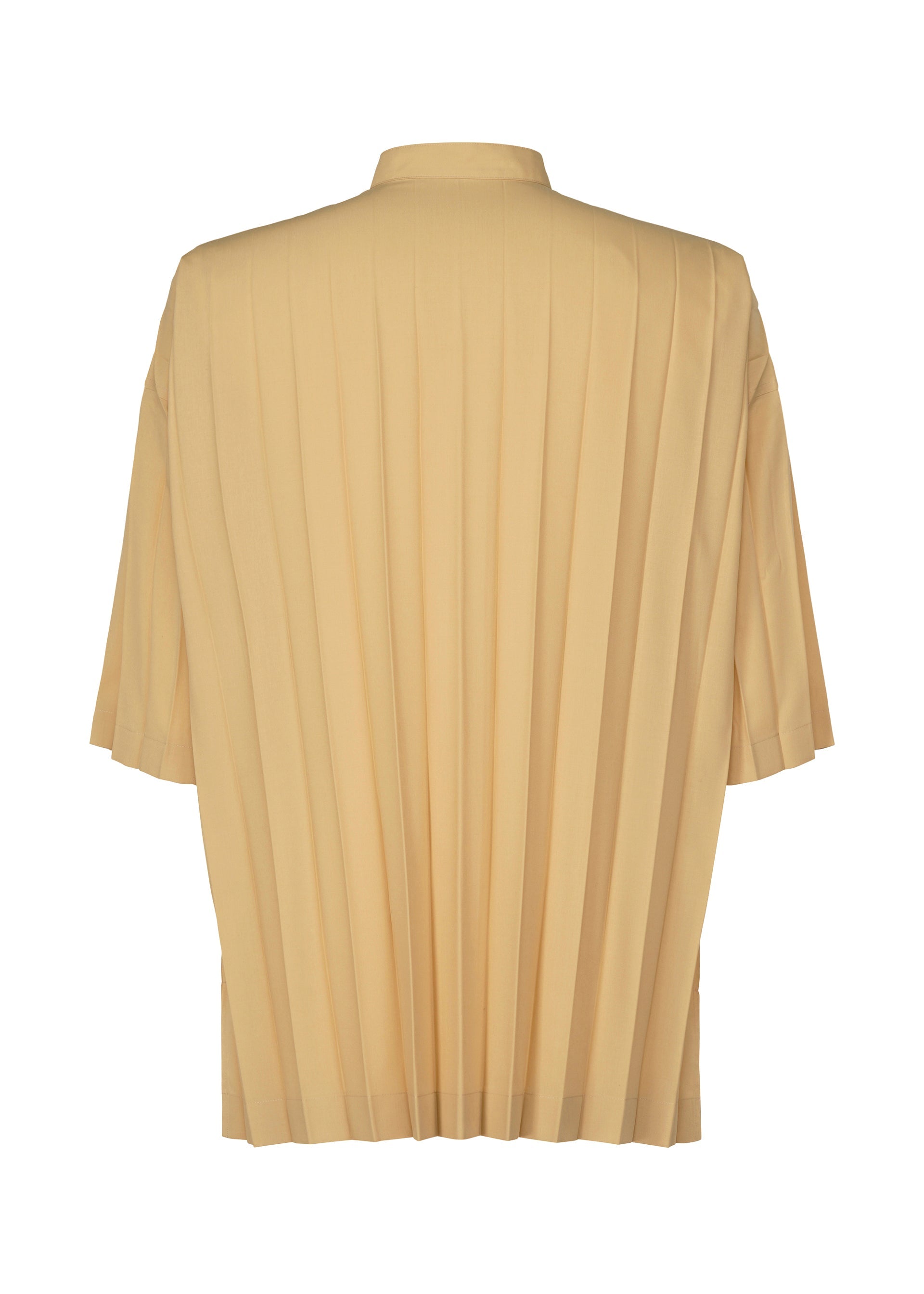 This short-sleeved shirt with a standing collar is made from thin, hand-pleated polyester fabric. It has slits on both sides.