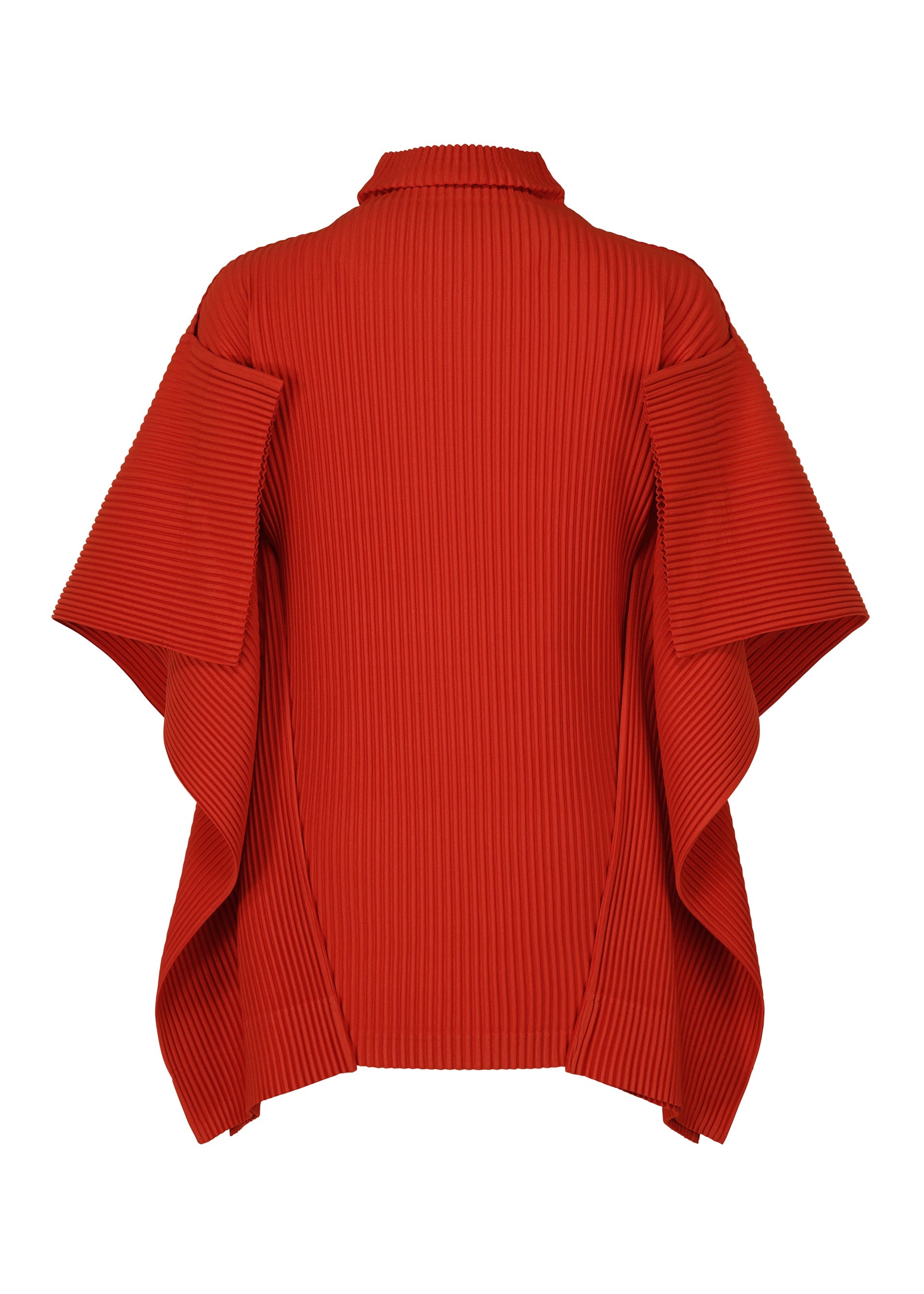 This pleated shirt has a slim fit with dramatic draped three-quarter length sleeves and a high neck.
