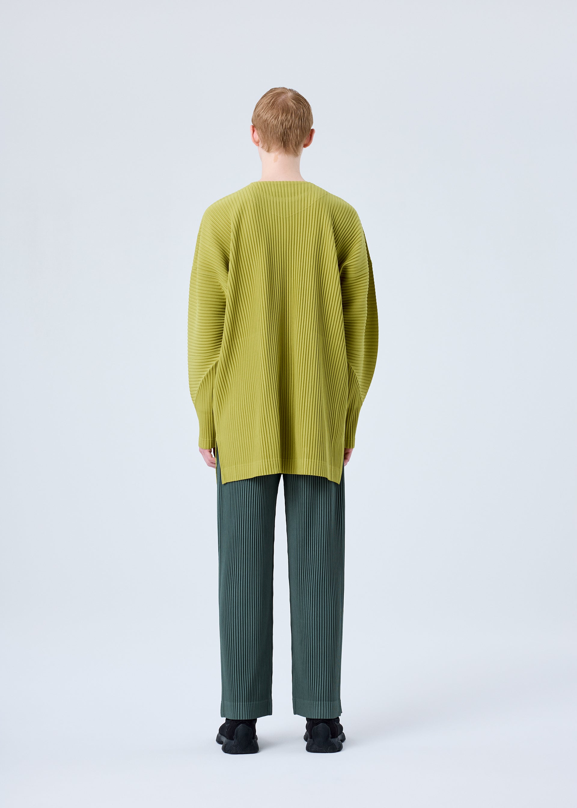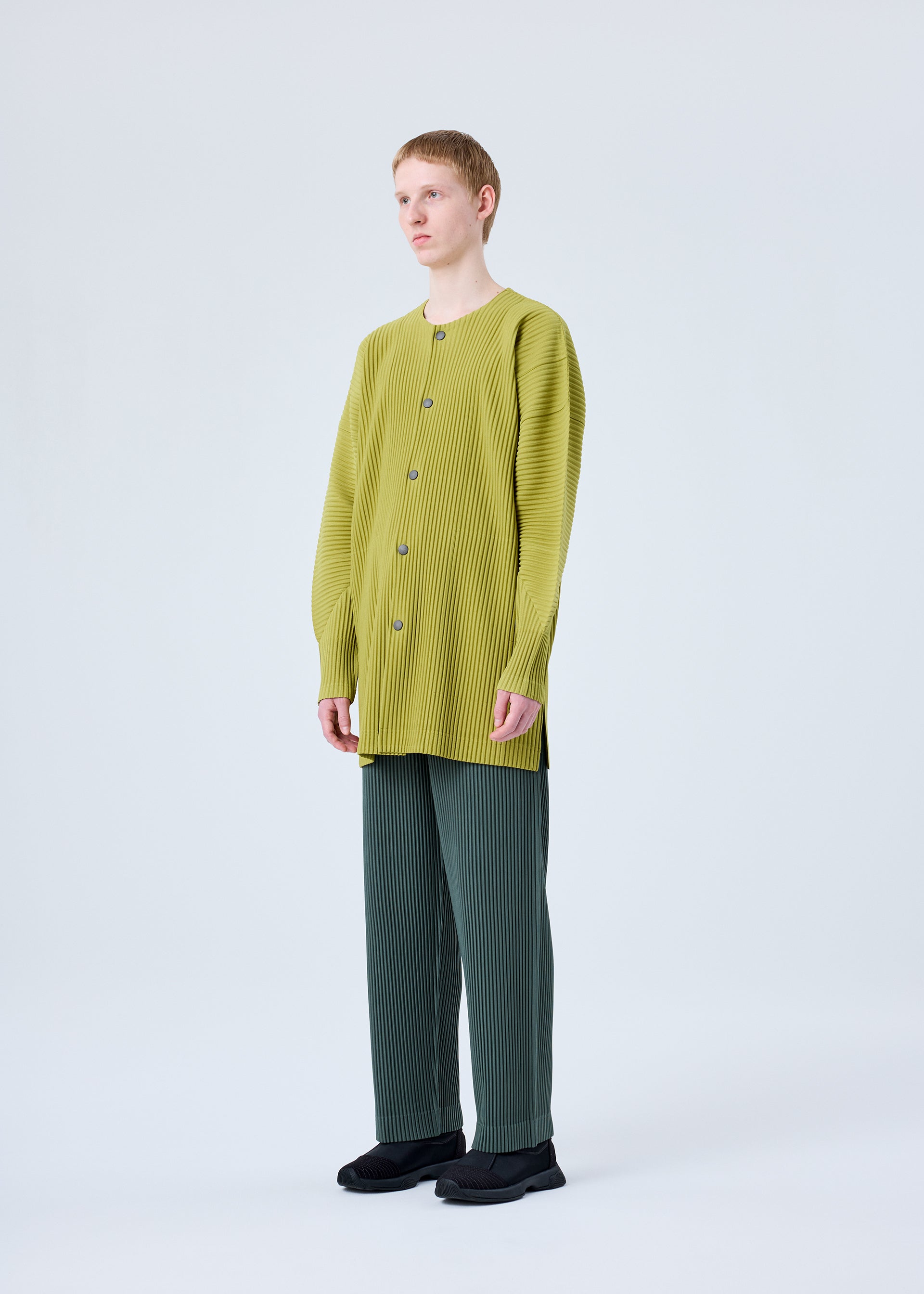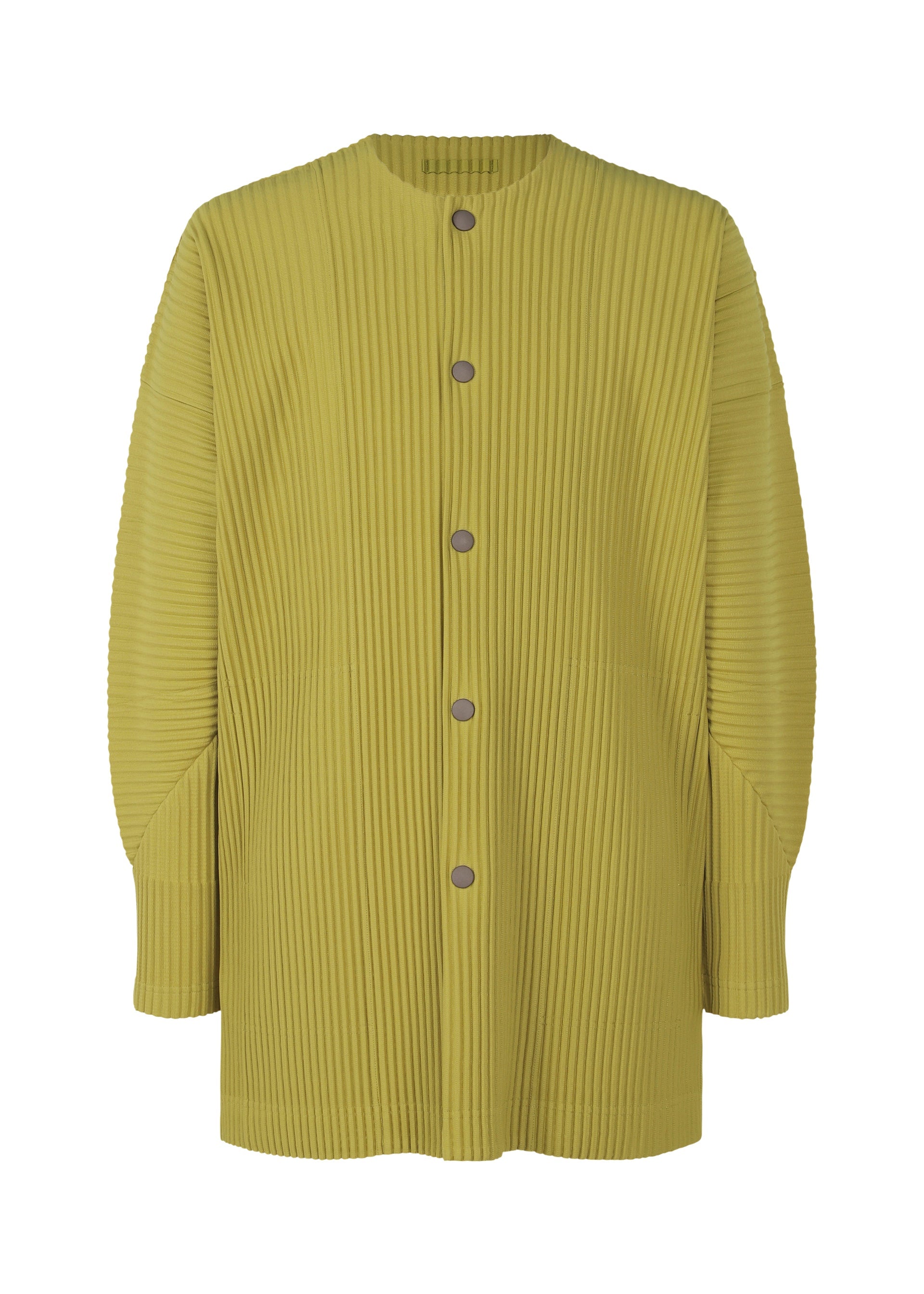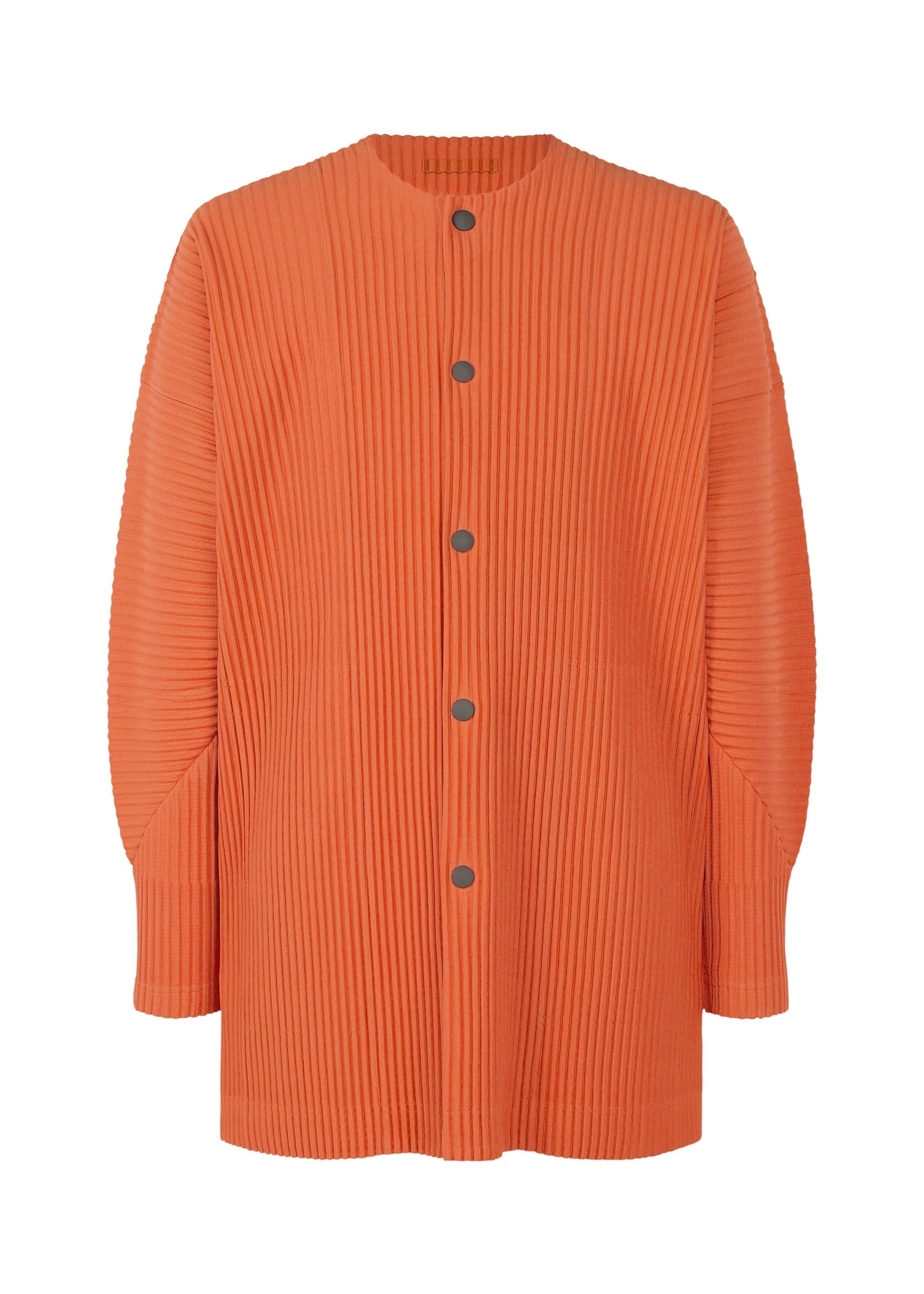 This collarless jacket is available in warm color tones. It has pockets and slits on both sides.