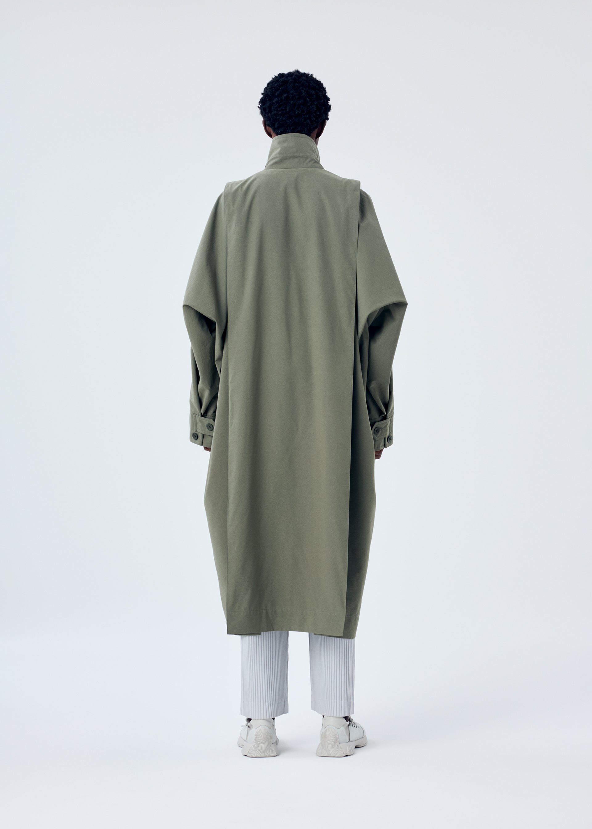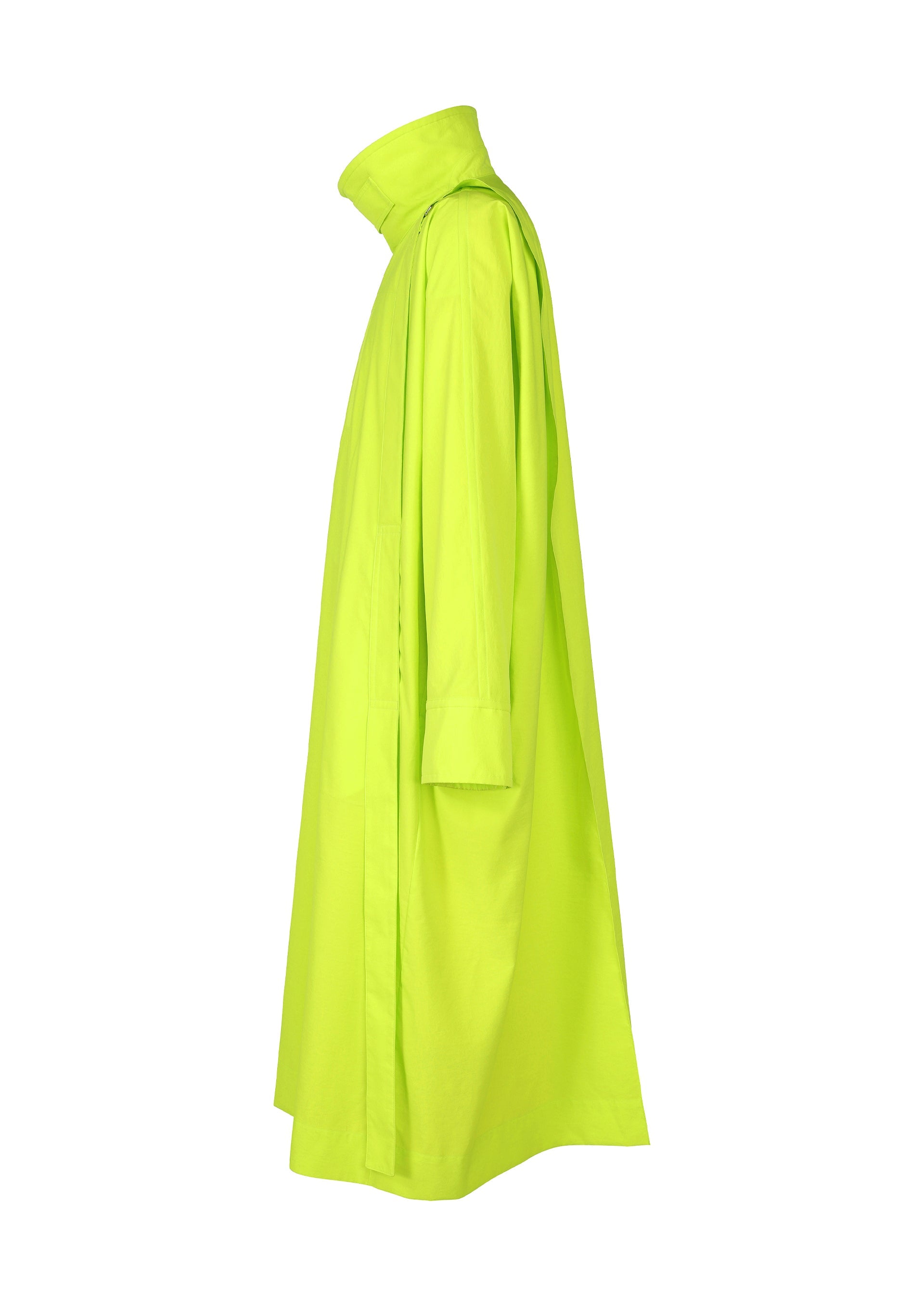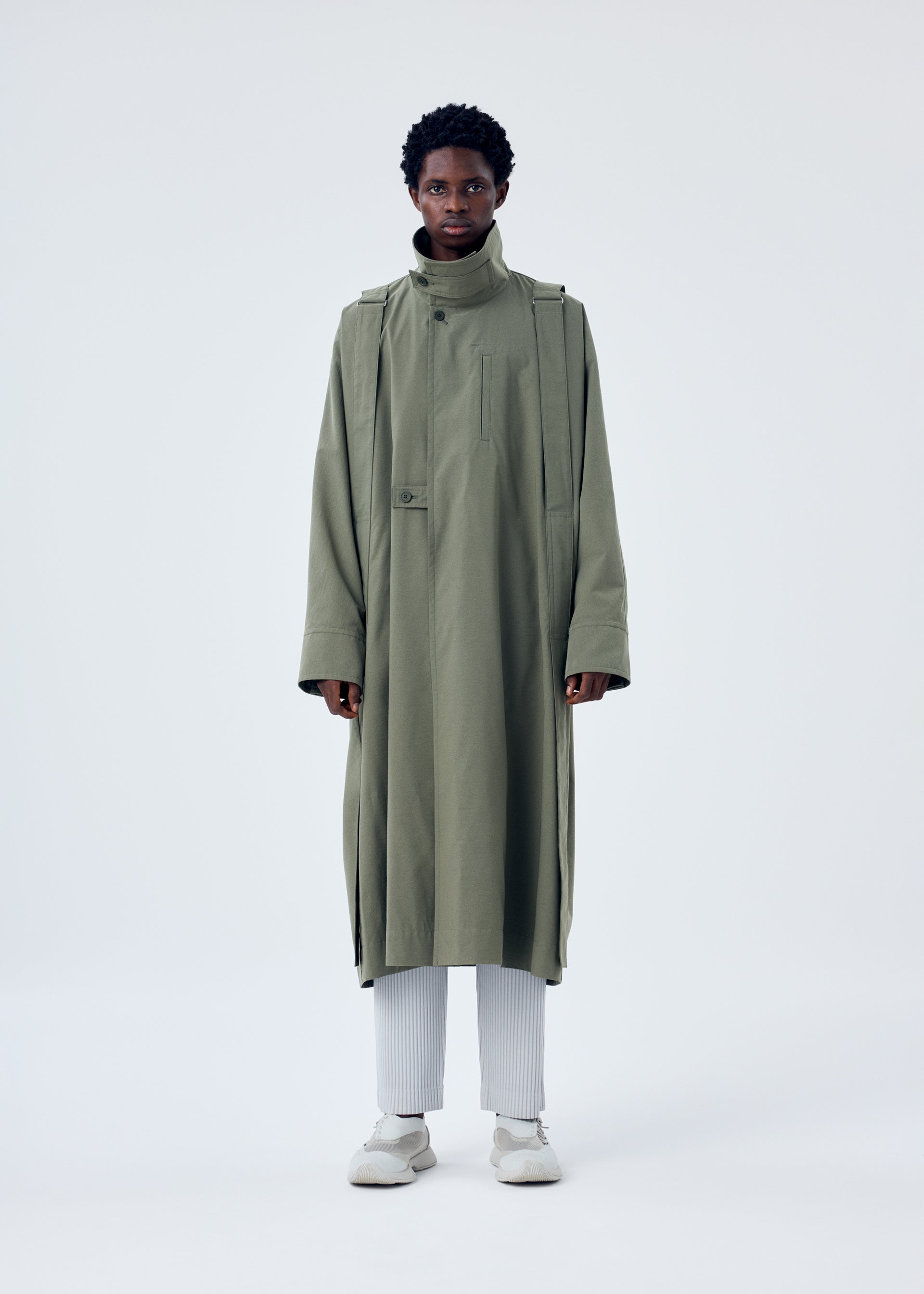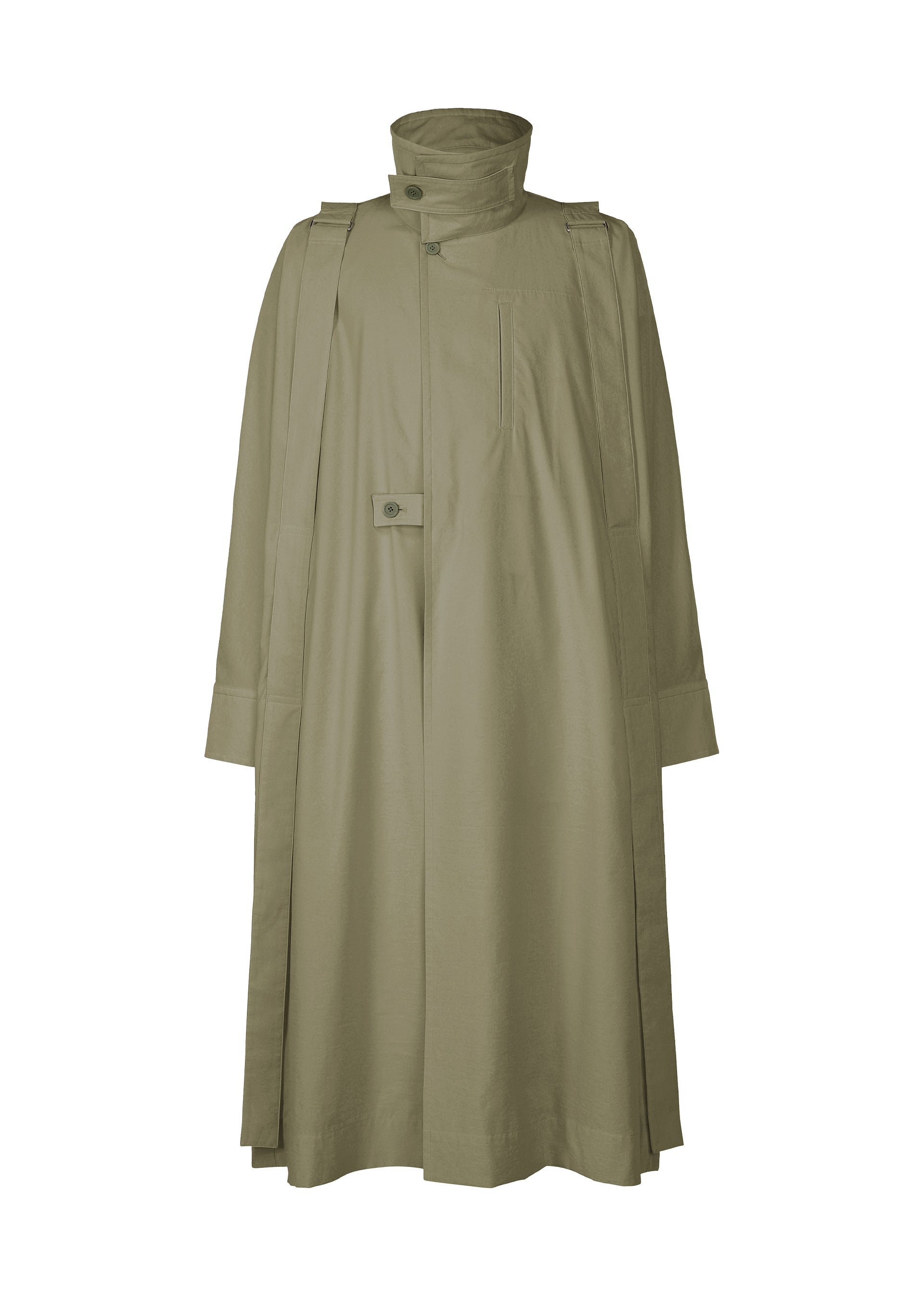 This long coat is inspired by wearing a parachute. The shoulder straps, resembling a harness, give the look of preparing to leap. The design is crafted to allow air to flow through it when worn, just like a parachute. It can be compactly rolled up and secured with the inner strap for easy portable functionality. It has pockets on both sides, a left chest pocket, and inner pockets.
