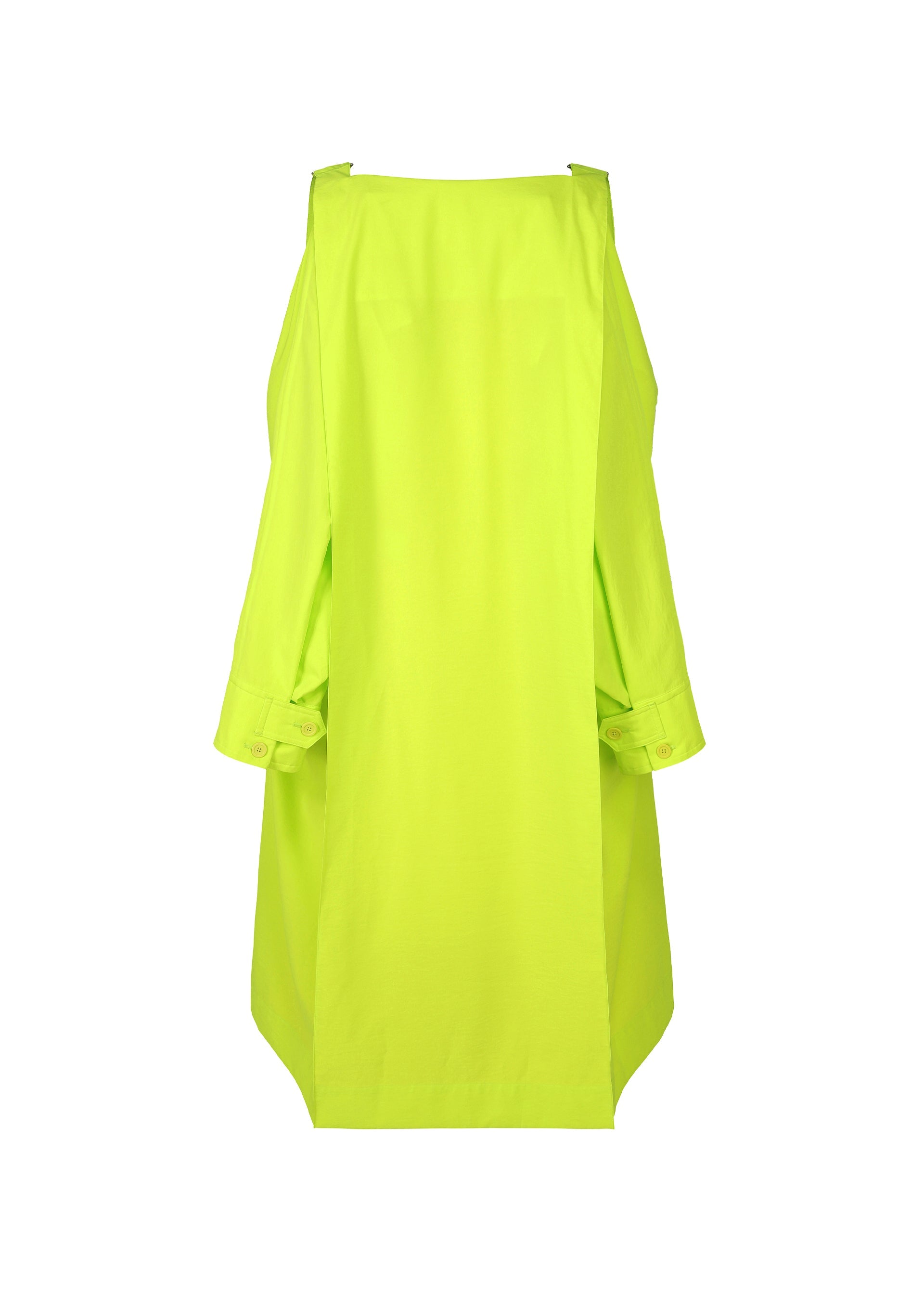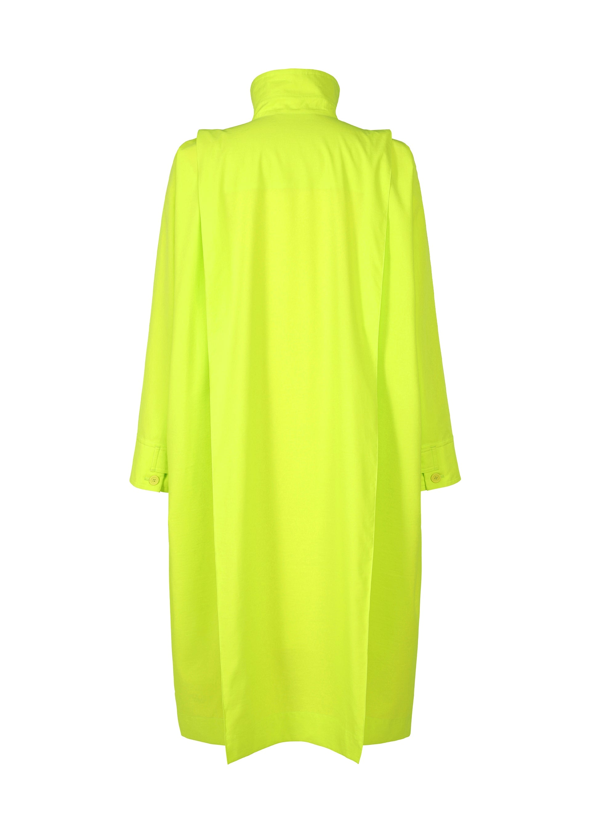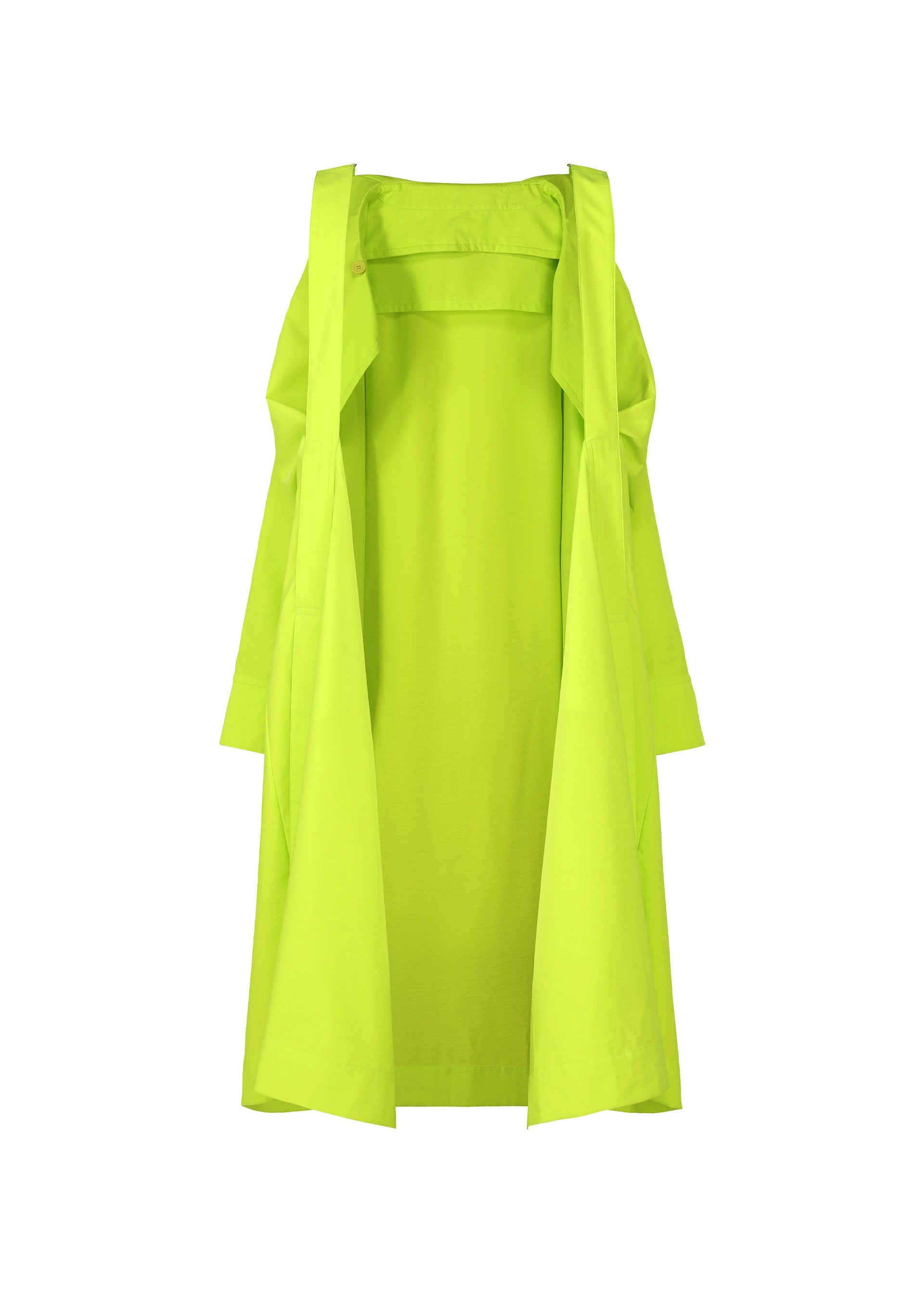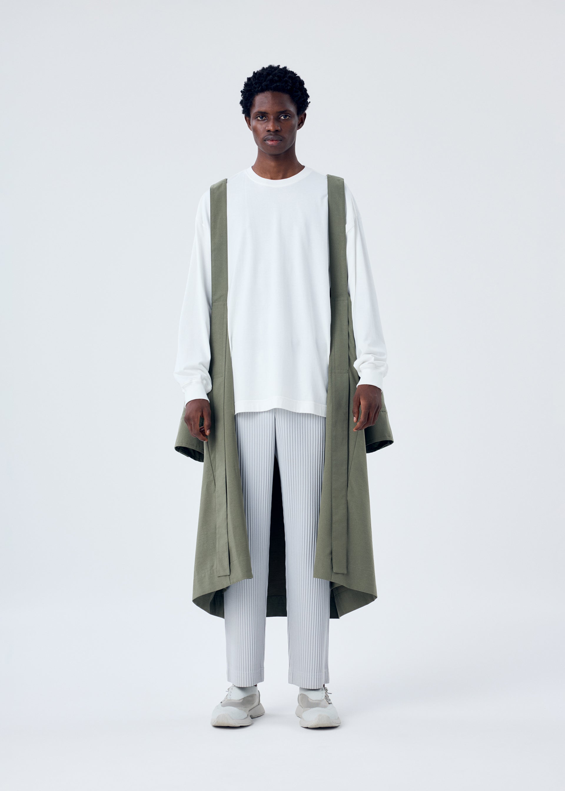 This long coat is inspired by wearing a parachute. The shoulder straps, resembling a harness, give the look of preparing to leap. The design is crafted to allow air to flow through it when worn, just like a parachute. It can be compactly rolled up and secured with the inner strap for easy portable functionality. It has pockets on both sides, a left chest pocket, and inner pockets.
