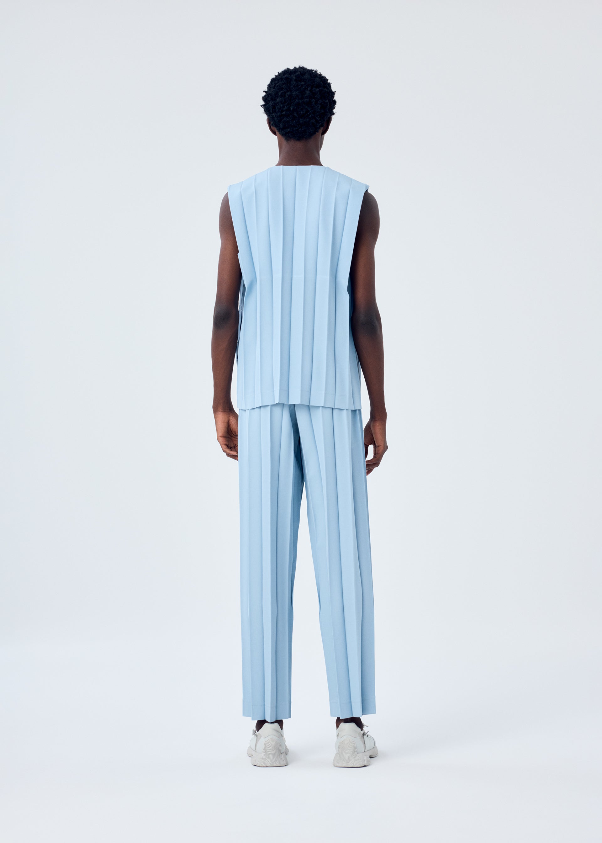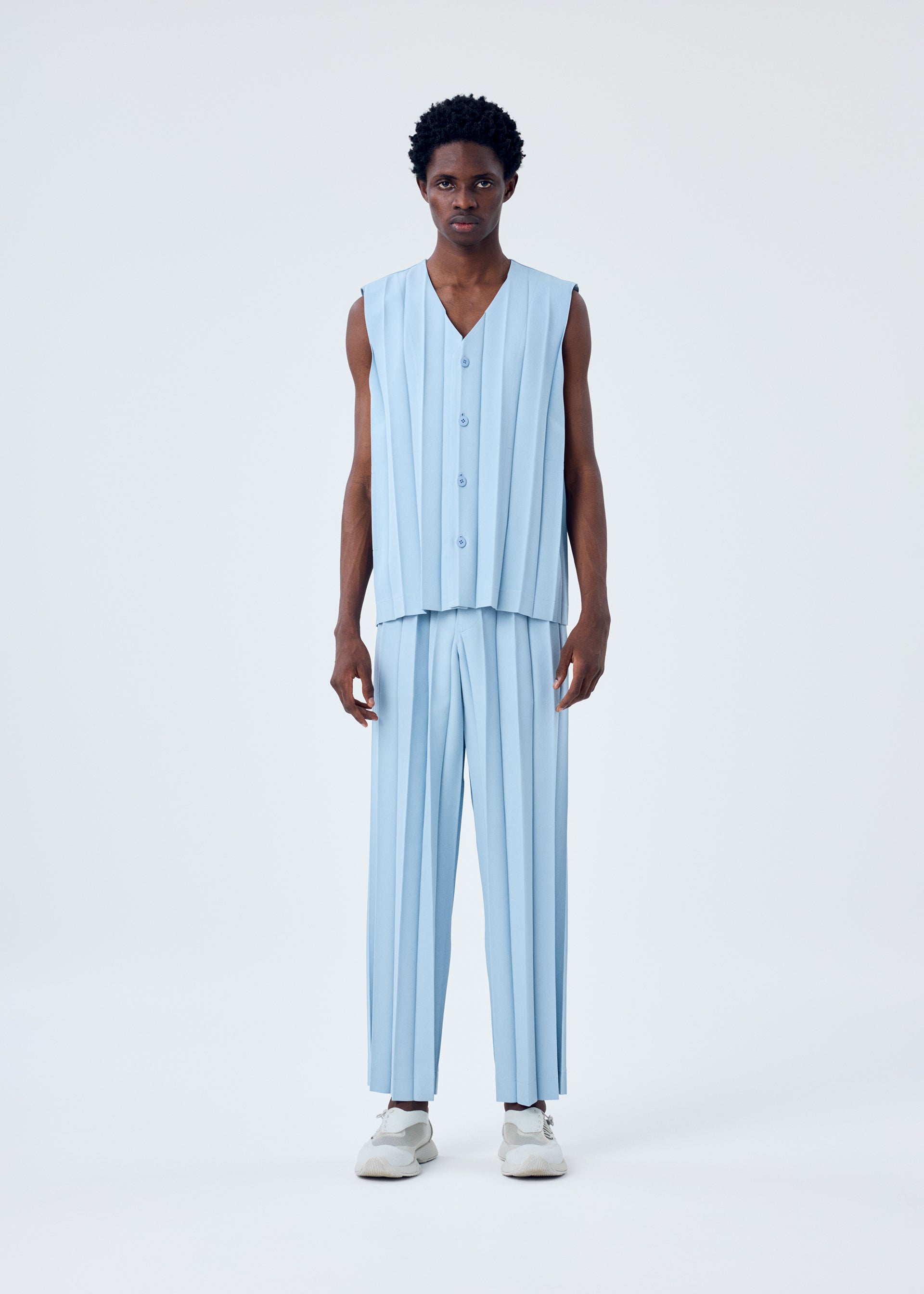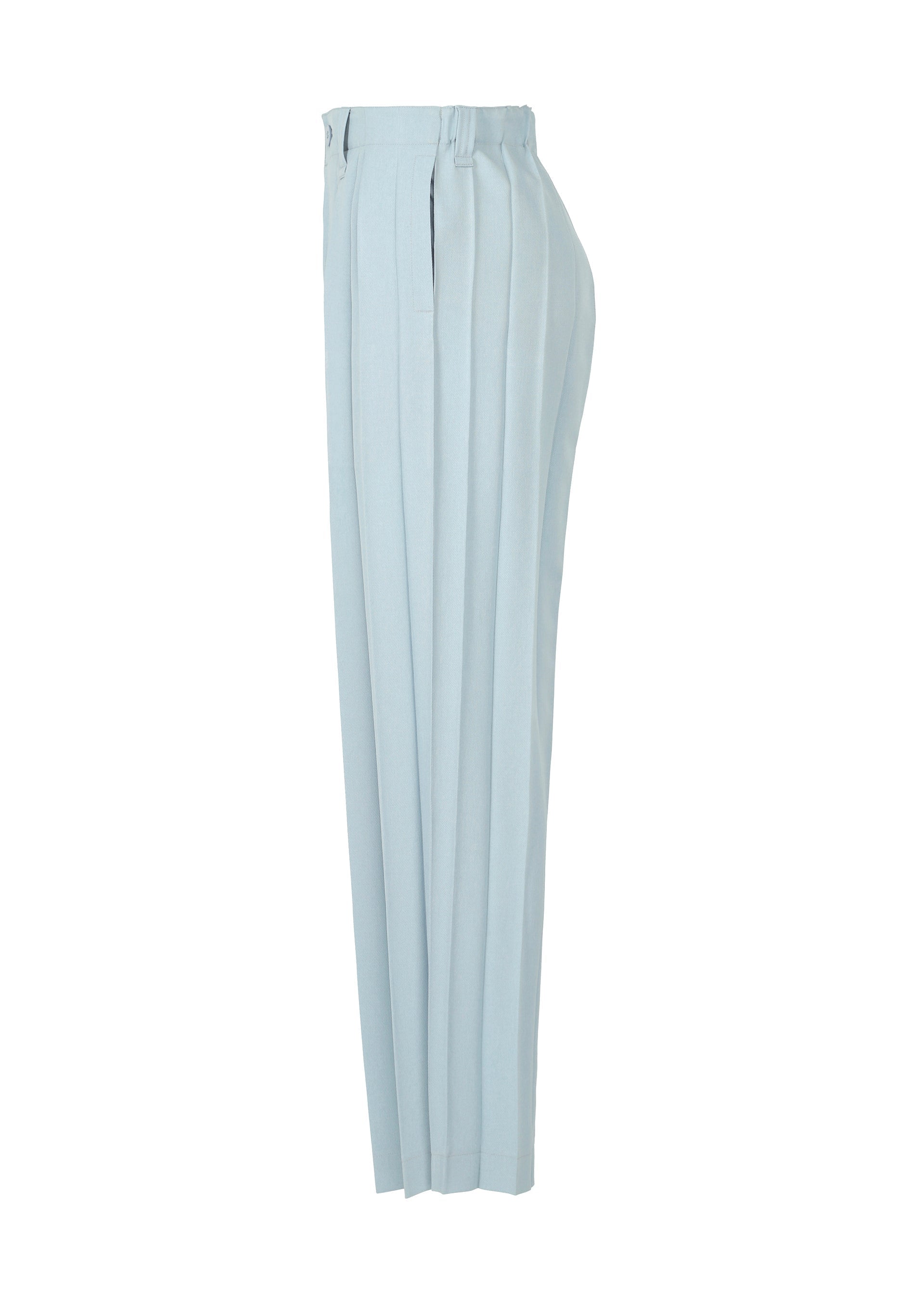 These straight pants with a casual impression are made from glossy material with wide accordion pleats. They have pockets on both sides and belt loops at the waist. They have a button-fly design.