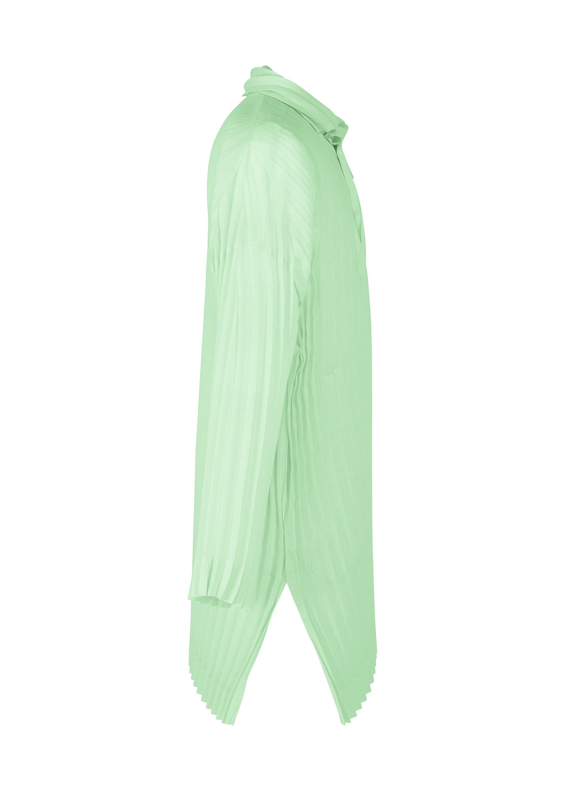 This long-sleeved shirt expresses the look of things fluttering in the wind with its series of curved handmade pleats applied to a simple pattern. It has pockets and slits on both sides.