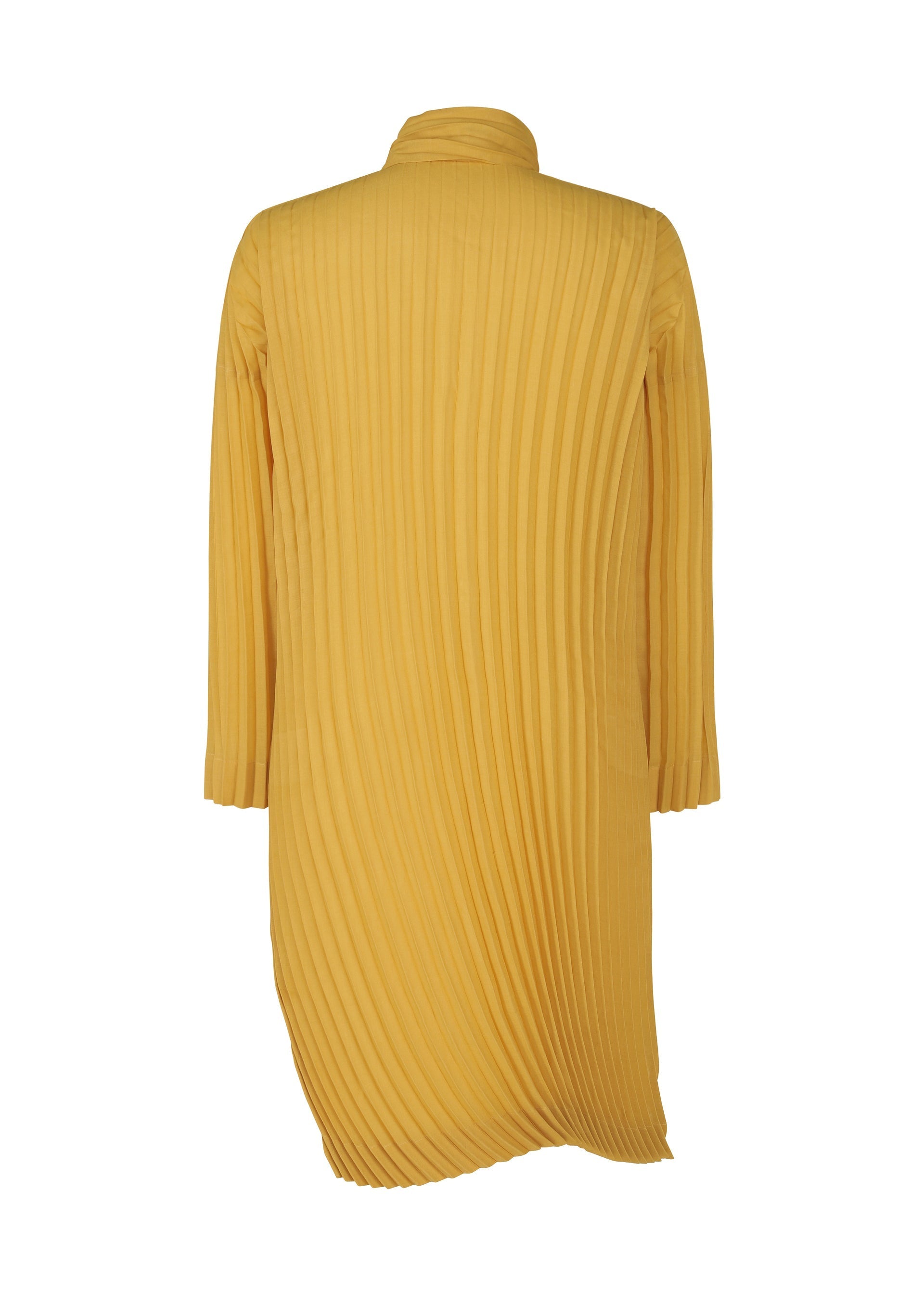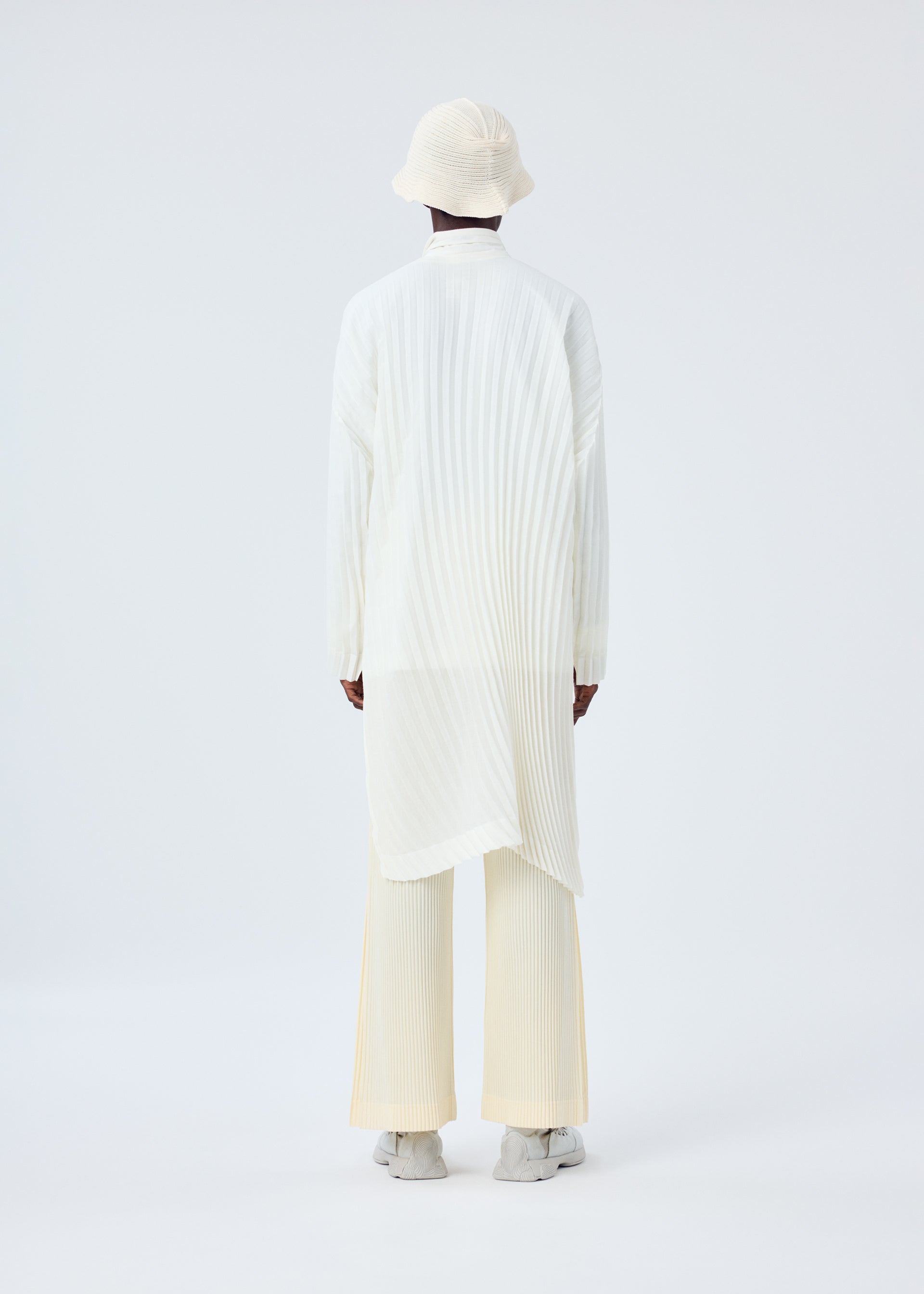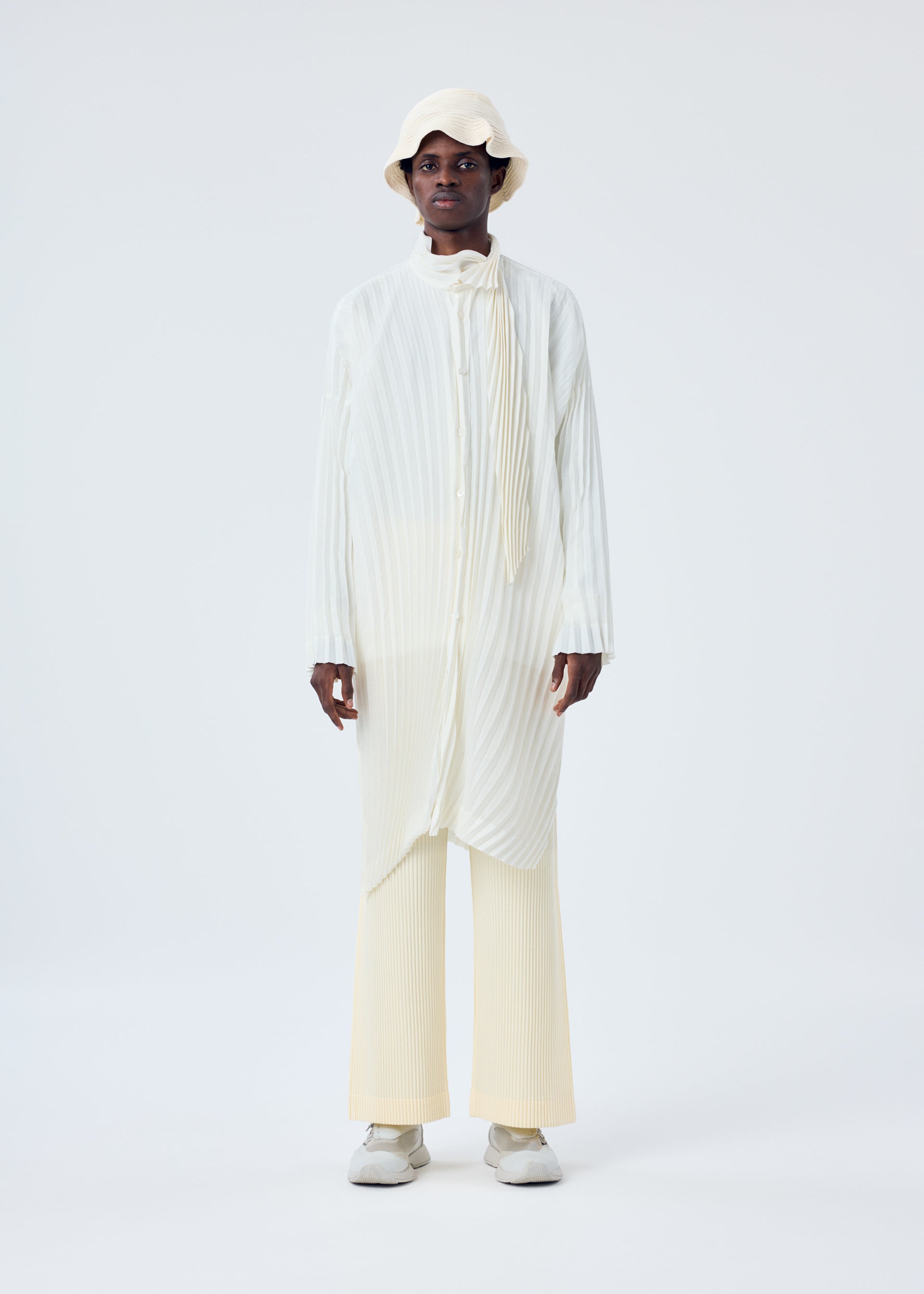 This long-sleeved, long shirt expresses the look of things fluttering in the wind with its series of curved handmade pleats applied to a simple pattern. The front slit is designed to allow the tie part to pass through, giving the impression of air flowing through. There are also slits on both sides.