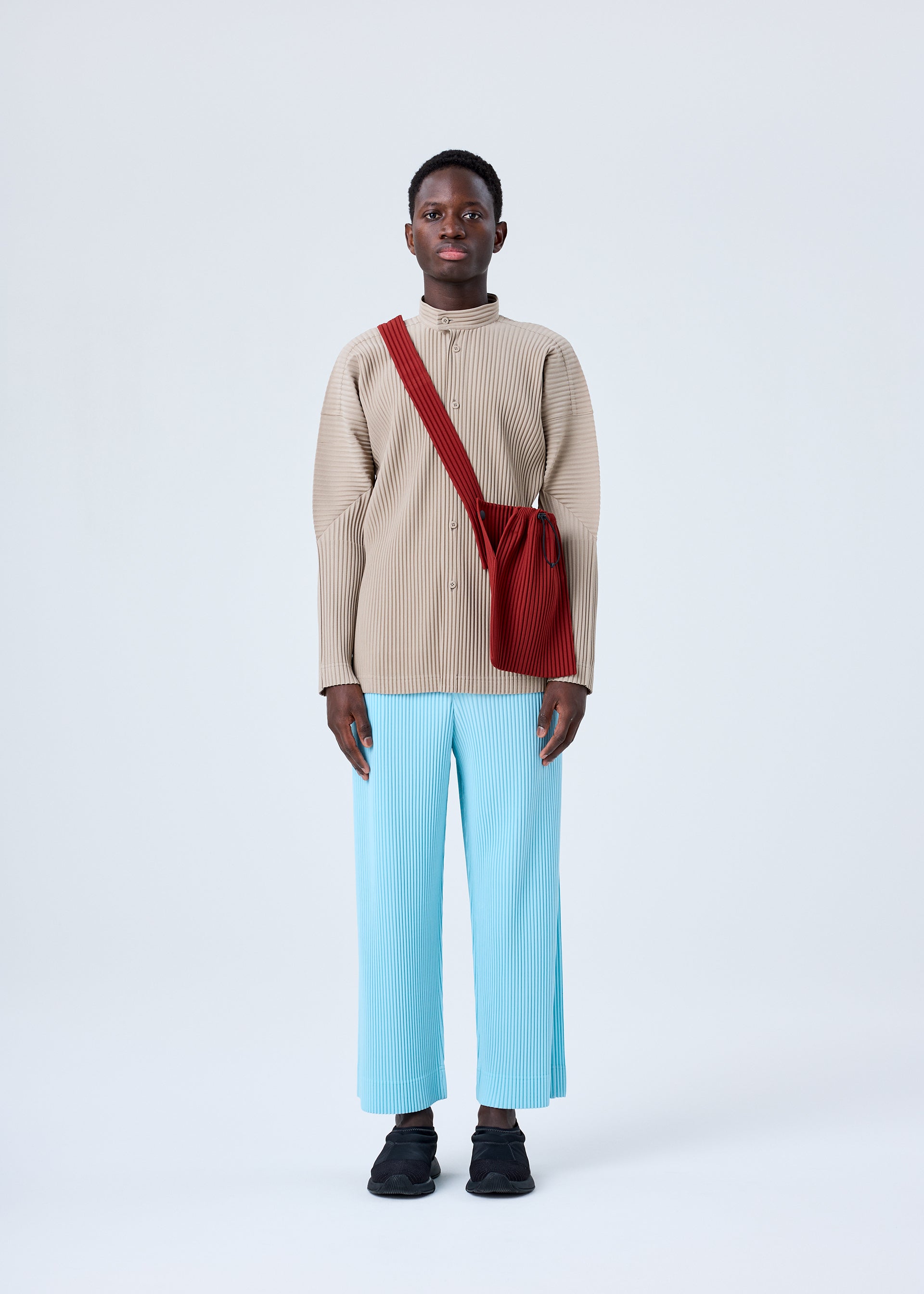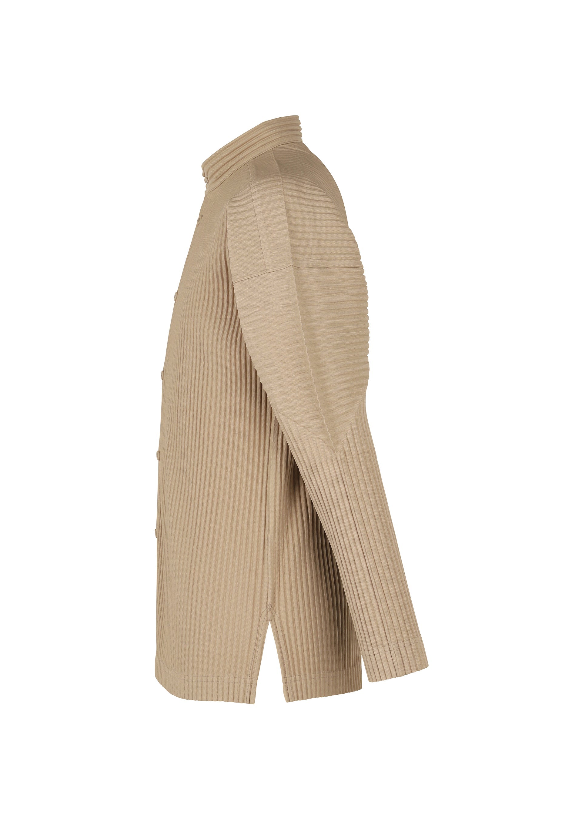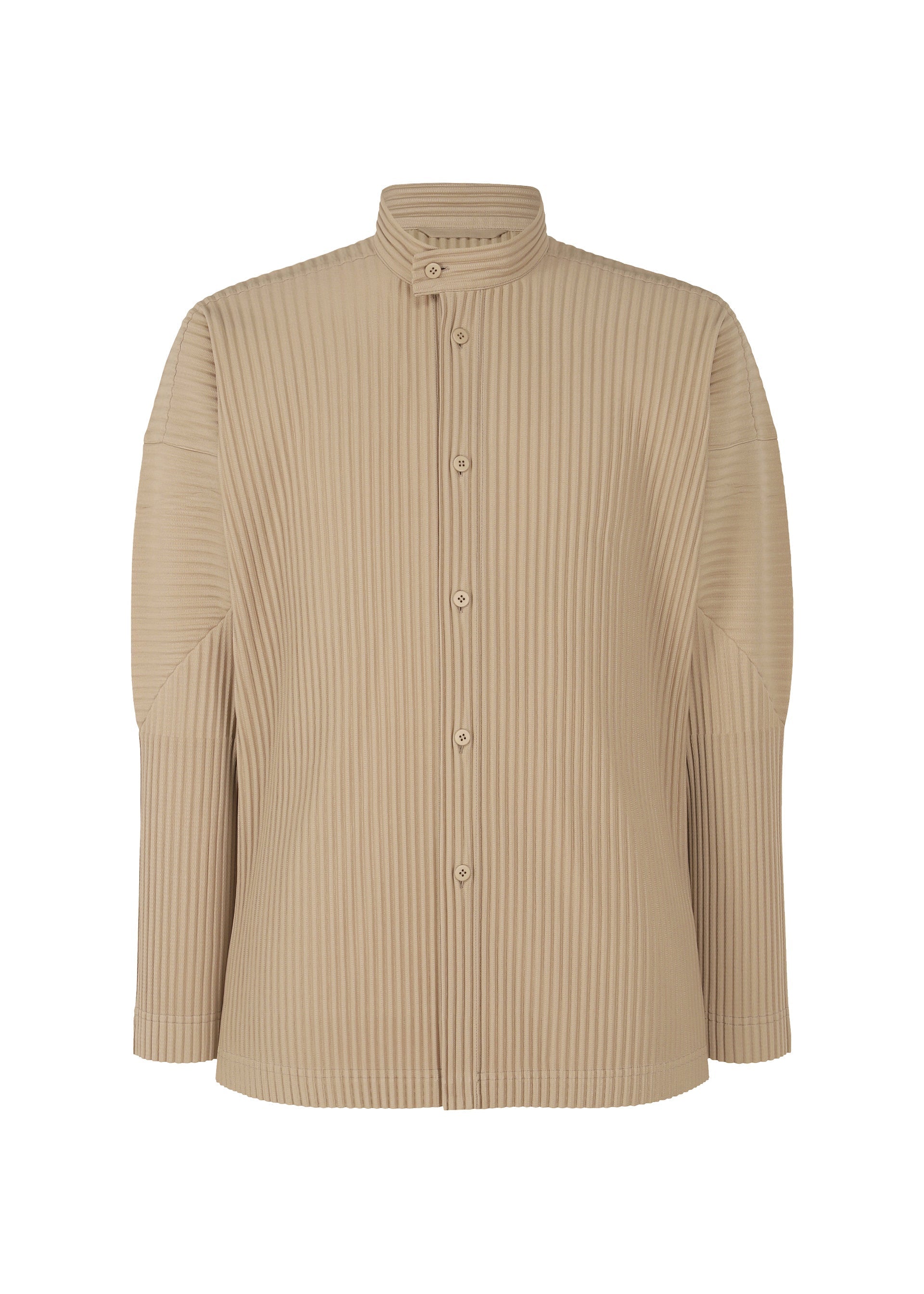 This shirt with a standing collar is available in sophisticated color tones. It is characterized by its portability and light comfort with the unique quick-drying property of polyester material. It has slits on both sides.