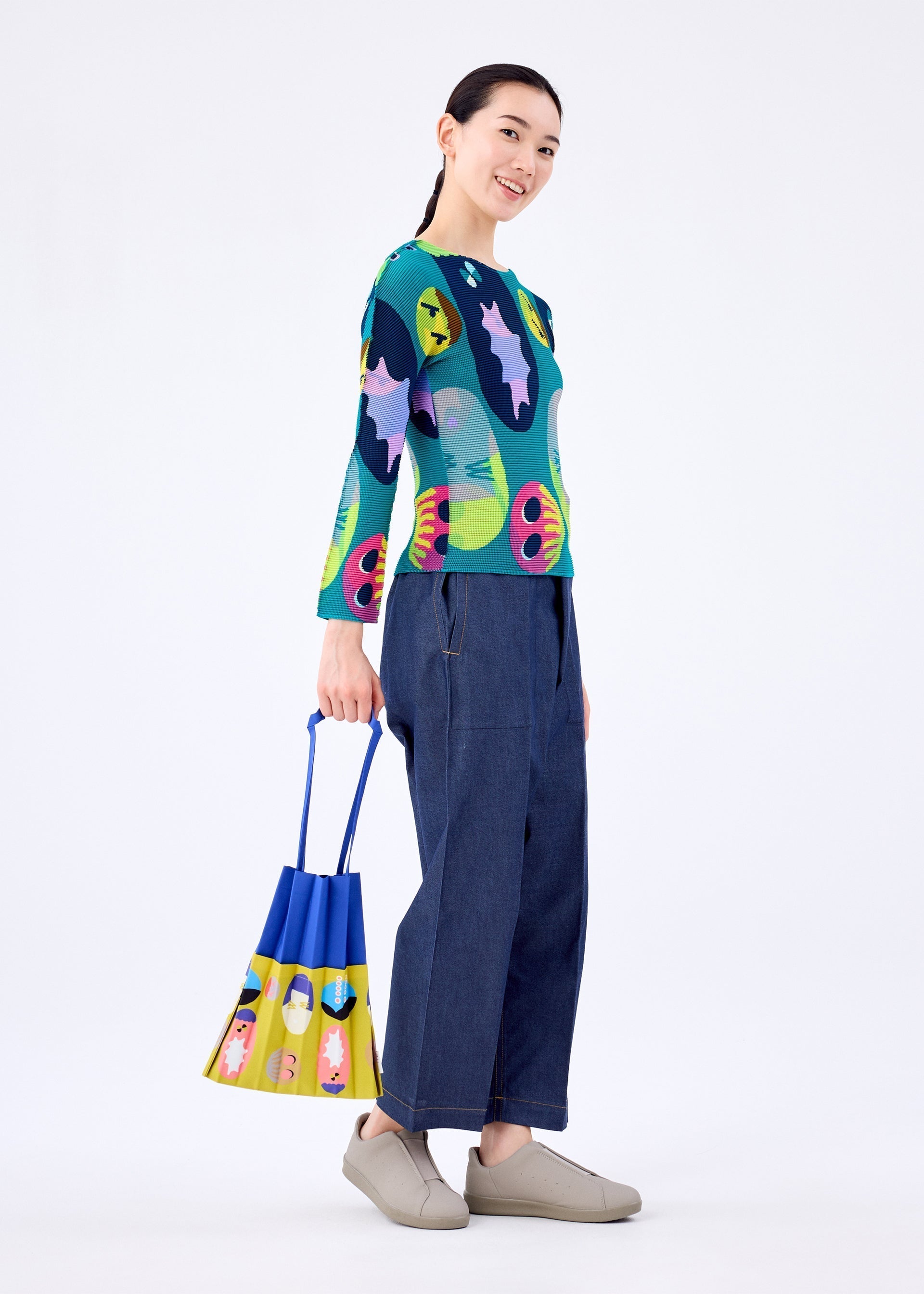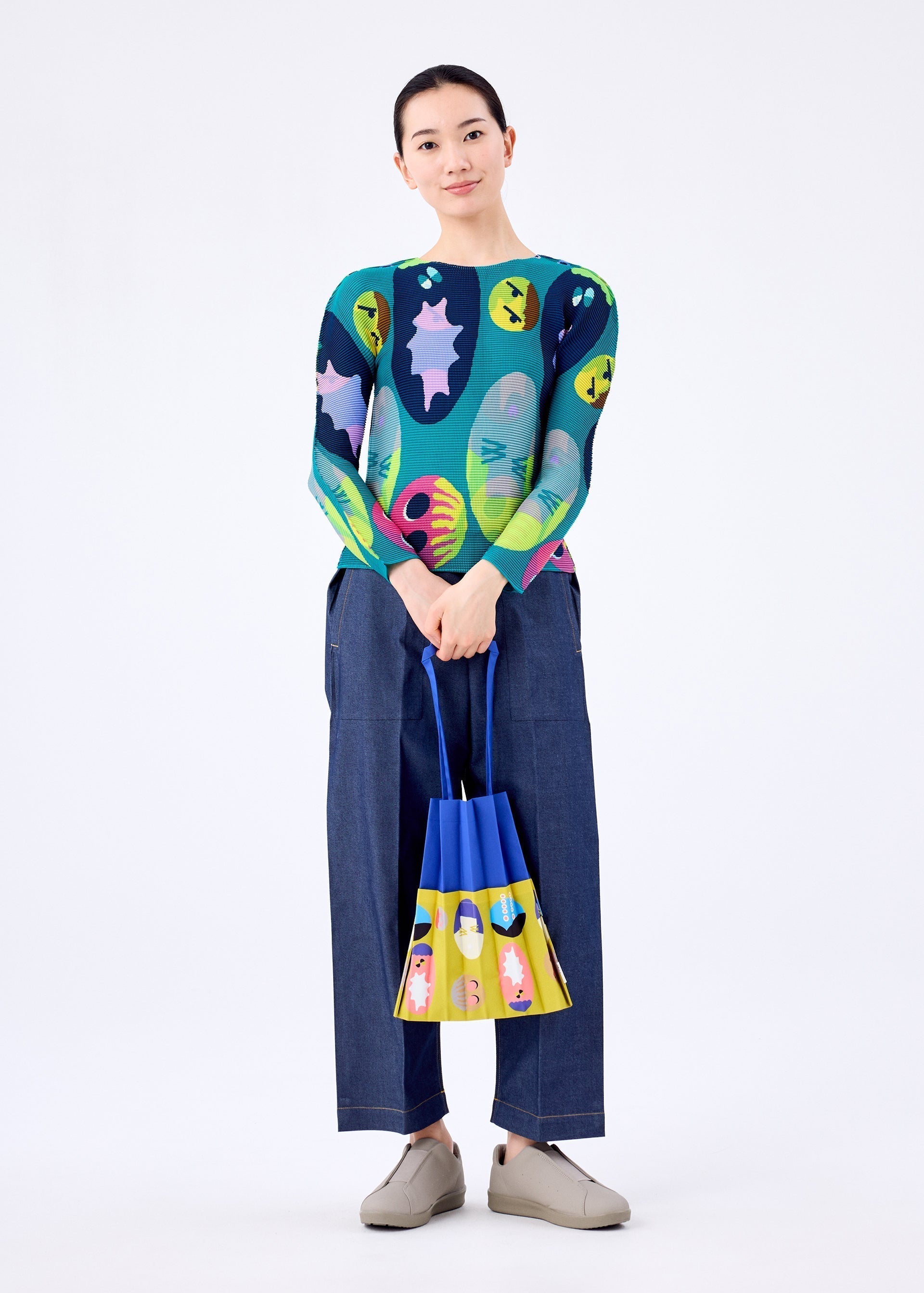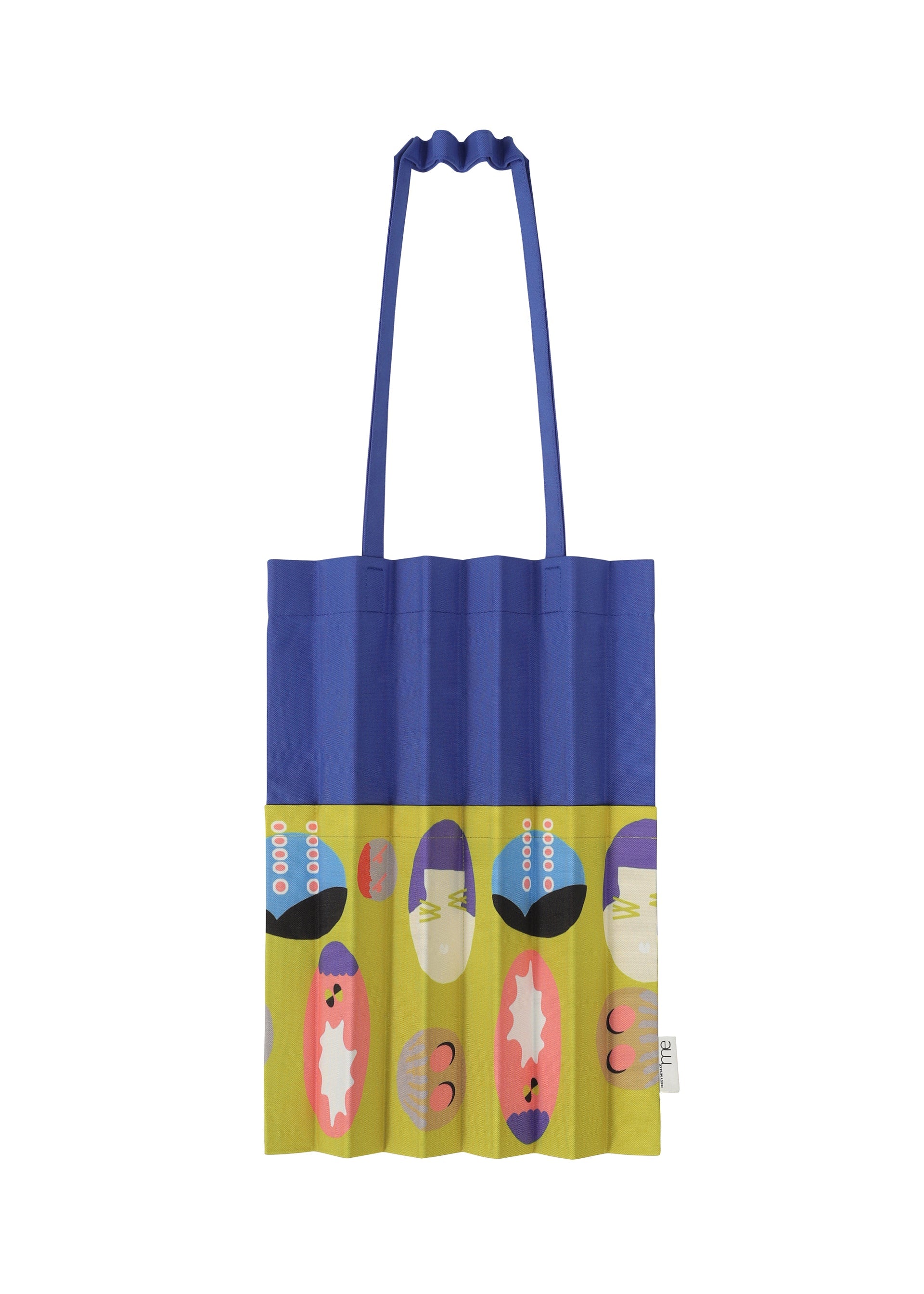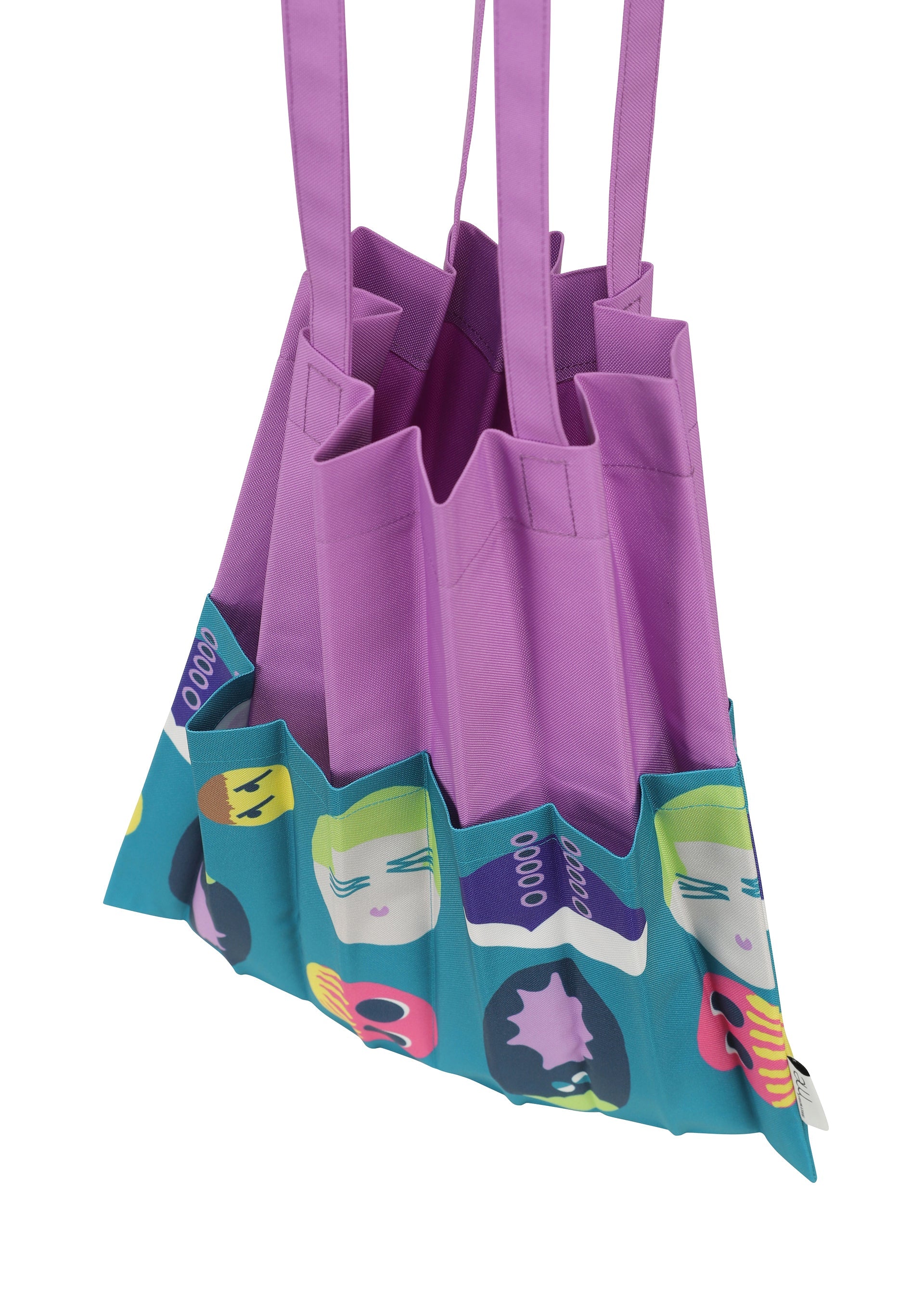 This hand-pleated mini tote bag has a print on its outside pocket featuring illustrations of various facial expressions such as joy, anger, grief, and pleasure. A fun pattern emerges when you place items inside.