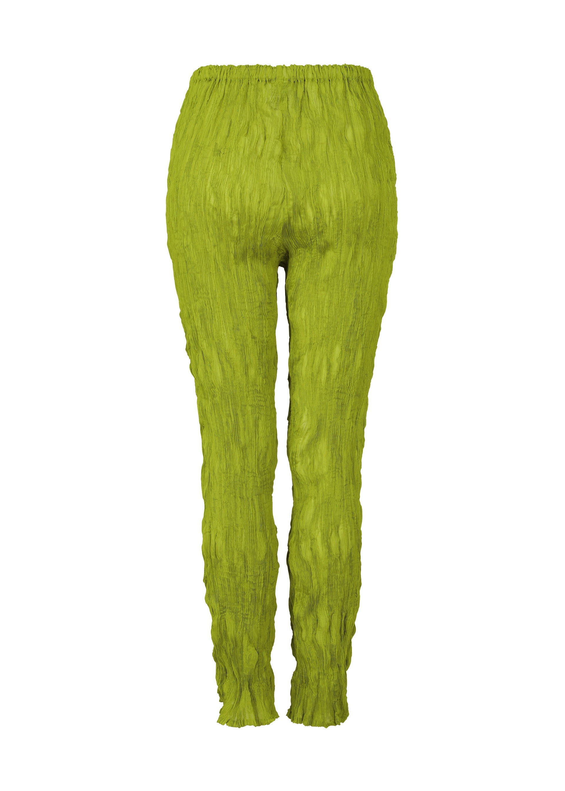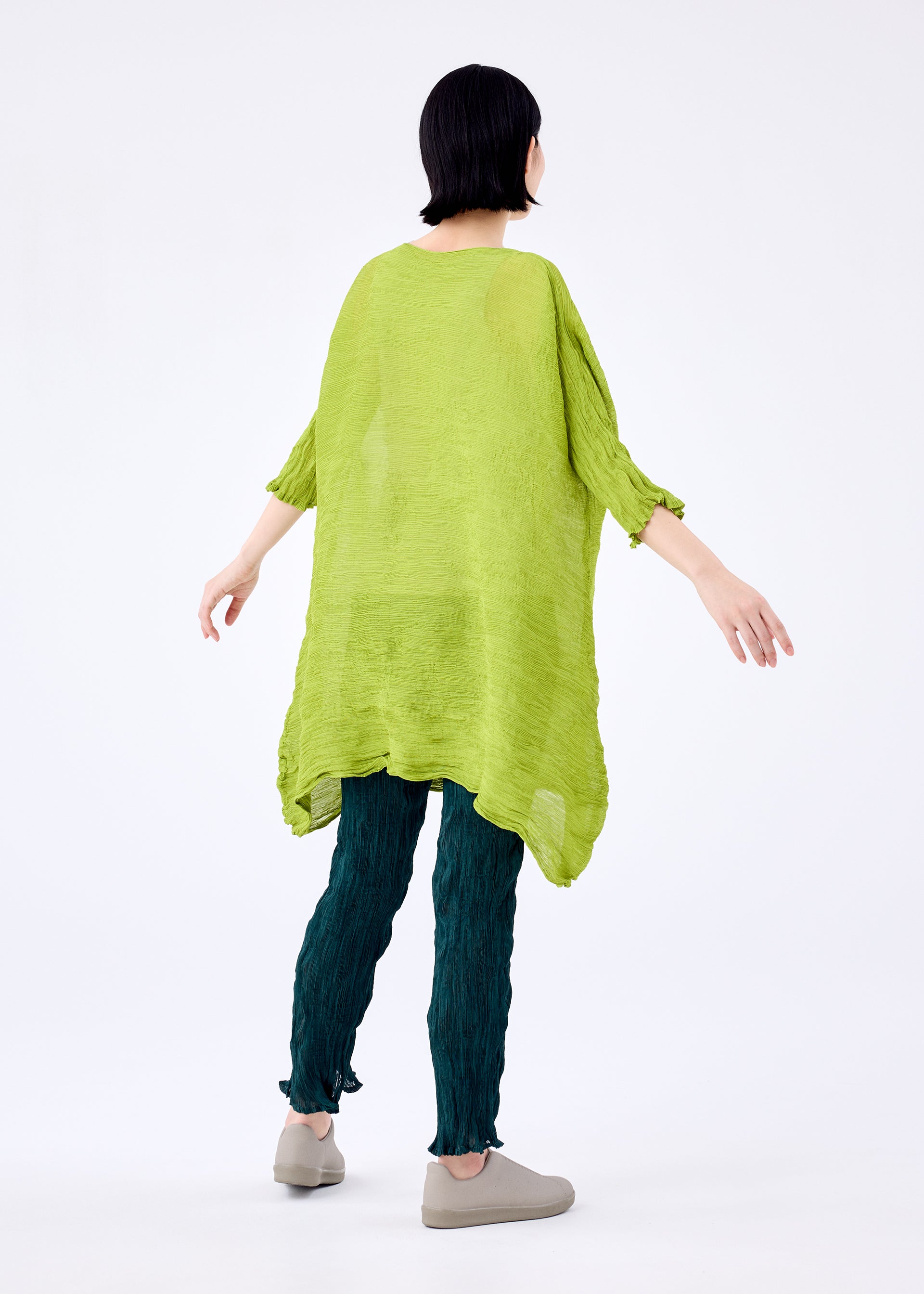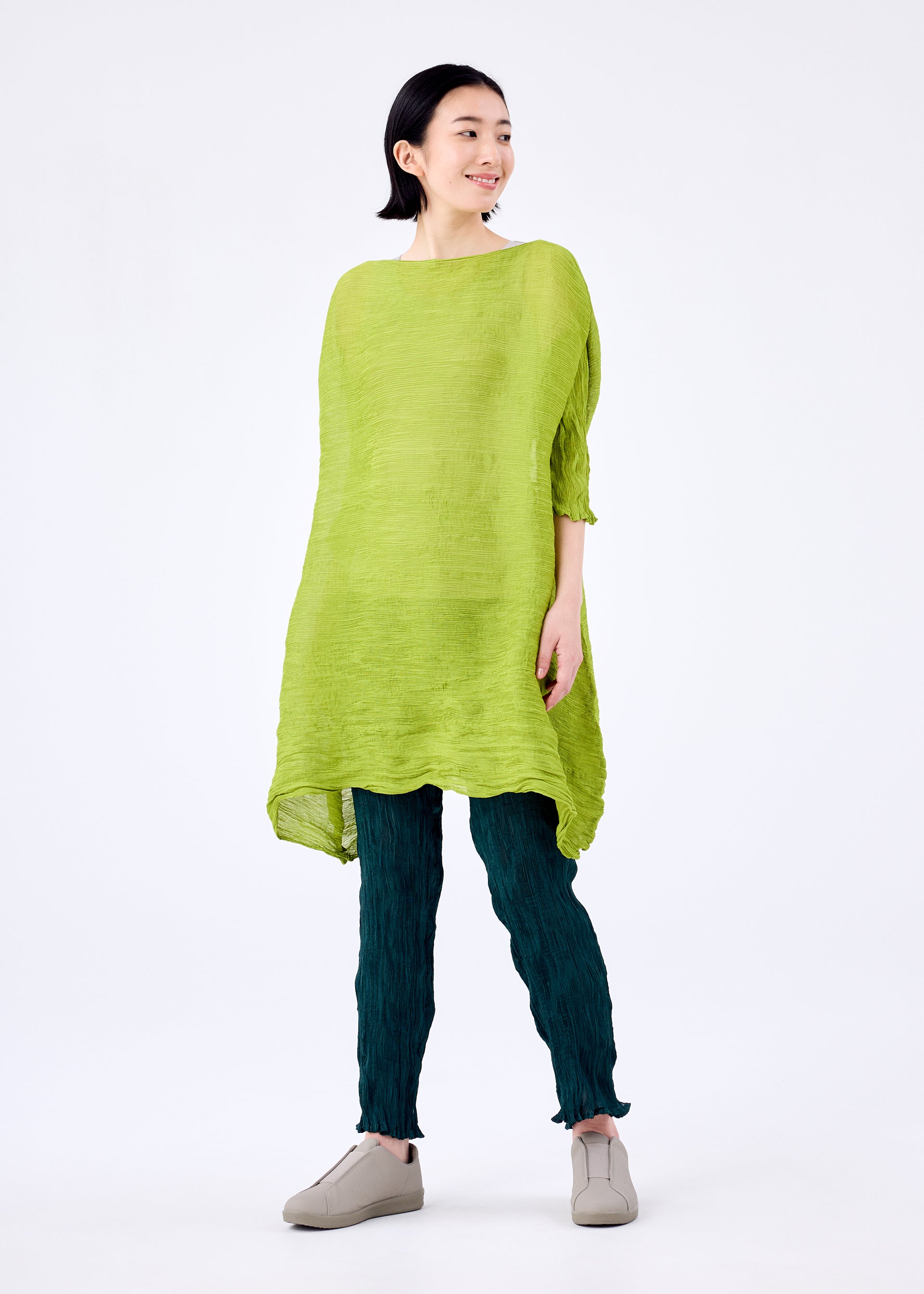 These SEE-THROUGH CREPE pants are made from product-dyed fabric that is woven using high-twist thread for the weft. The weft thread is twisted back during the dyeing process, which gives the fabric the unique look of crepe with vertical creases. The fabric undergoes the usual SEE-THROUGH CREPE production process and then twisting processing for a sleek silhouette. It is recommended to layer items from the same series to enjoy the gradation of colors.