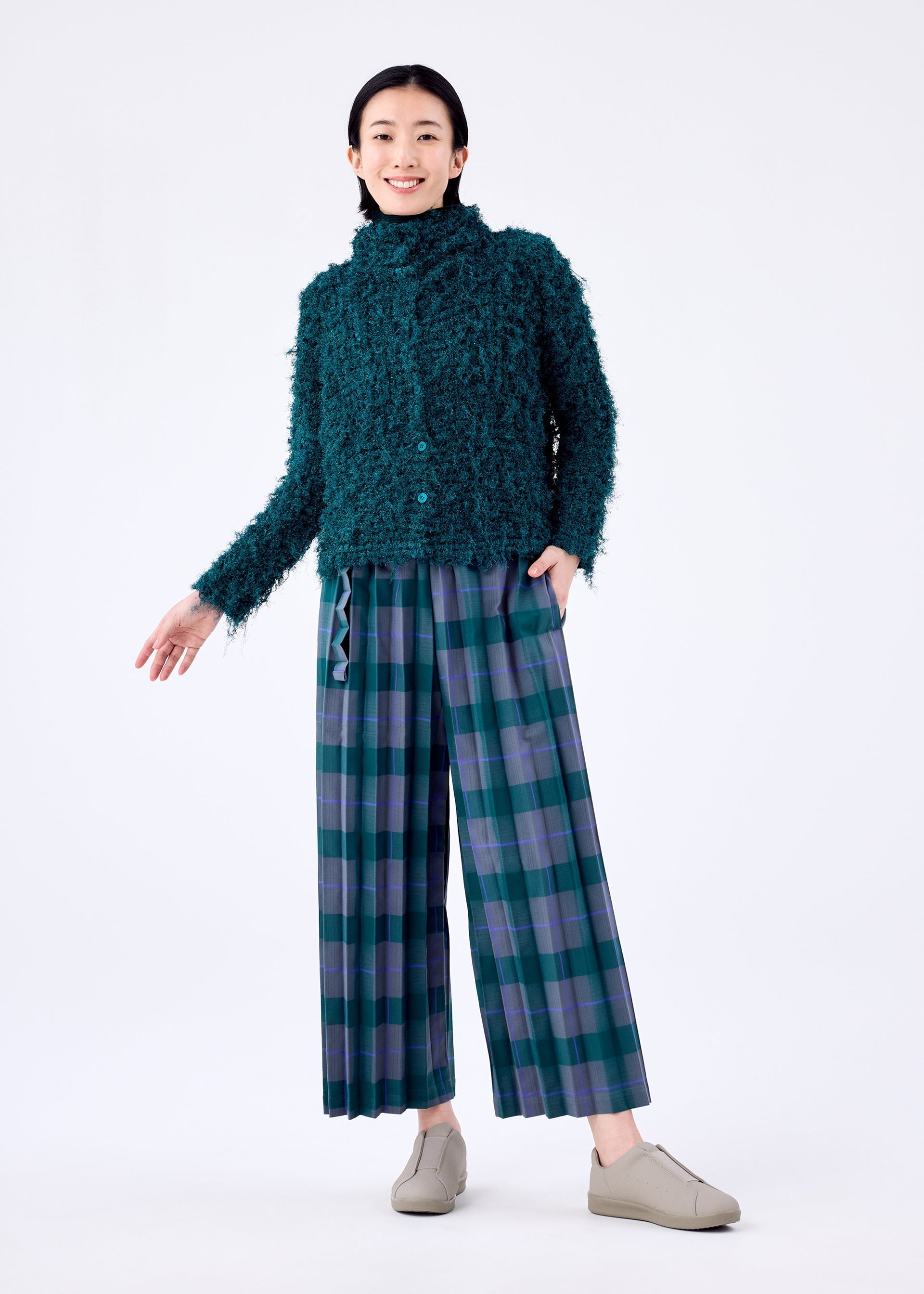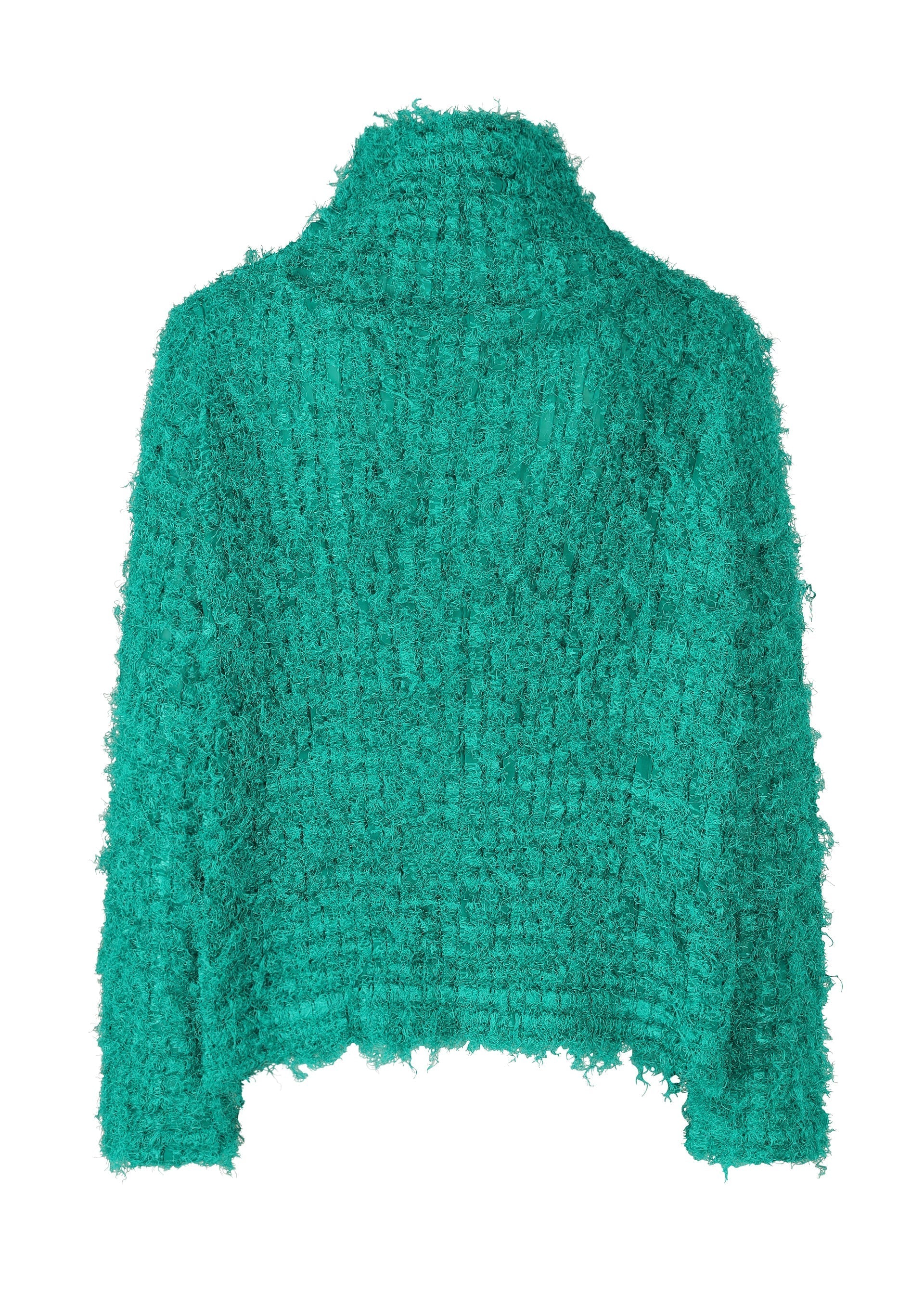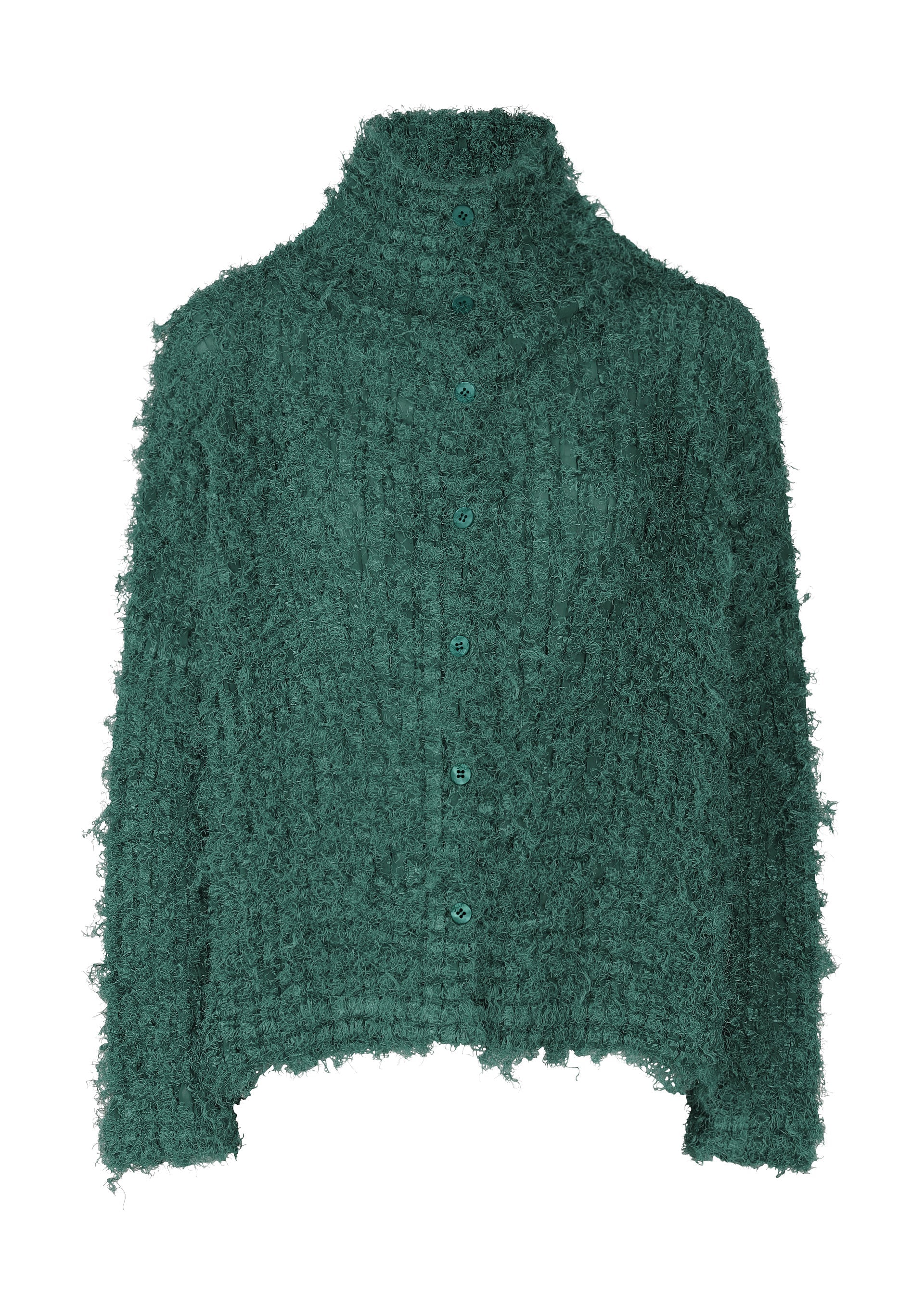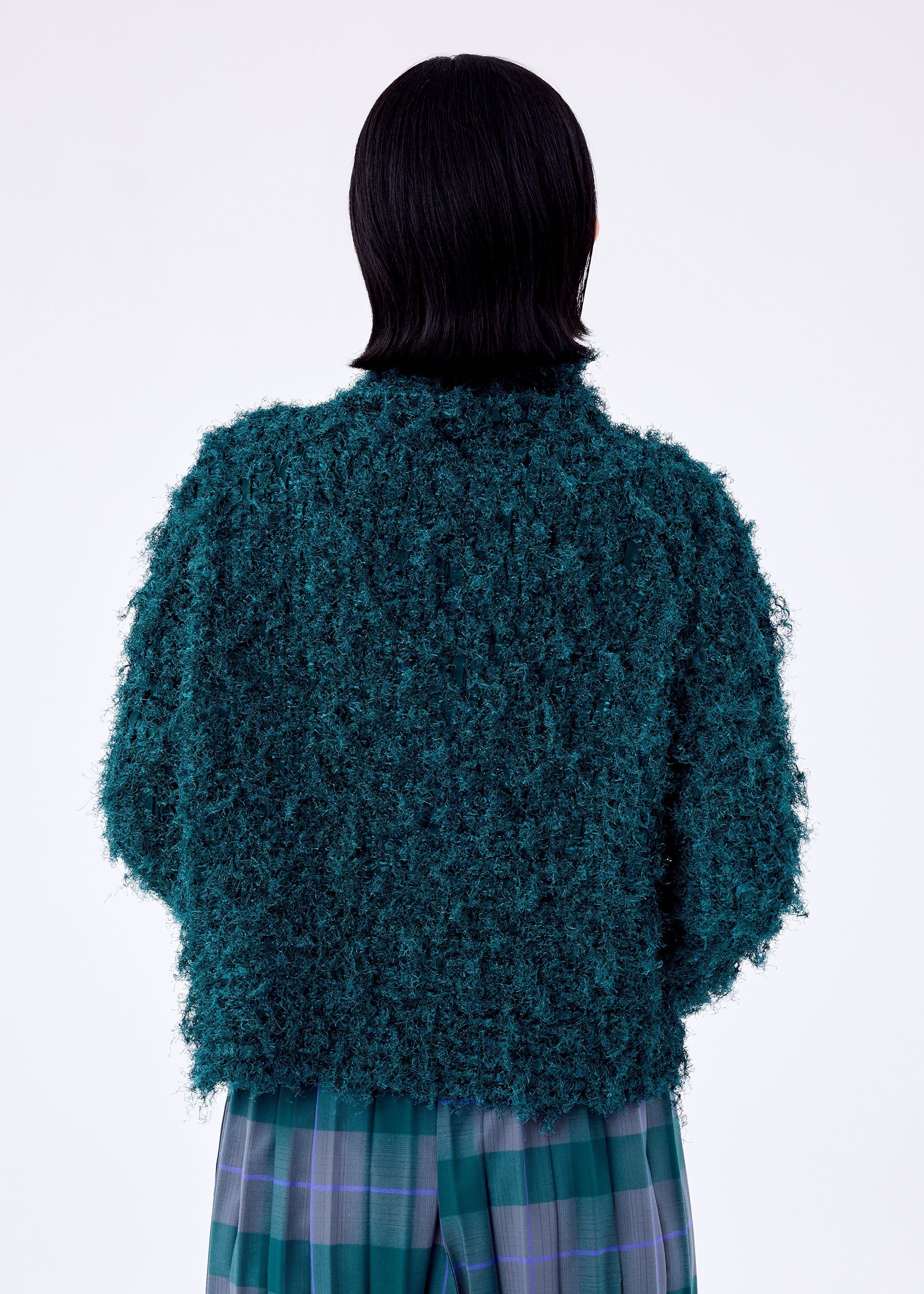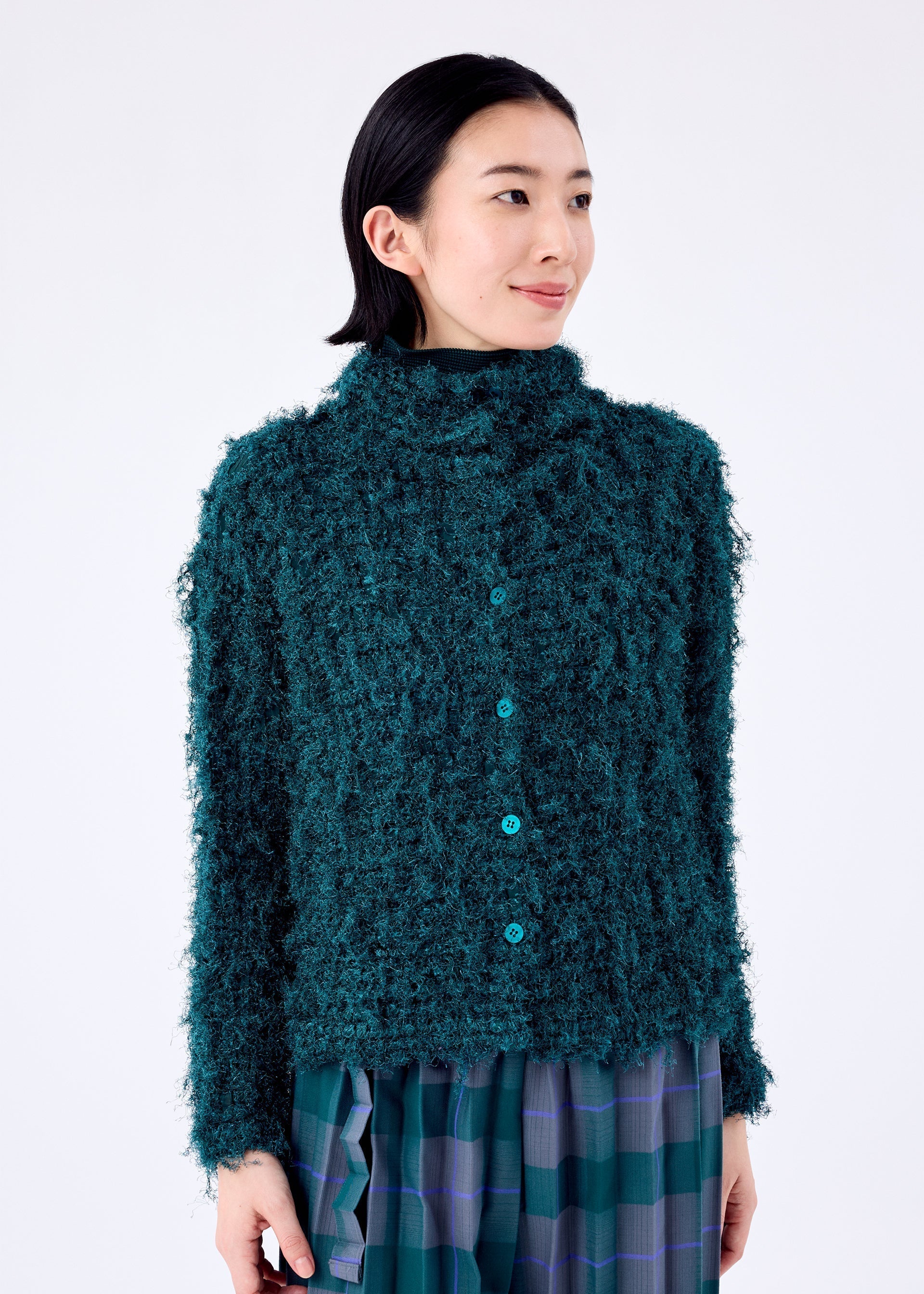 This warm long-sleeved cardigan is made from shaggy cut jacquard fabric with vertical and horizontal pleats. The vivid colors and knit-like volume will add a glamorous touch to your outfit.