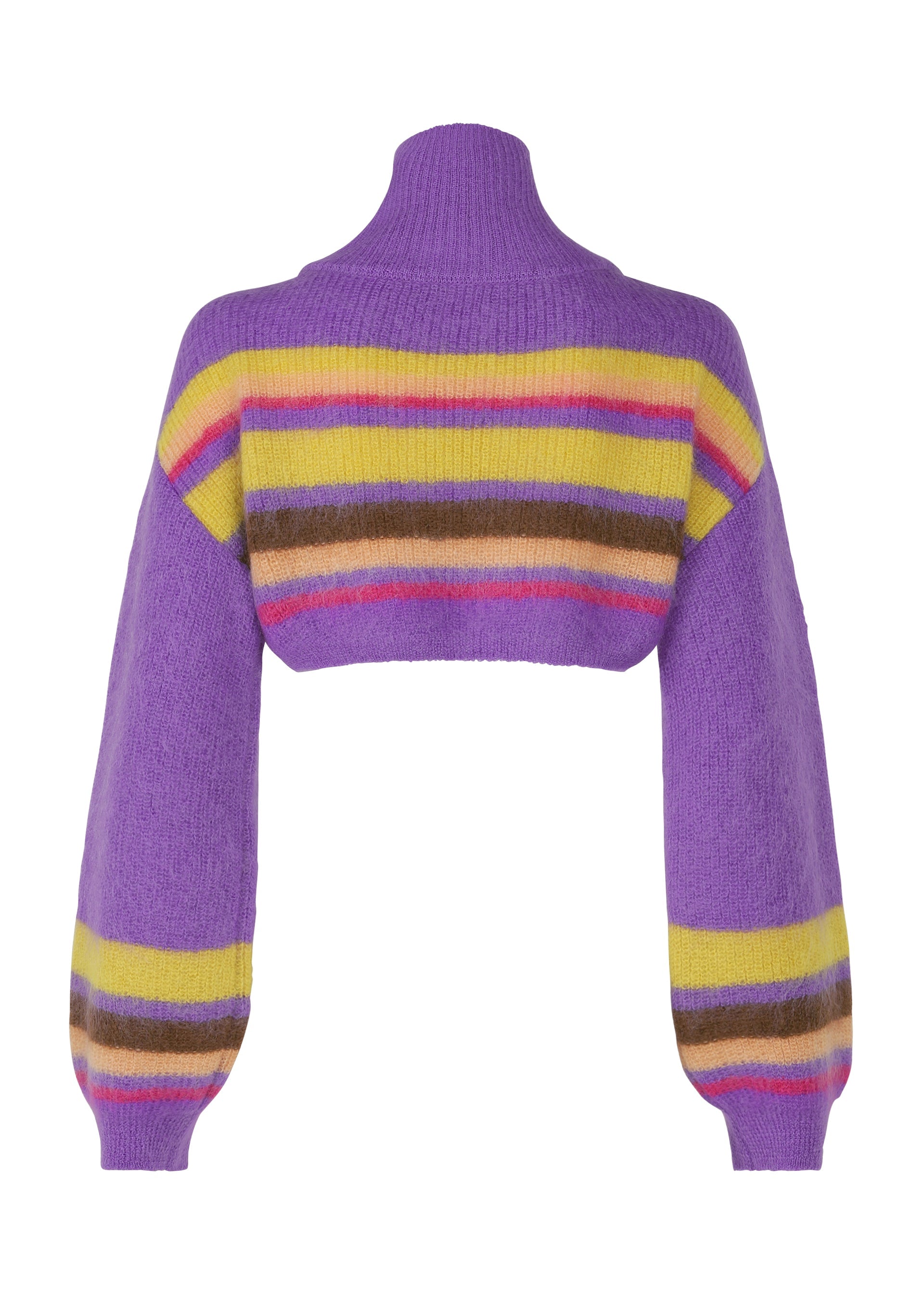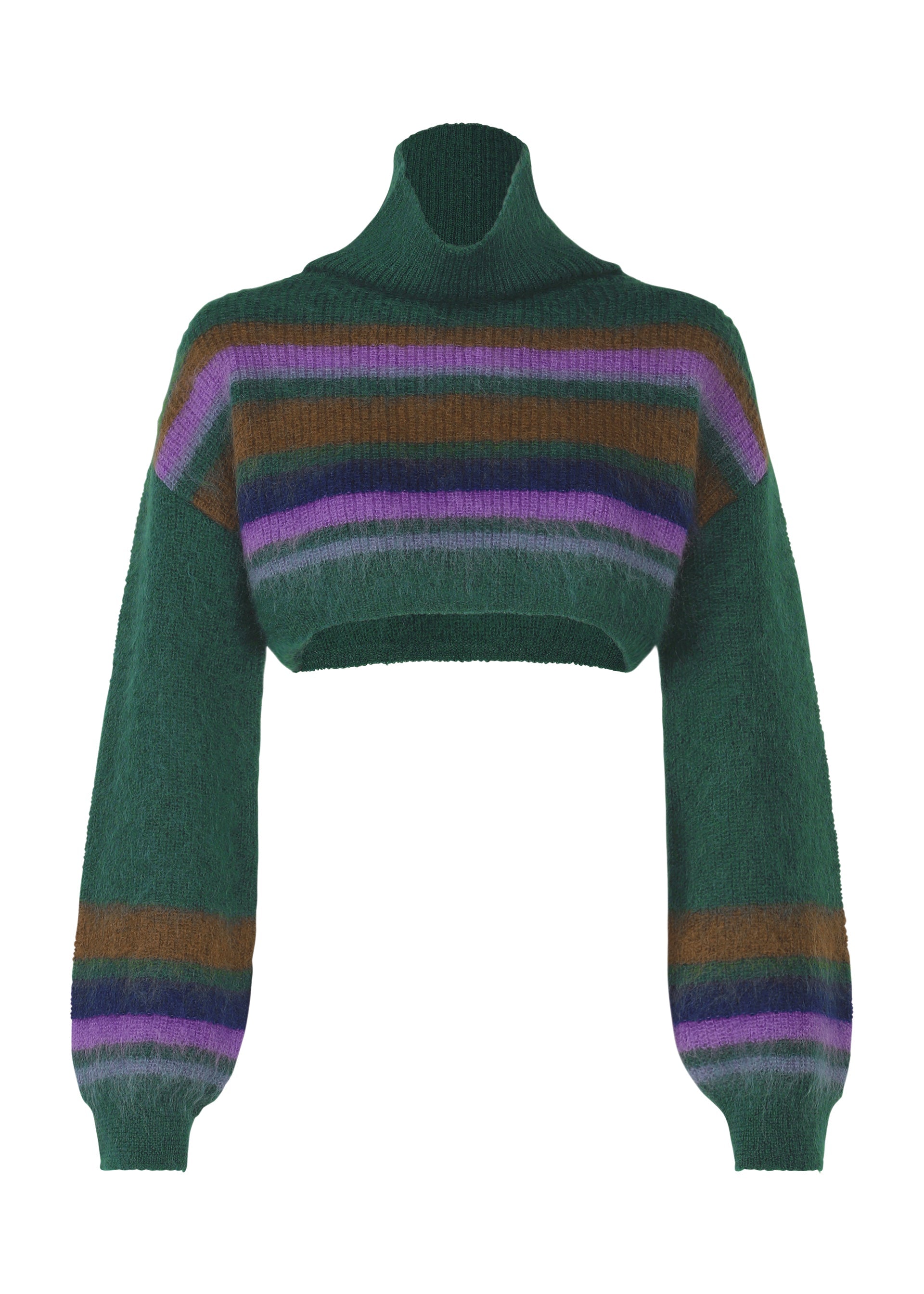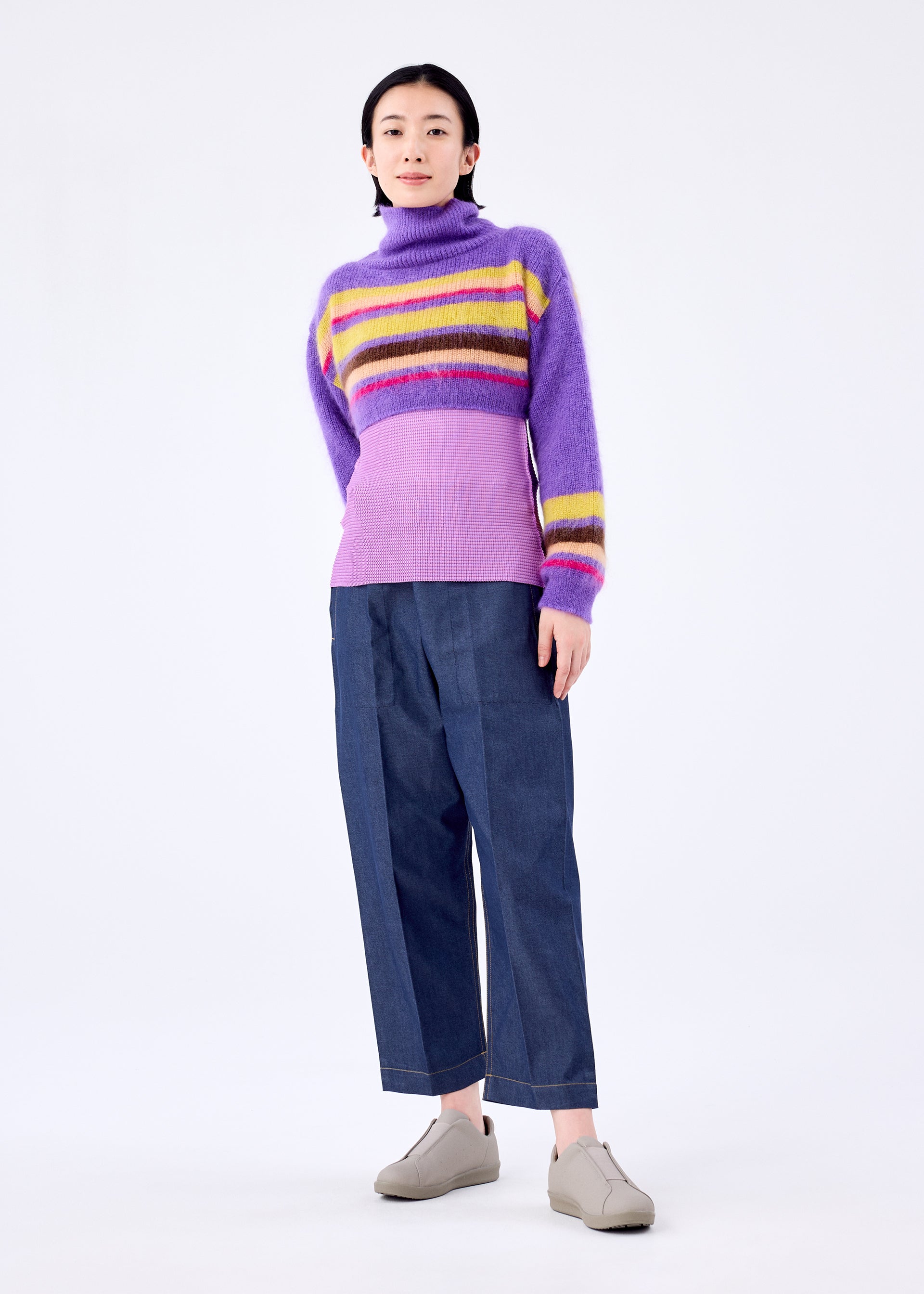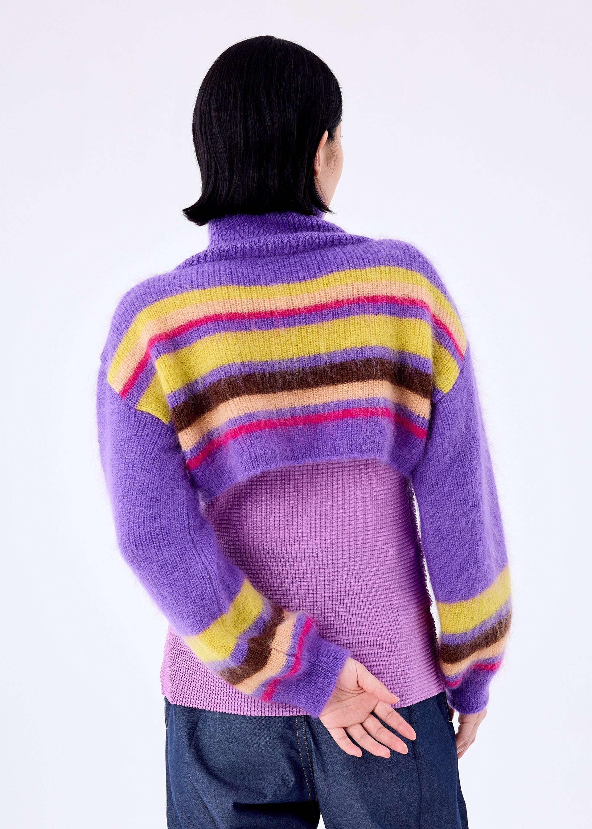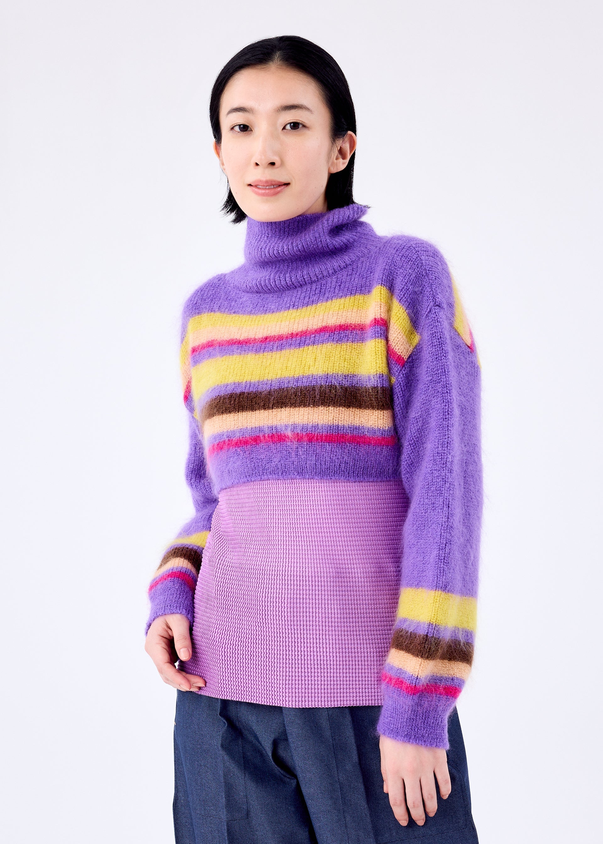 This cropped long-sleeved knit is characterized by the beautiful sheen unique to mohair and its fuzzy, soft feel. The colorful striped pattern is designed to be easy to style with various items, such as STRETCH PLEATS items.