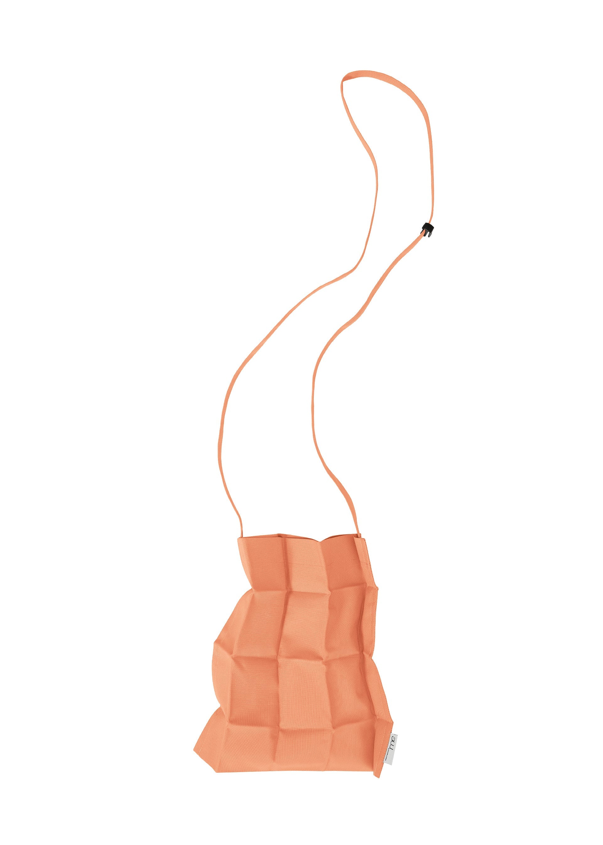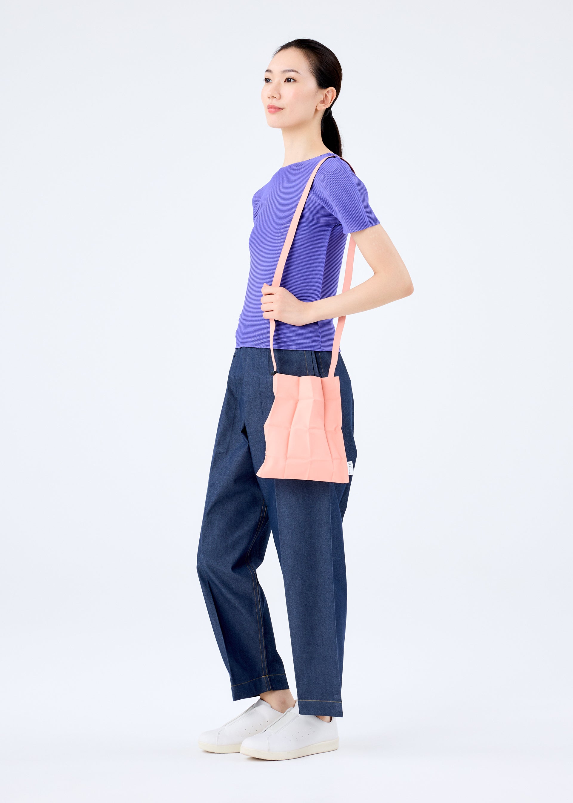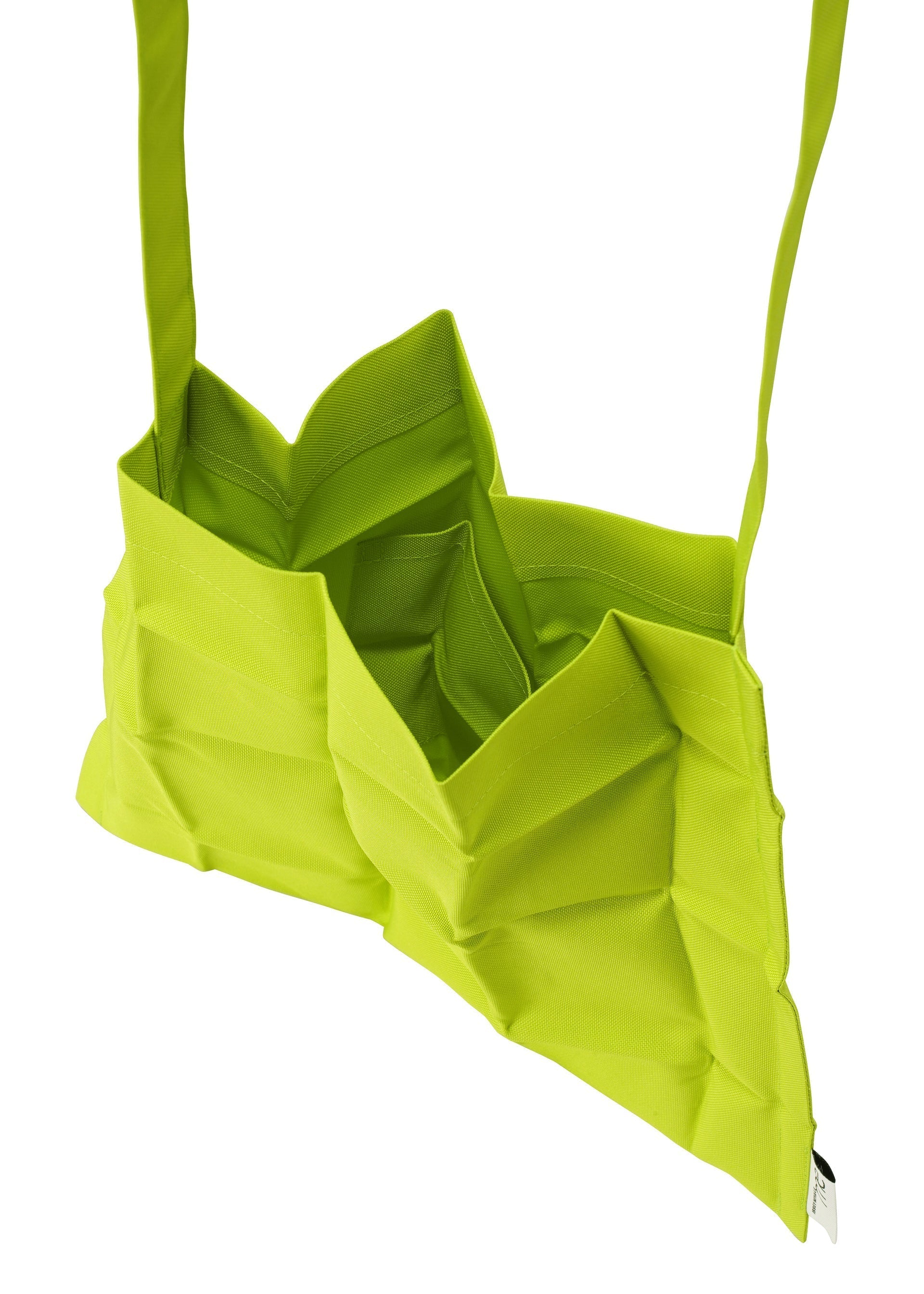 This shoulder bag can be compactly folded along the pleat lines. The included clasp keeps the pleats from expanding when stored. There is one inner pocket.