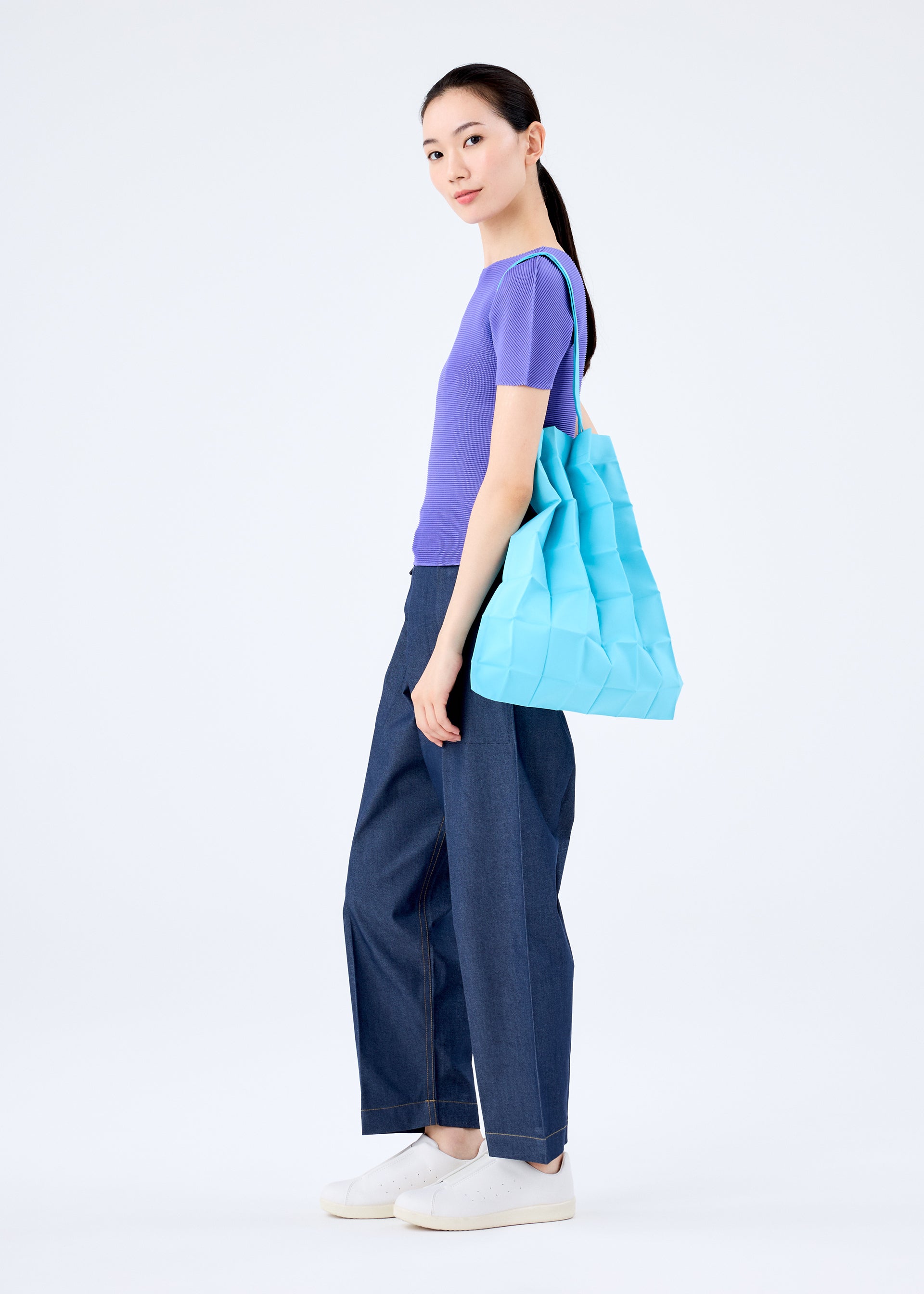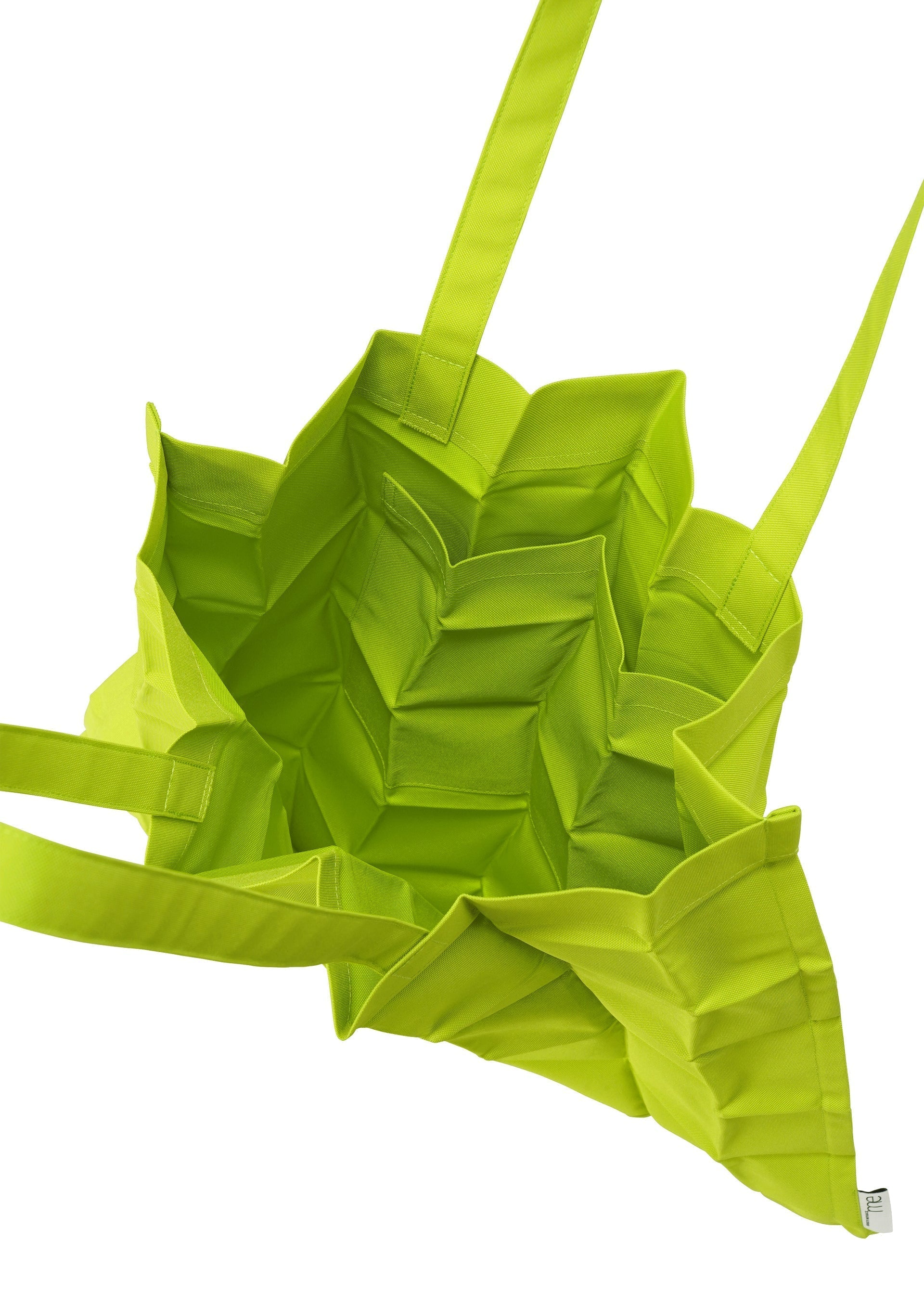 This tote bag can be compactly folded along the pleat lines. The included clasp keeps the pleats from expanding when stored. There is one inner pocket.