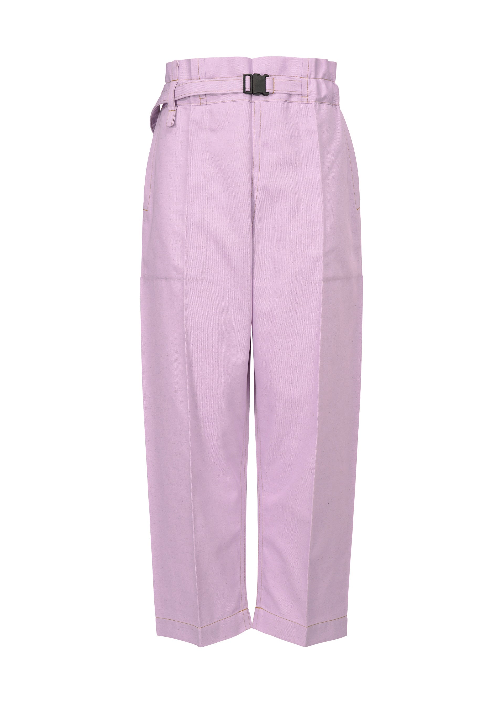 These denim pants are made using thread newly created from the scraps and leftover pieces of STRETCH PLEATS fabric produced in the clothes-making process, which are made back into cotton using reclaimed wool technology and mixed with recycled polyester. The pants are from an eco-friendly series created based on the idea of treasuring fabric. The functional design allows the pants to be folded along the pleats to make them compact and easy to carry. There are pockets on both sides.