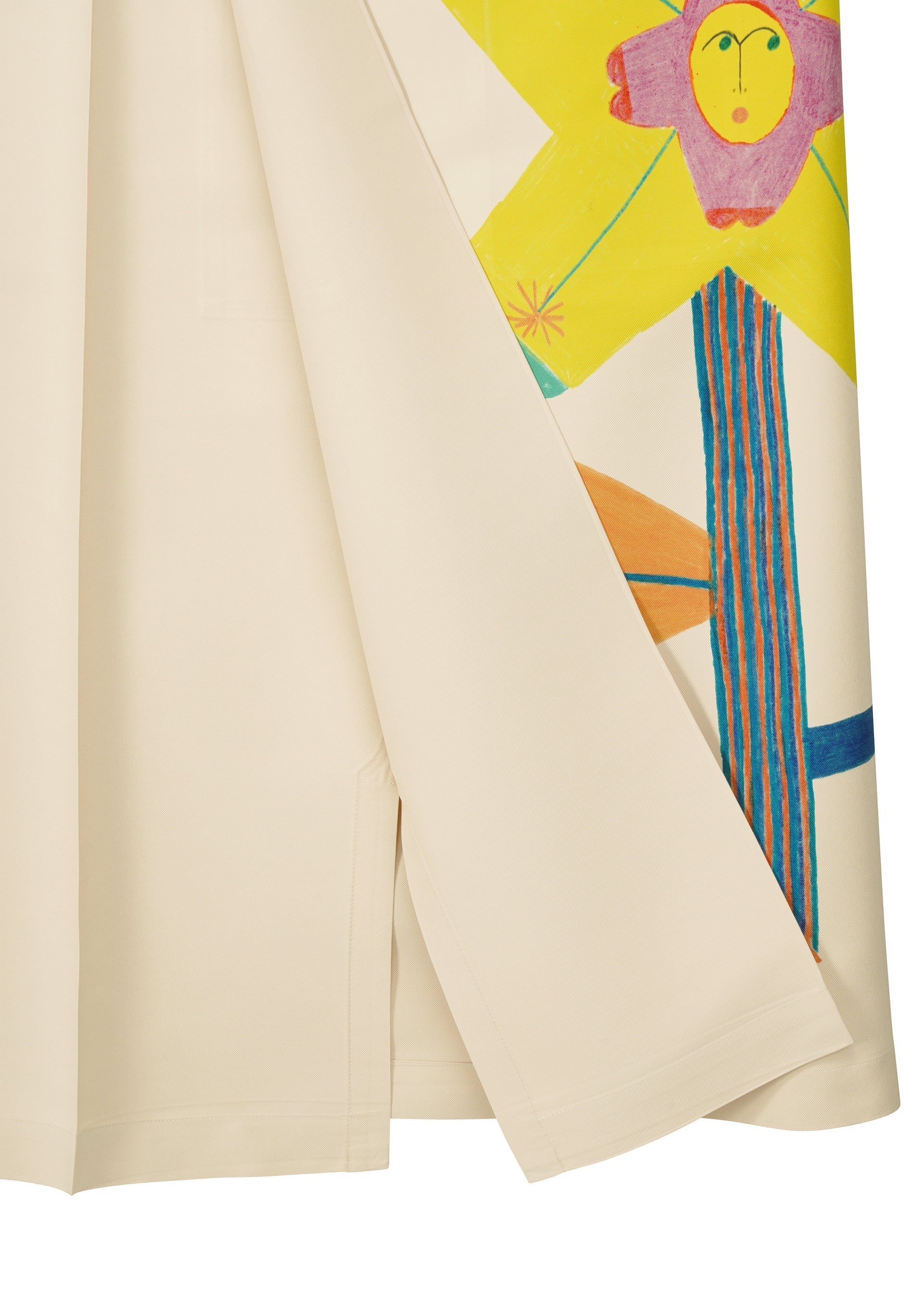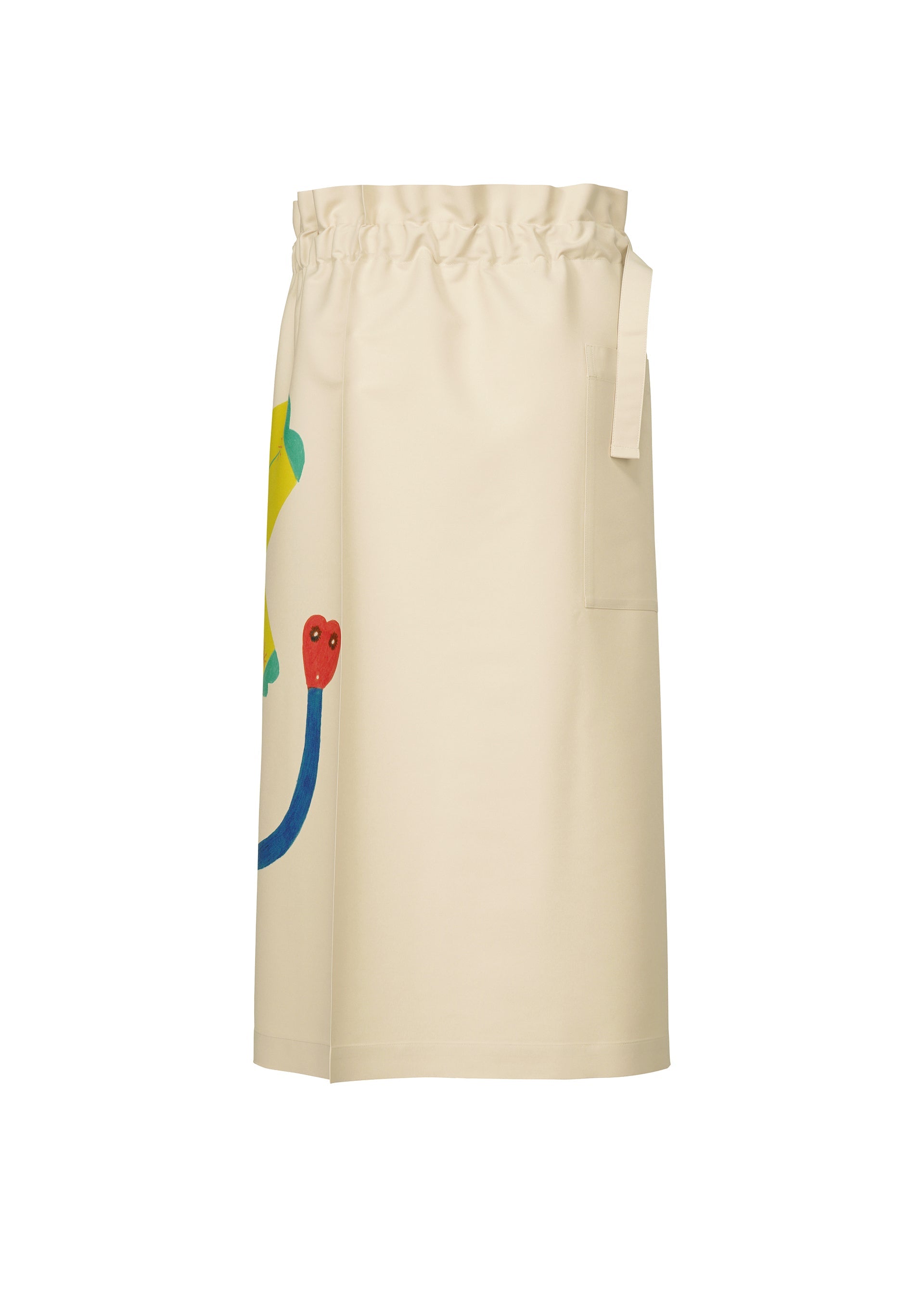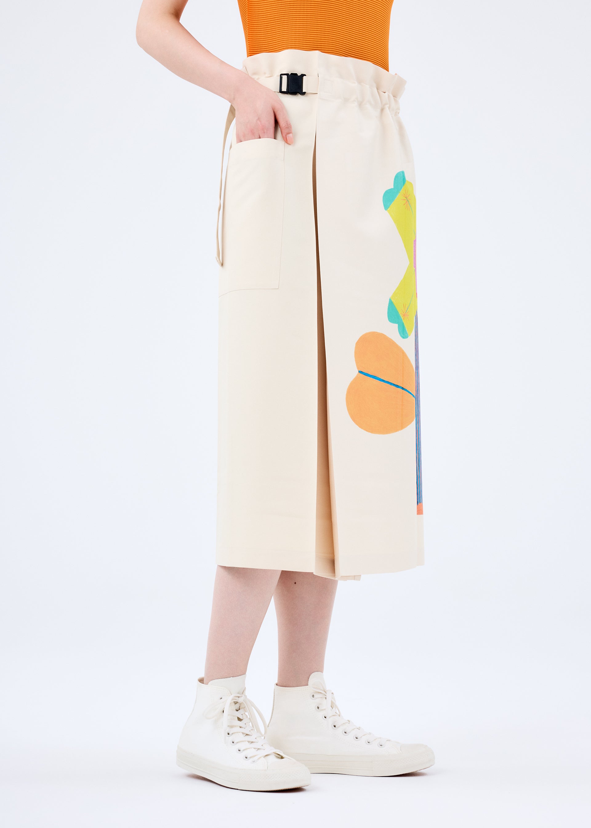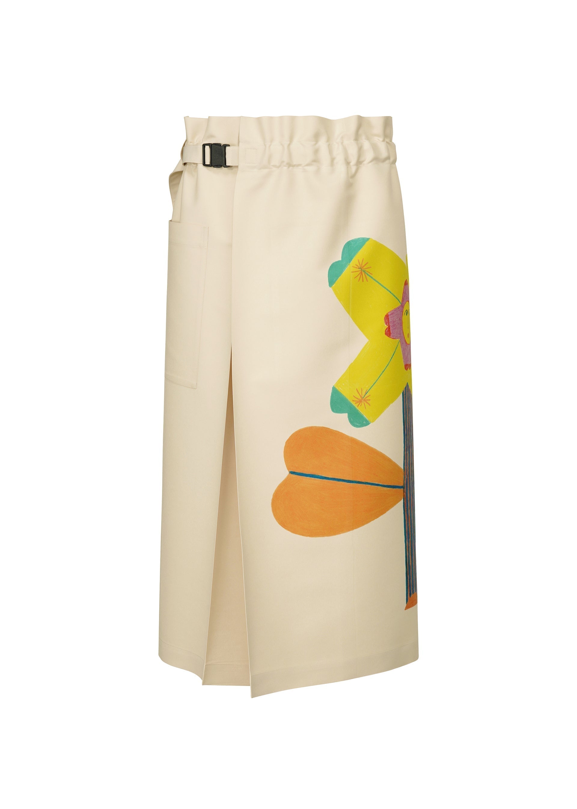 This skirt features a bold transfer print of a multi-colored flower pattern drawn with colored pencils. The wrap style gives the impression that you are wearing the illustrations. The inner button at the waist keeps the wrapped part securely in place. The skirt has one pocket.