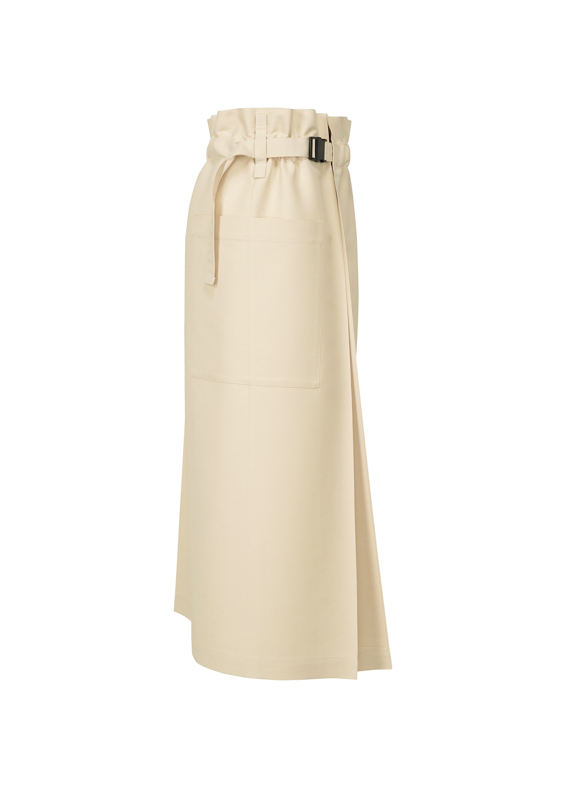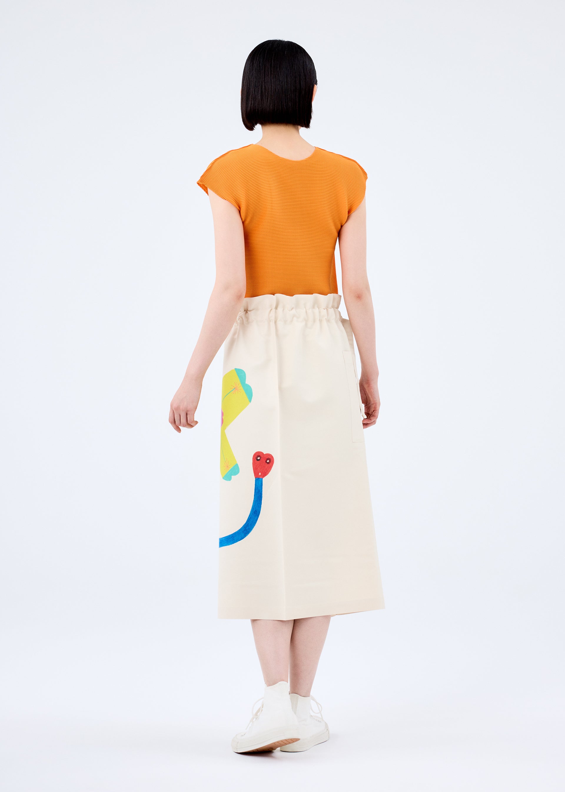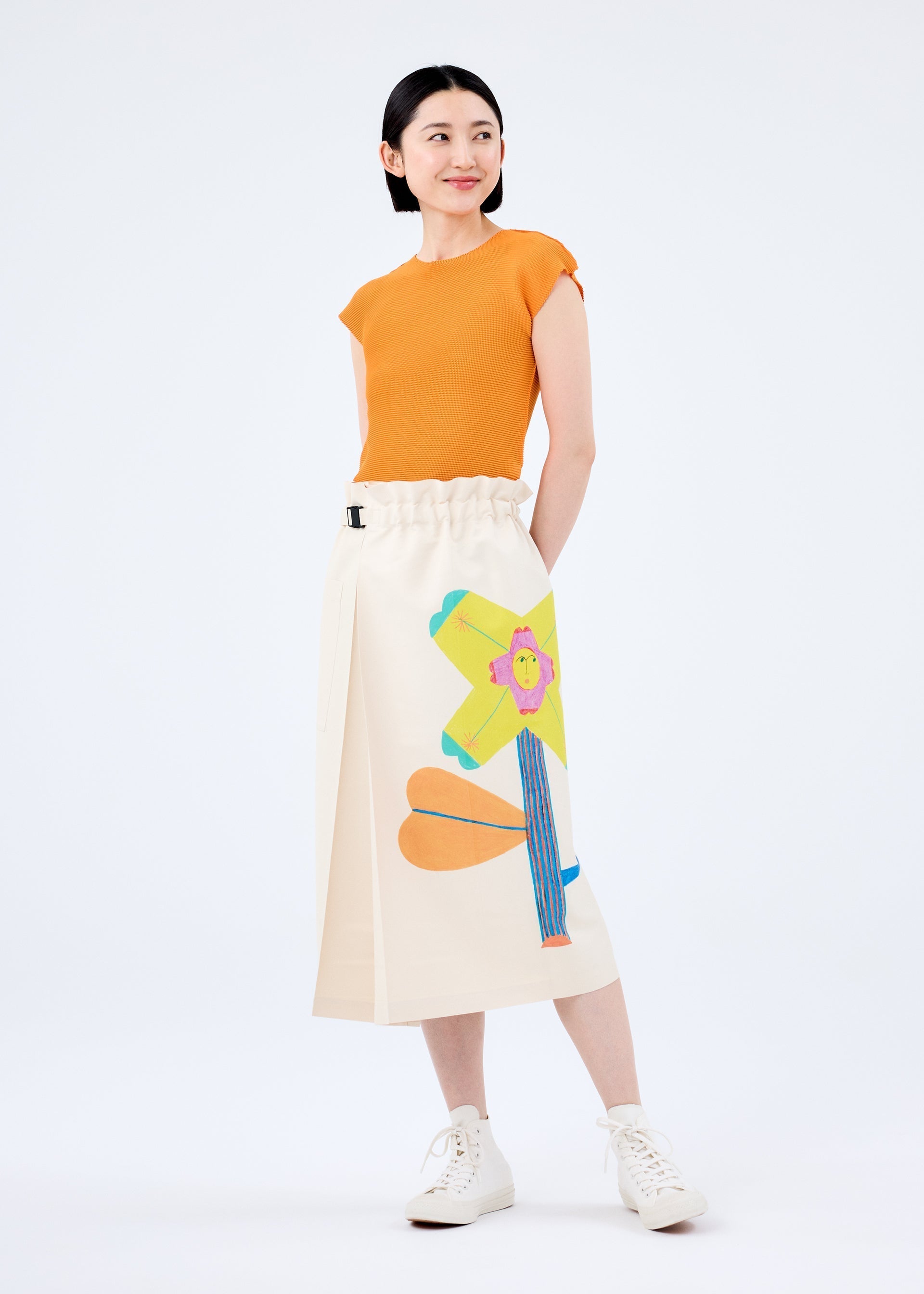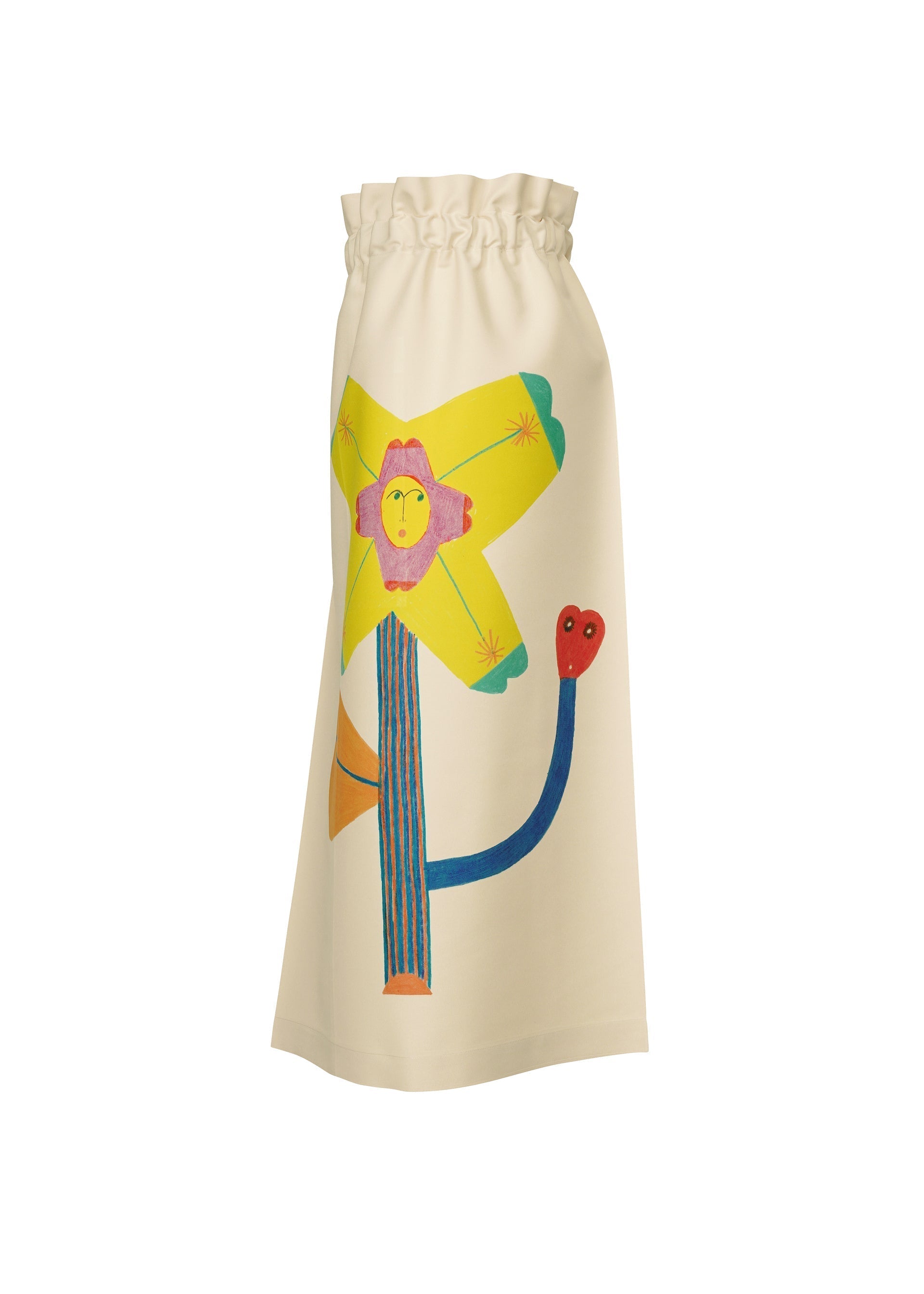 This skirt features a bold transfer print of a multi-colored flower pattern drawn with colored pencils. The wrap style gives the impression that you are wearing the illustrations. The inner button at the waist keeps the wrapped part securely in place. The skirt has one pocket.