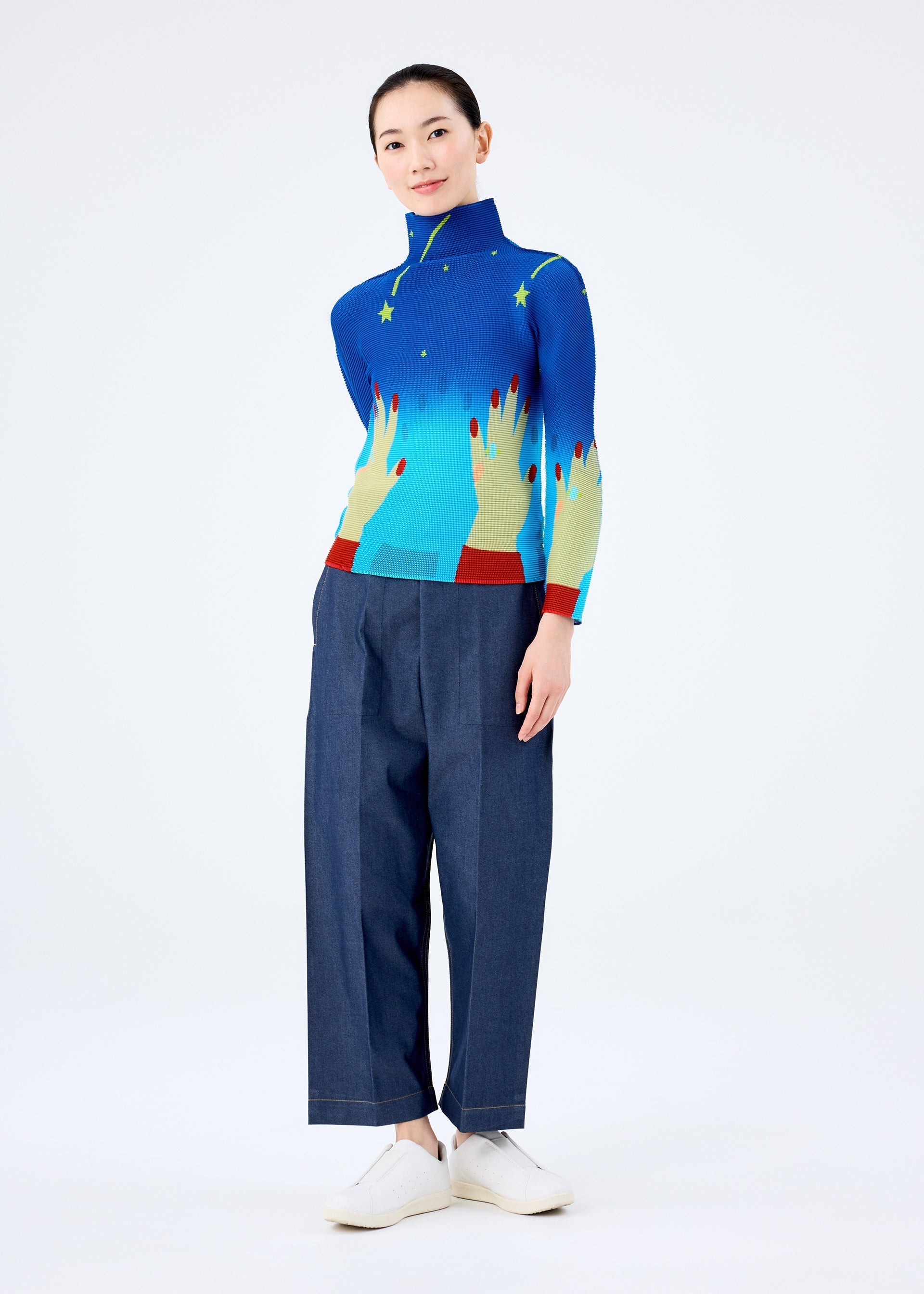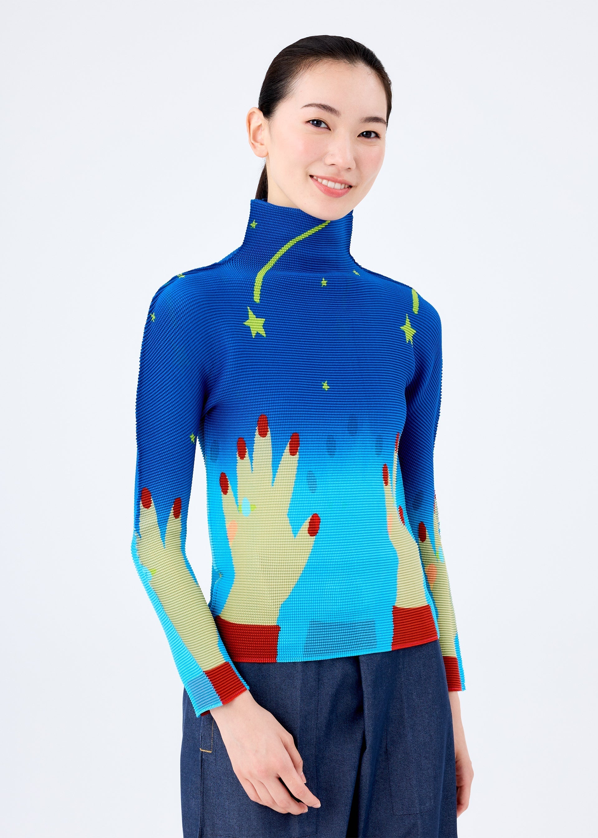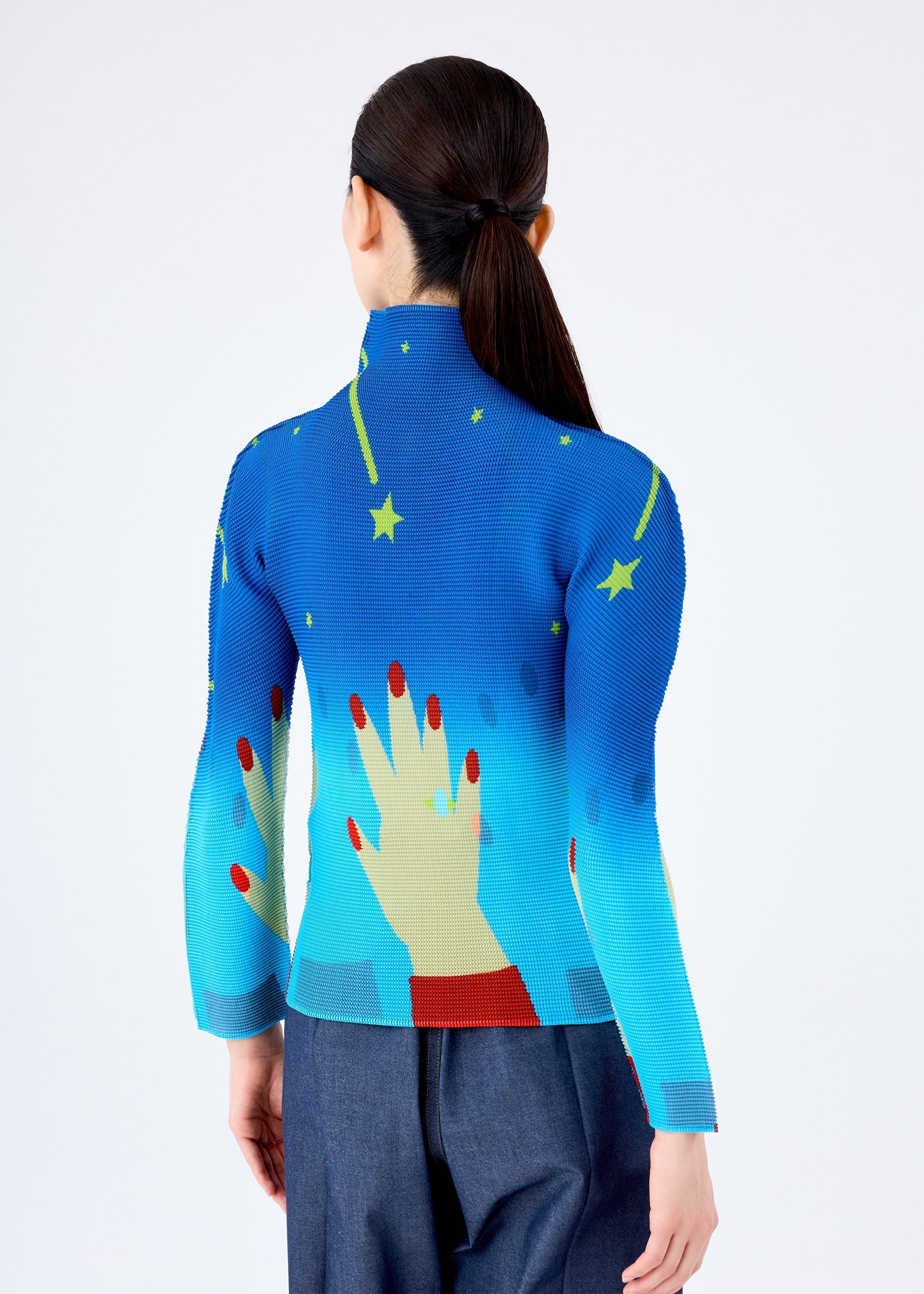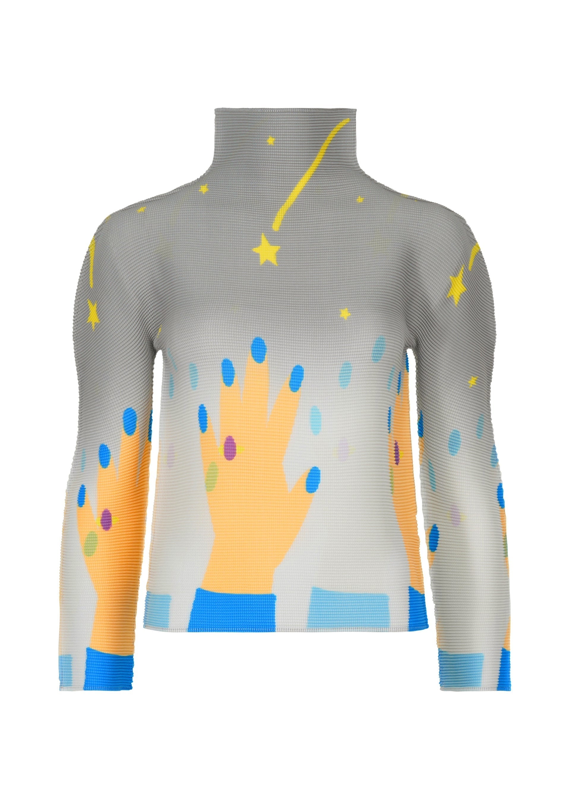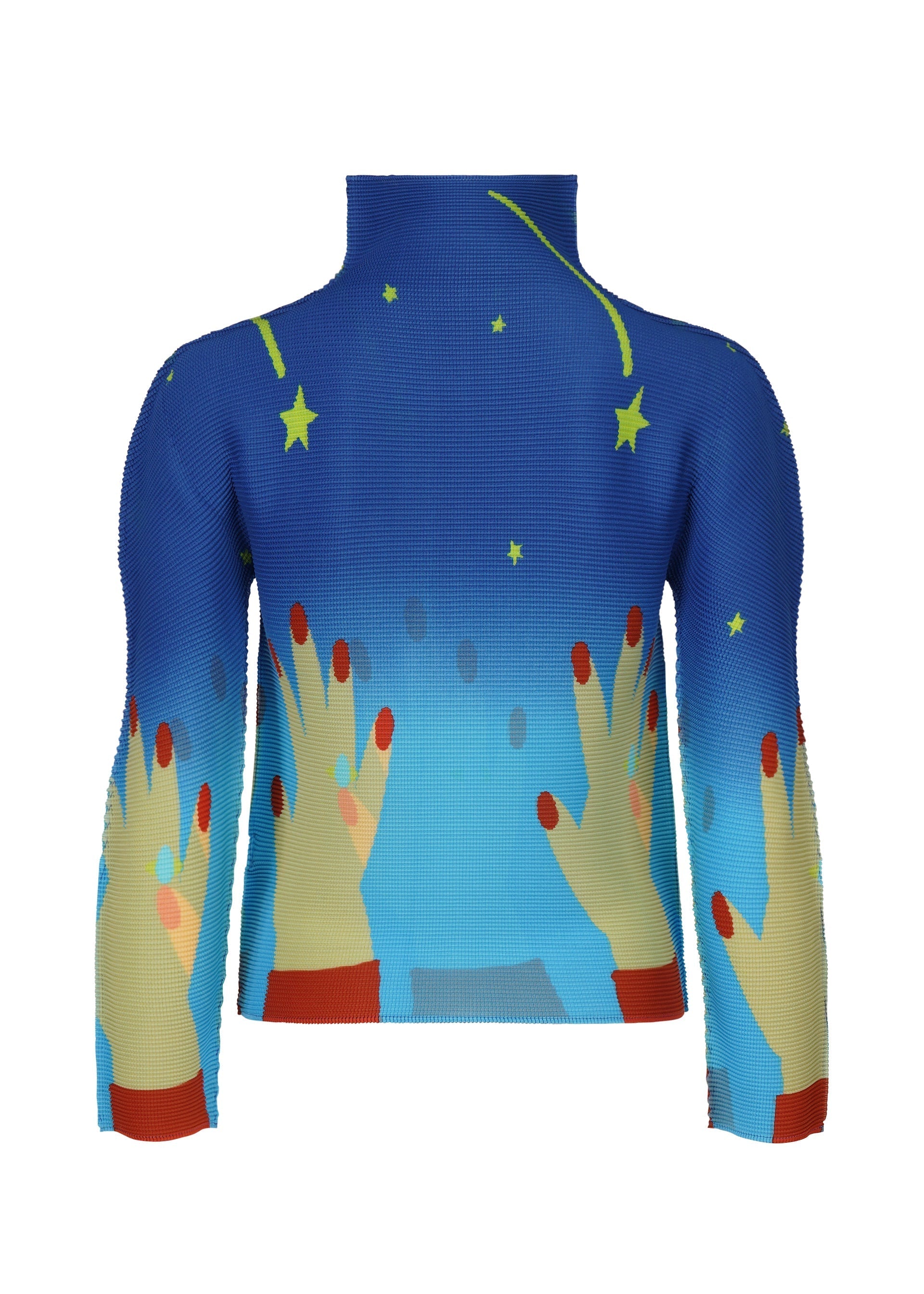 High-neck long-sleeved top with elastic stretch pleats, vertically and horizontally pleated. This pattern expresses the wish that ``if you find a shooting star, something good will happen.''