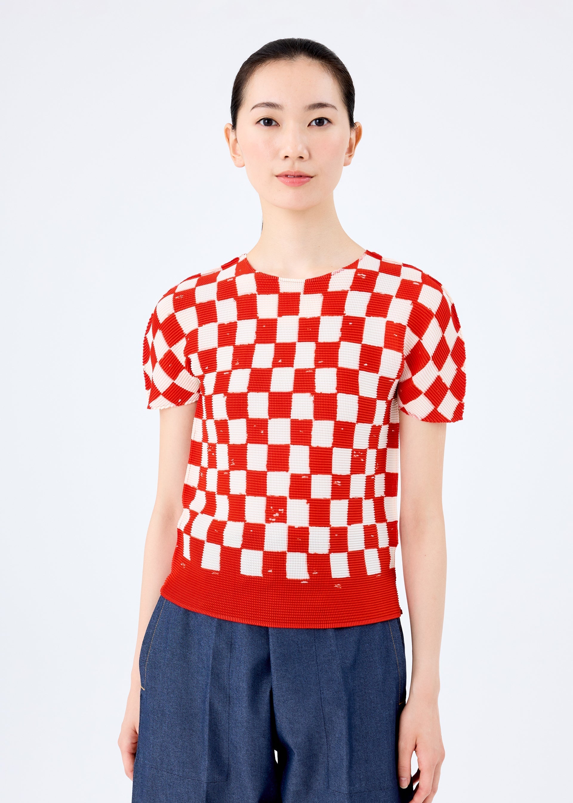 This STRETCH PLEATS round-neck, short-sleeved, stretchy top features vertical and horizontal pleats. The powerful yet soft pattern expresses a checkered pattern created with an eraser stamp.