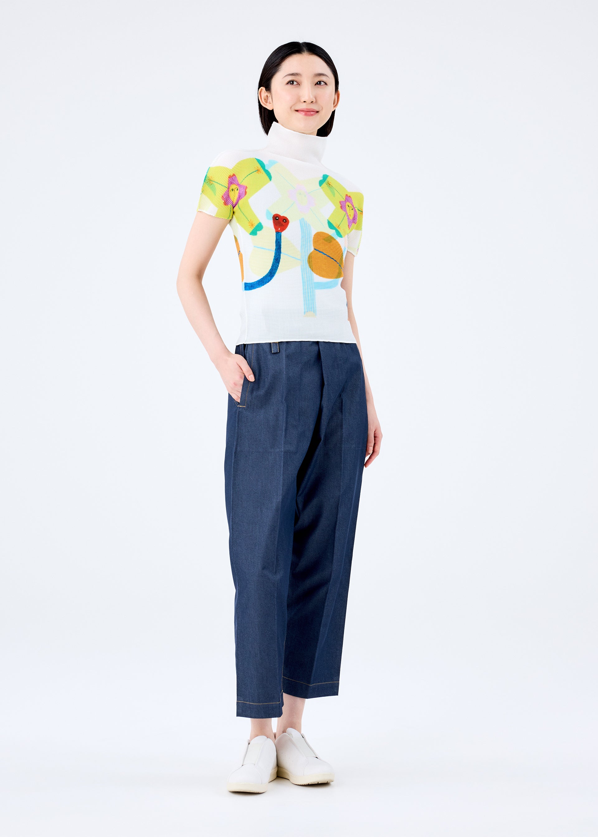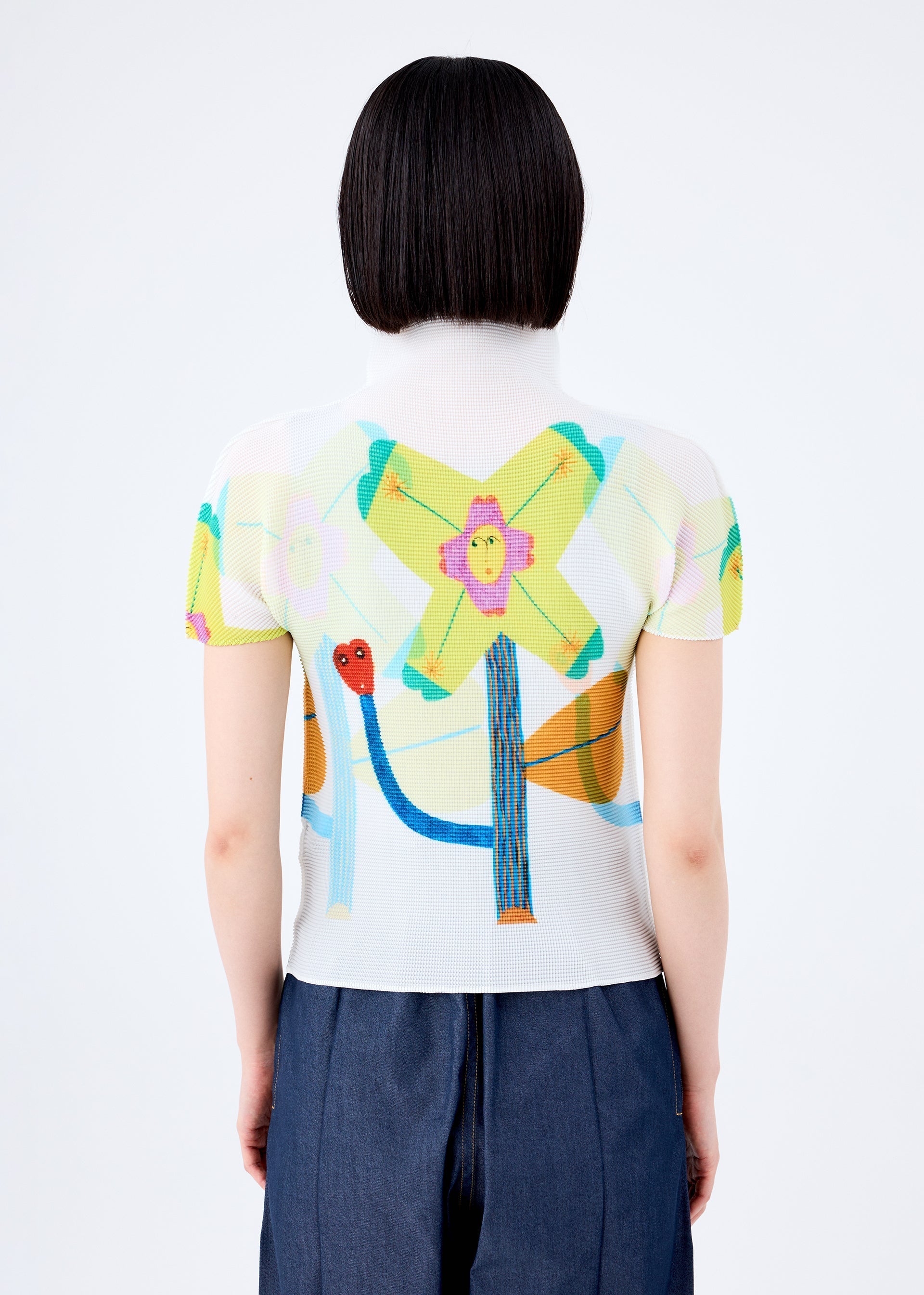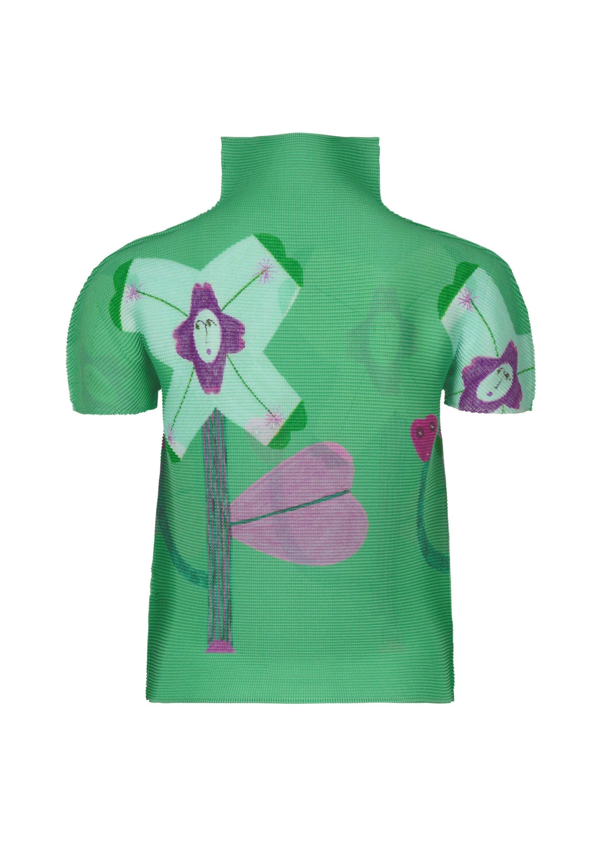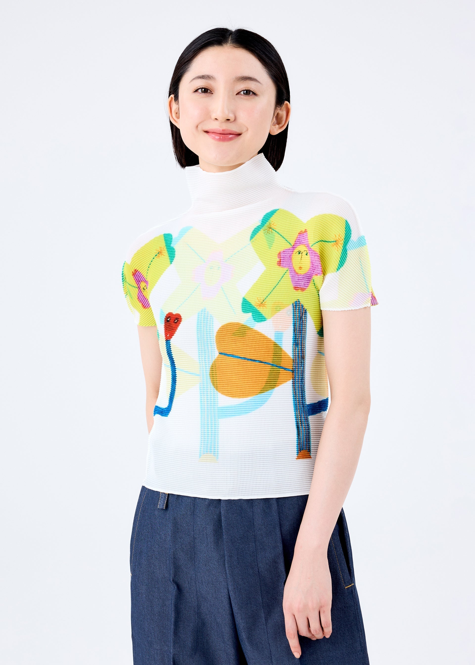 This STRETCH PLEATS high-neck, short-sleeved, stretchy top features vertical and horizontal pleats. The multicolored pattern drawn with colored pencils is inspired by the grown version of the plants featured in the illustrations of the "ICHINICHI" series. This fun item lets you enjoy the story of the "OHANA" and "ICHINICHI" series.