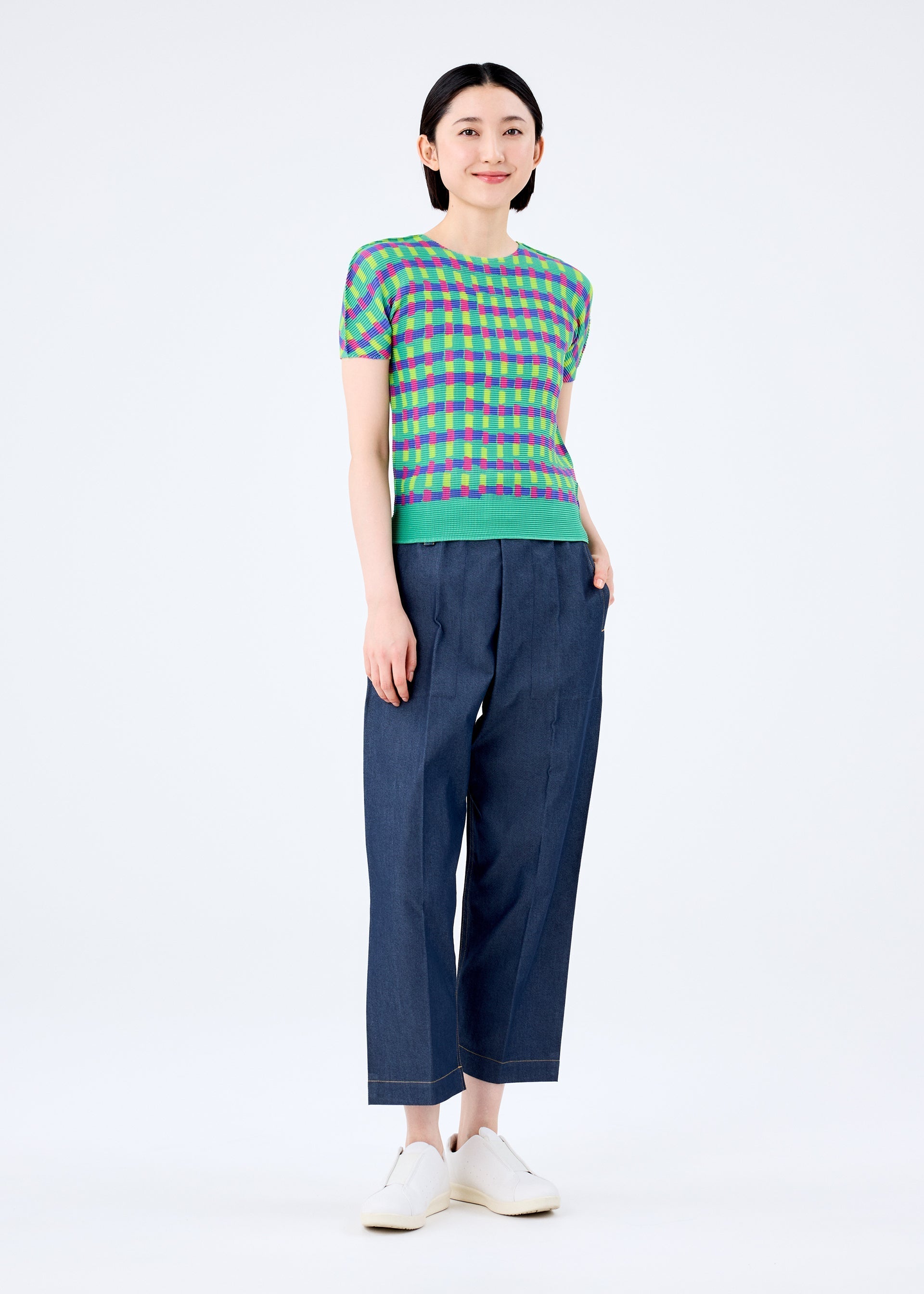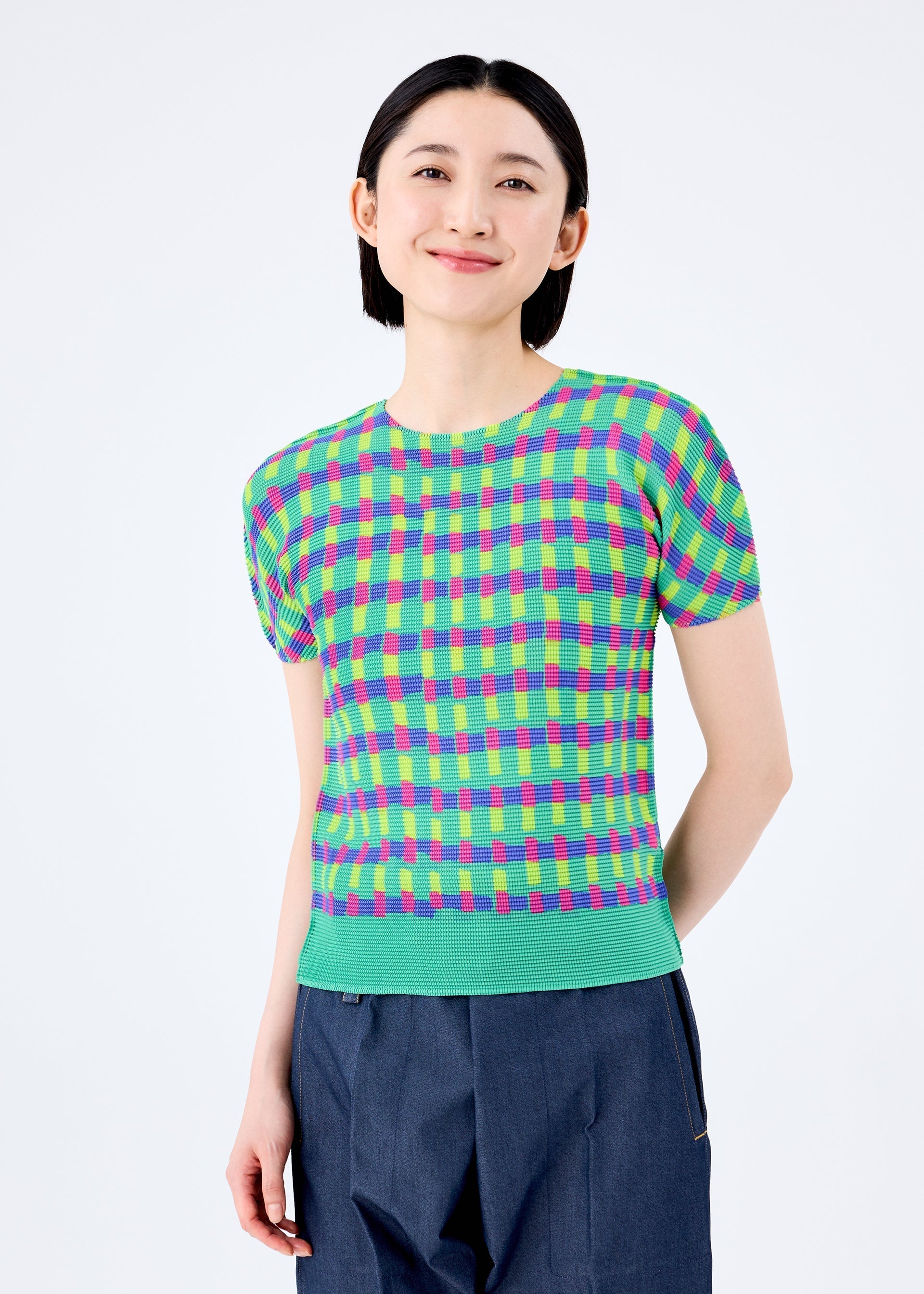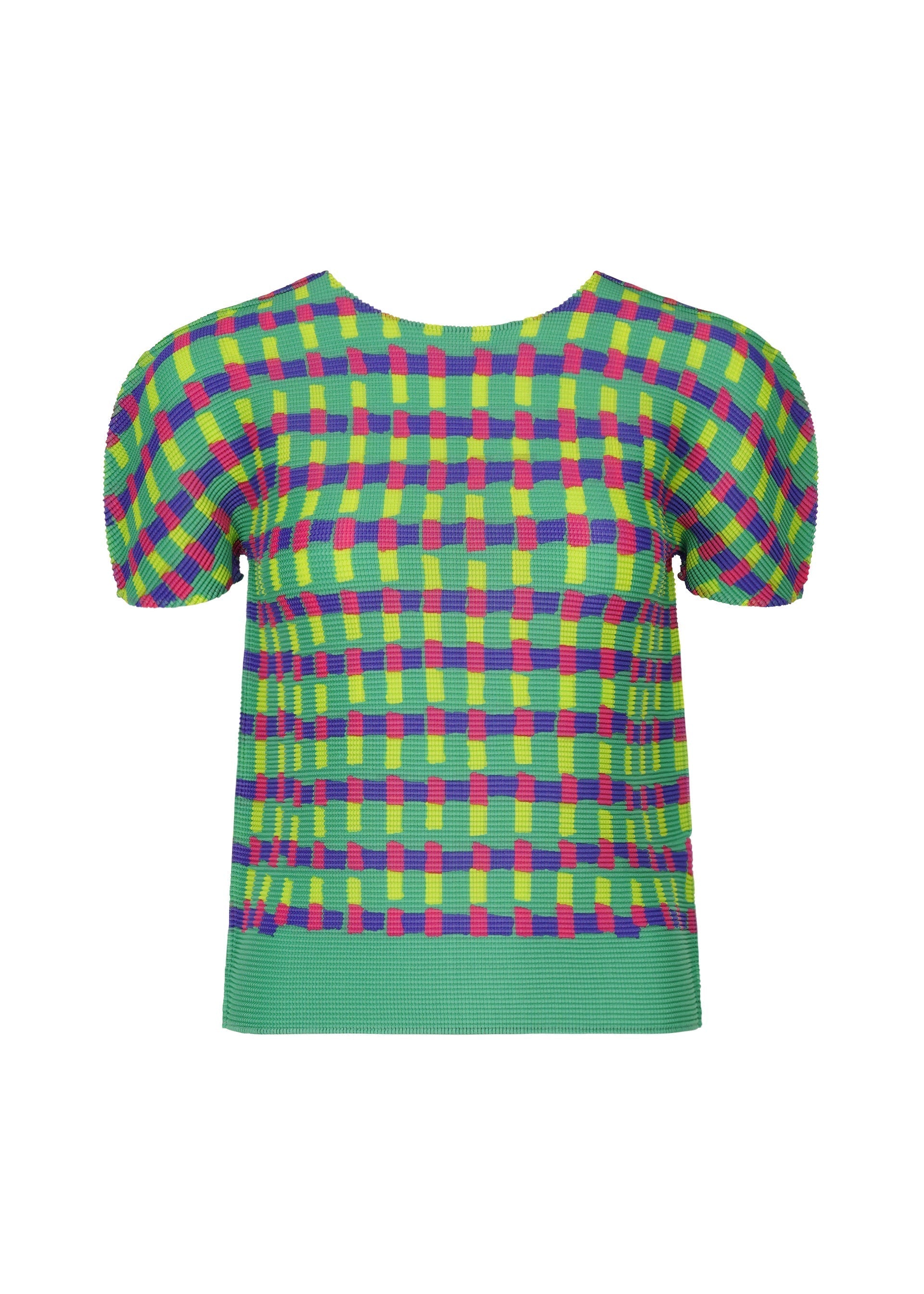 This STRETCH PLEATS round-neck, short-sleeved, stretchy top features vertical and horizontal pleats. It has an irregular checkered pattern drawn colorfully with markers.