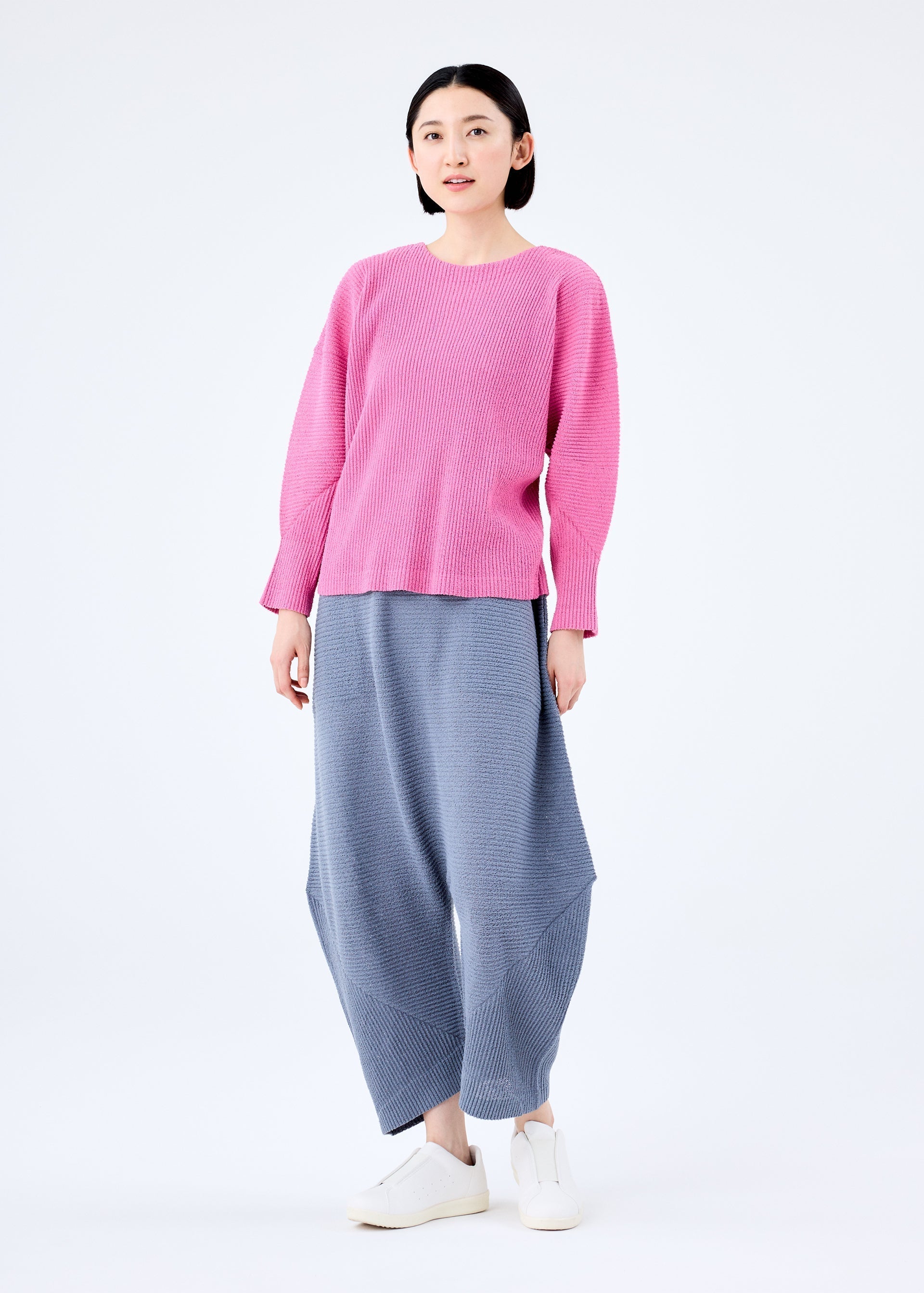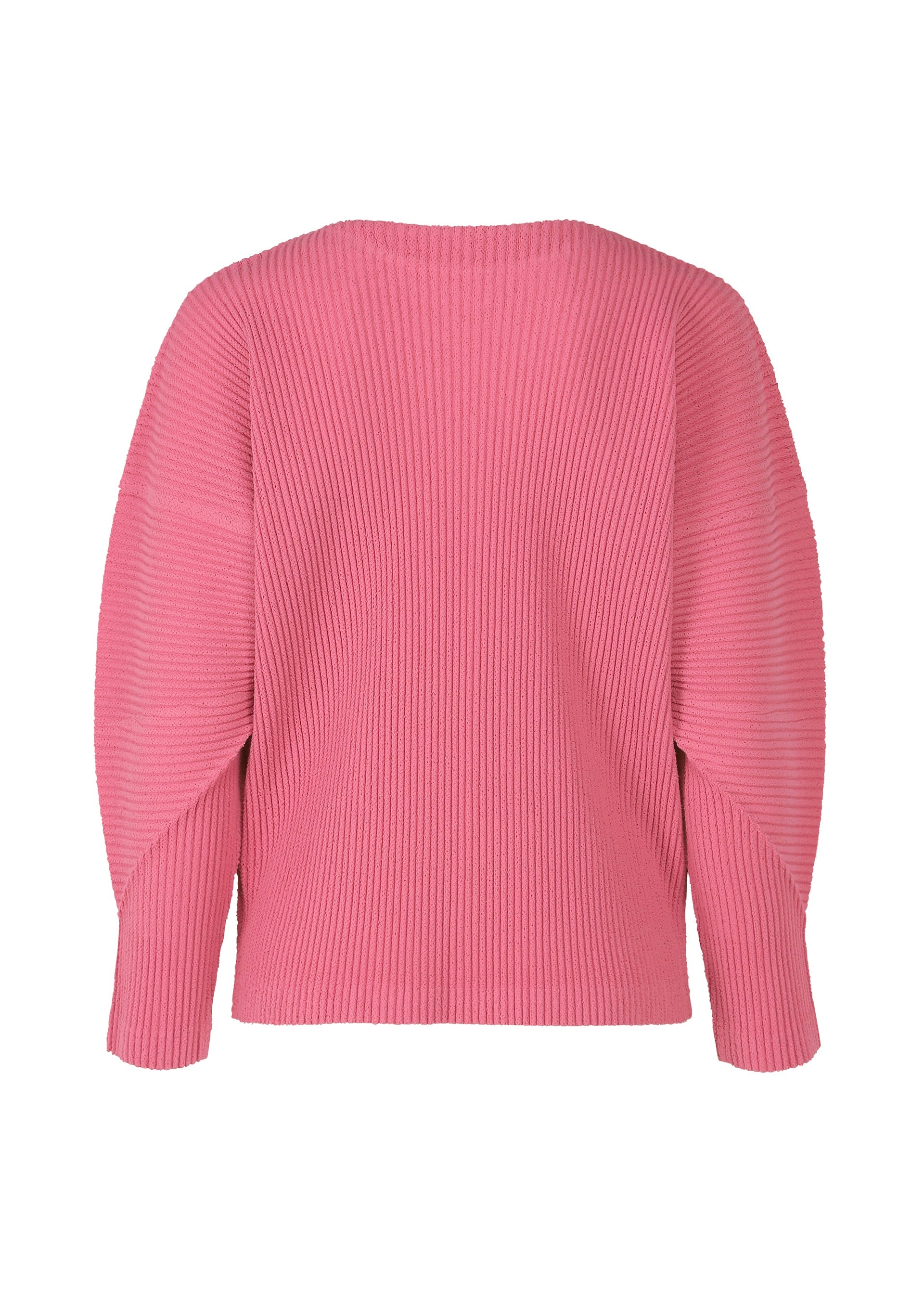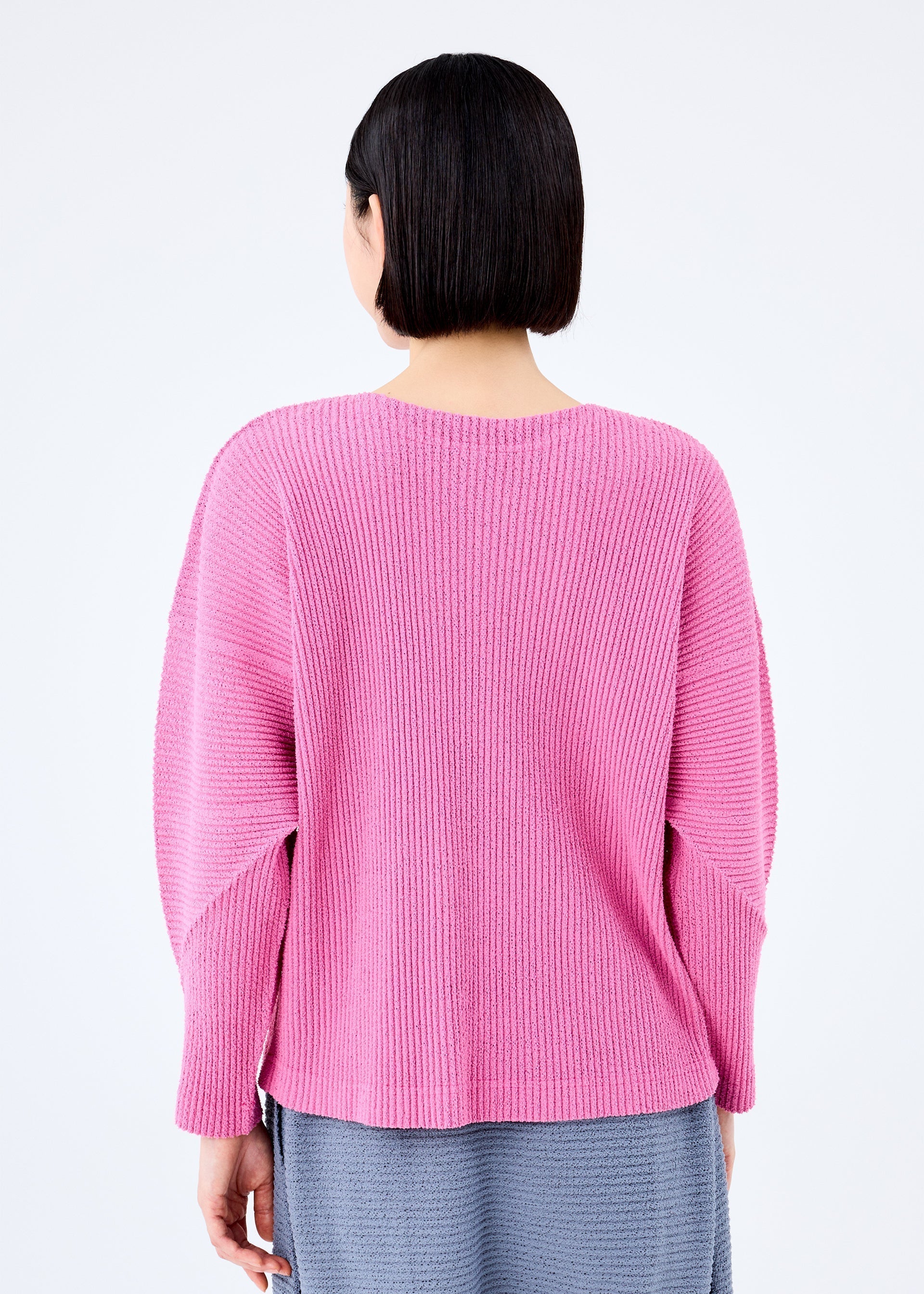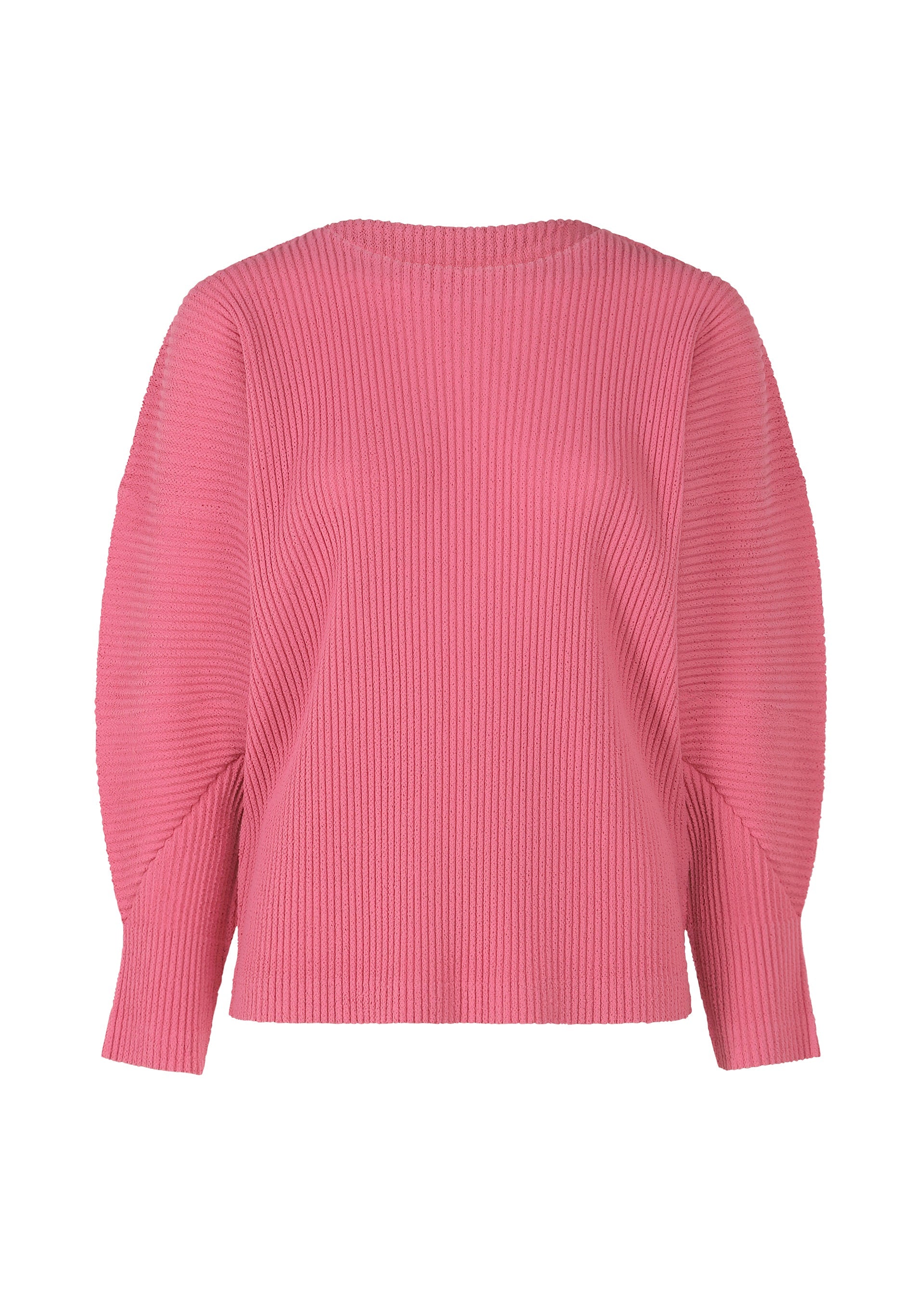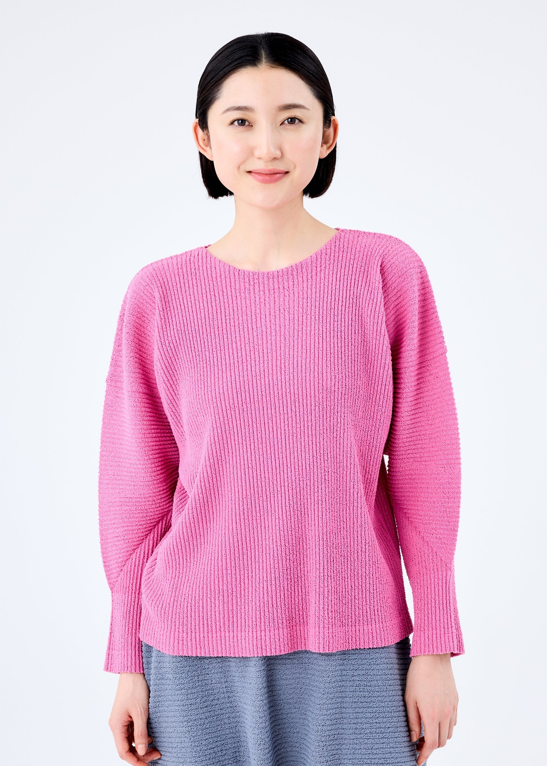 This round-neck, long-sleeved top is made by horizontally pleating mesh fabric with a soft, raised-nap surface. The mesh gives it a light feel, while its warmth makes it ideal for the fall and winter seasons.