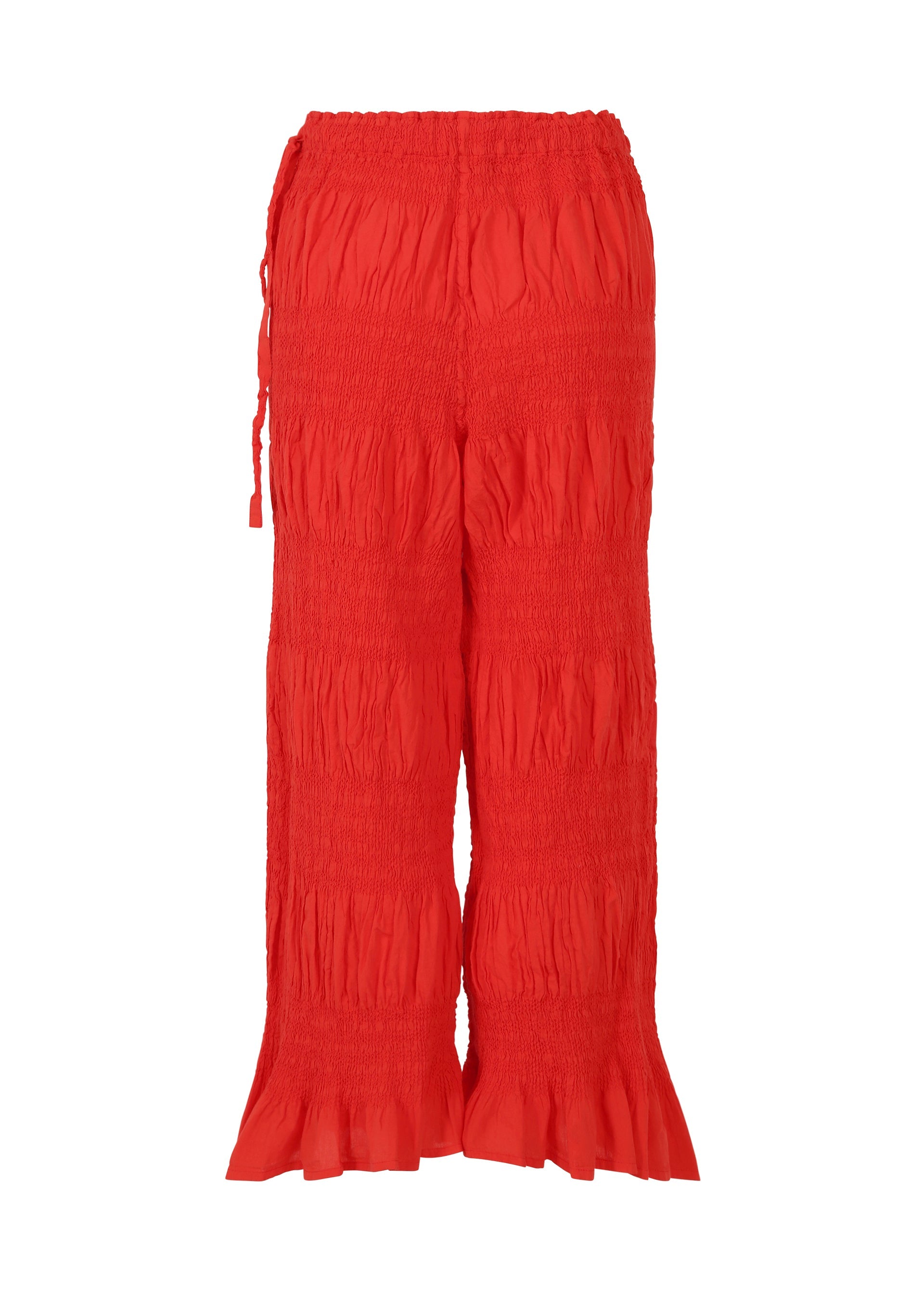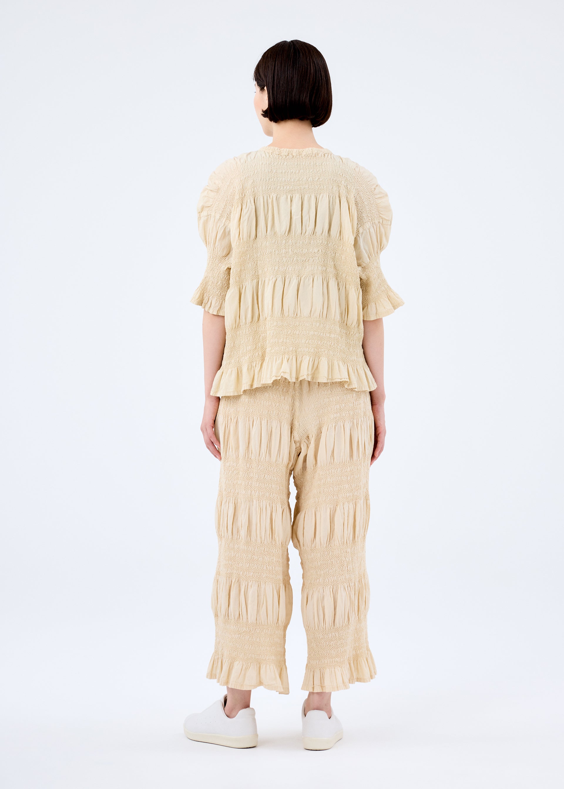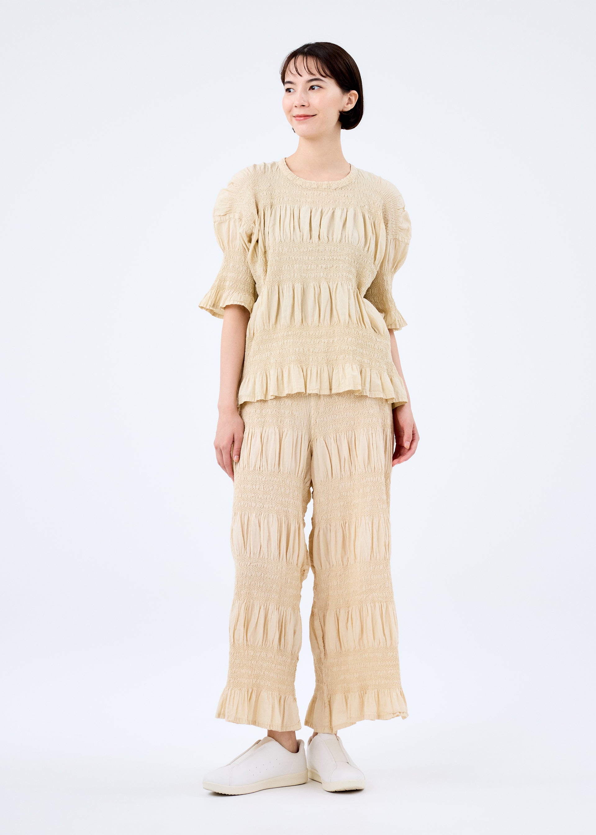 These wide pants leverage their design with their unique look made by creating a striped pattern with shrinkable and non-shrinkable thread for the weft, and then using the product-dyeing technique. This item offers refreshing, light comfort with its gentle cotton texture and moderately relaxed silhouette.
