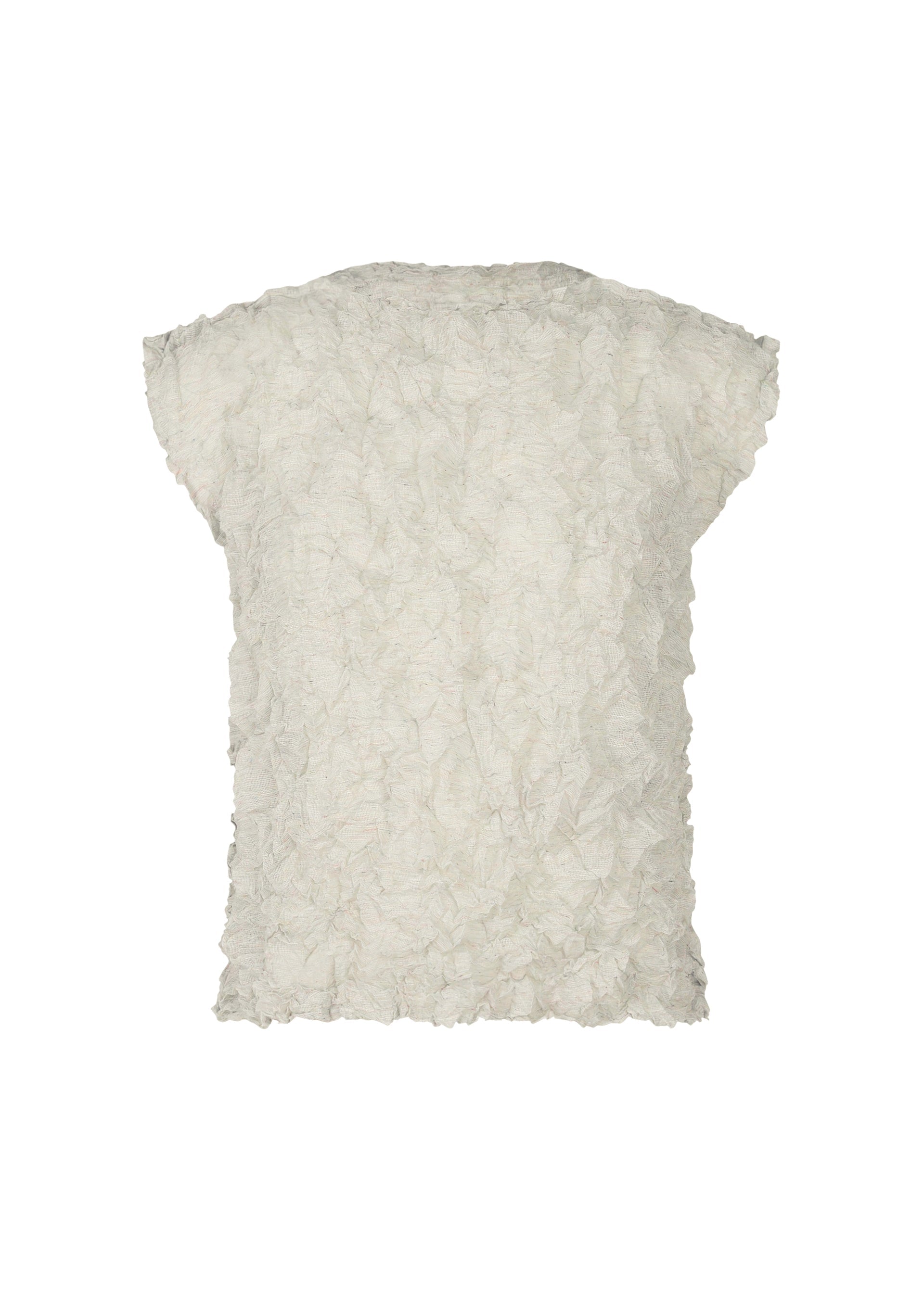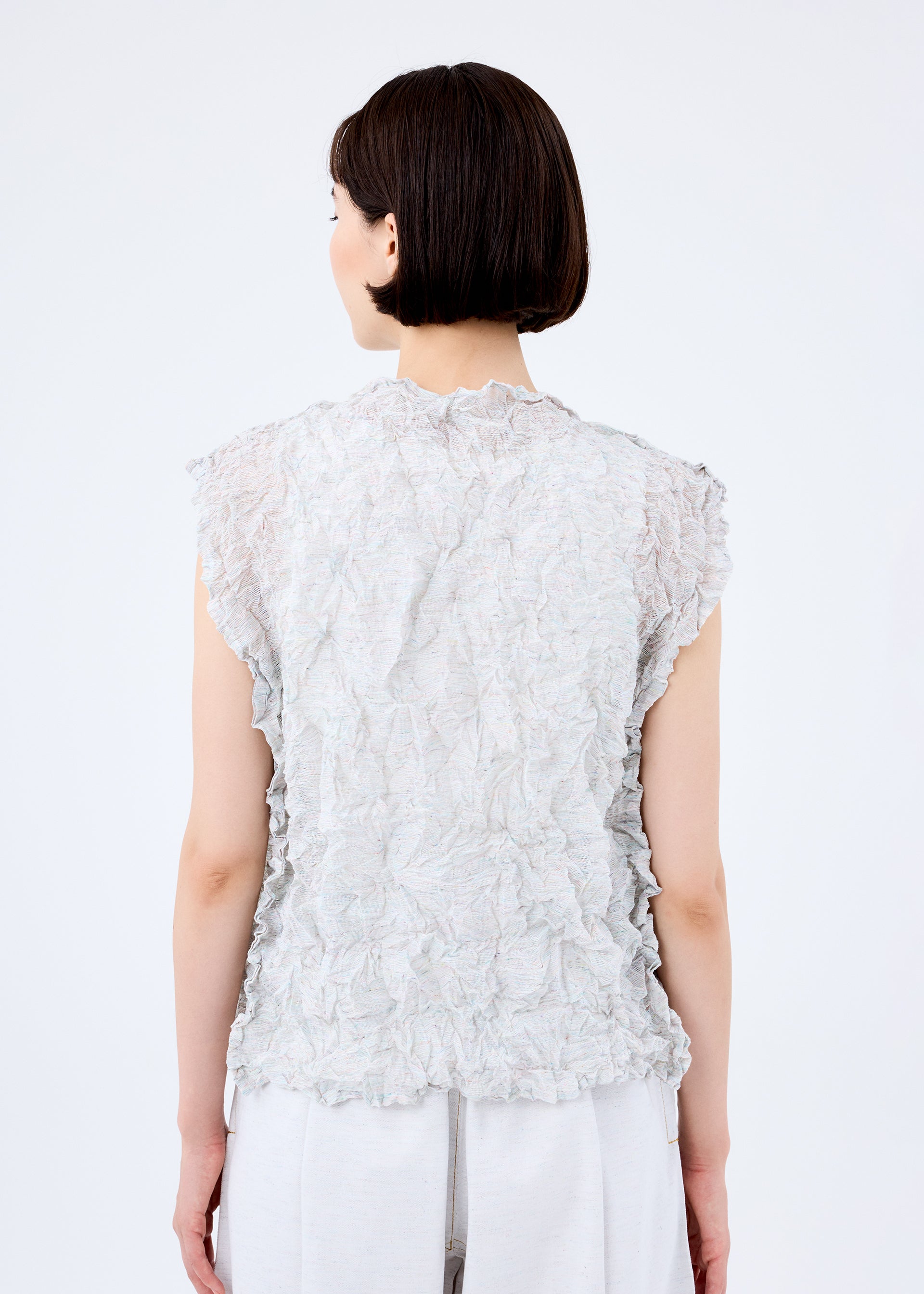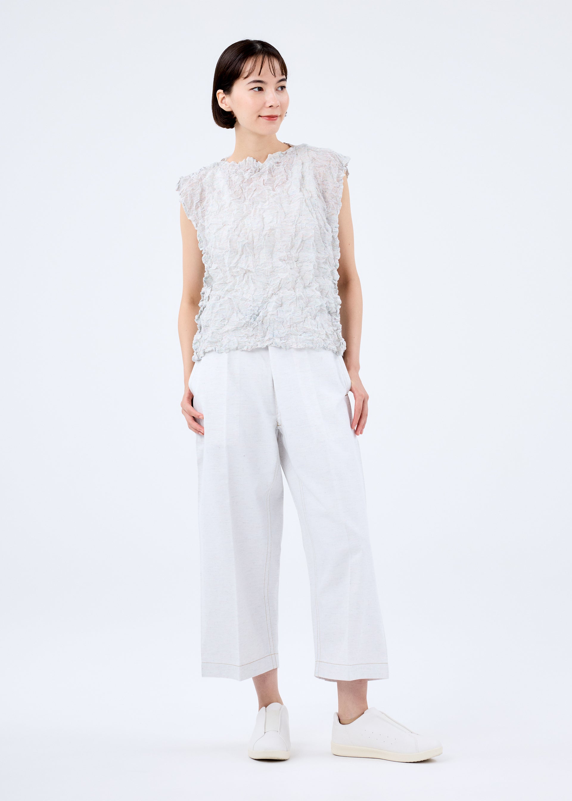 This top with French sleeves is made using thread newly created by blending polyester with reclaimed wool thread from the scraps and leftover pieces of STRETCH PLEATS fabric produced in the clothes-making process. It is characterized by its supple, light polyester material created by applying a crushed finish to the polyester that is given a woven-like look using a warp knitting machine that provides the appearance of inserted warp threads.