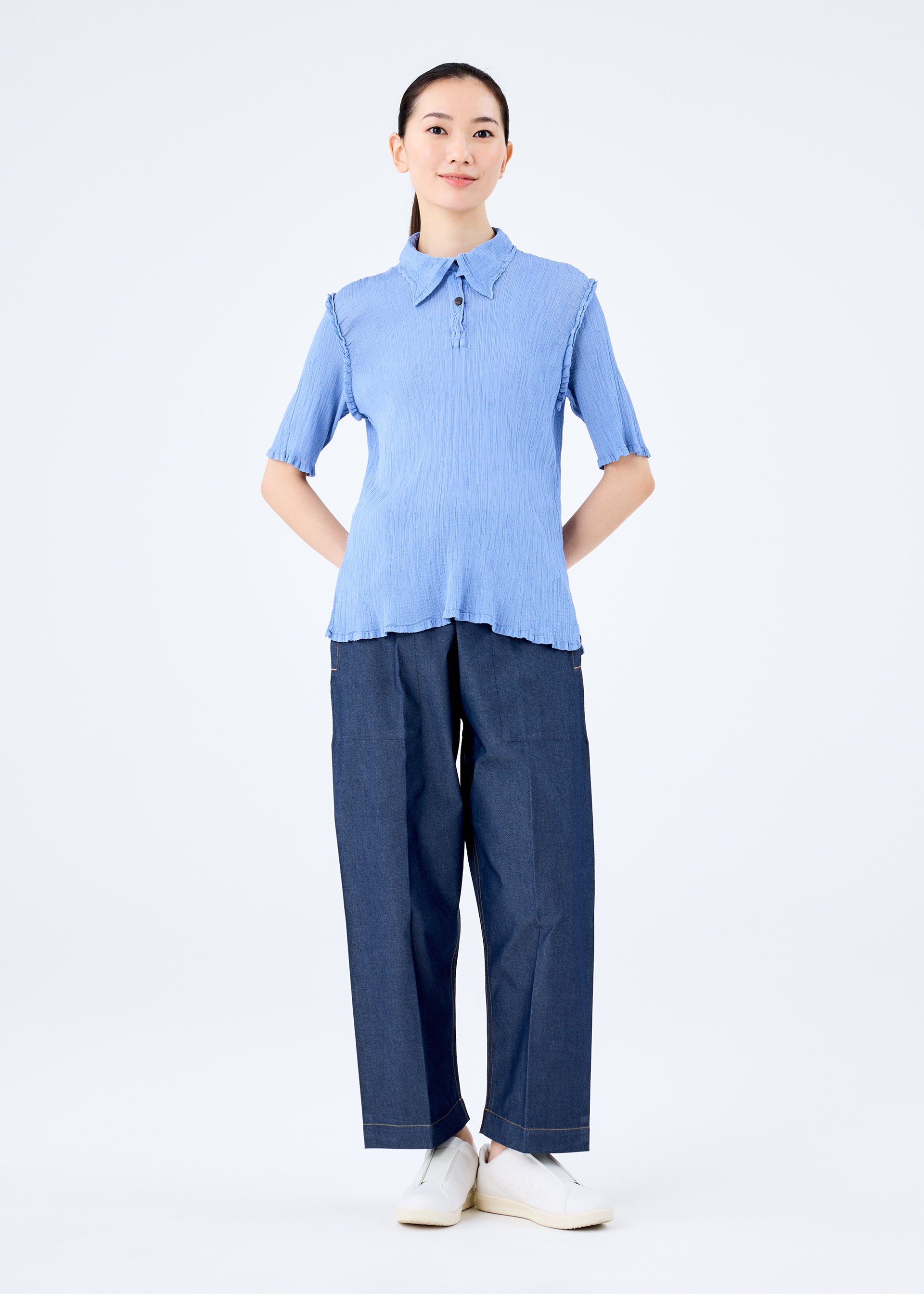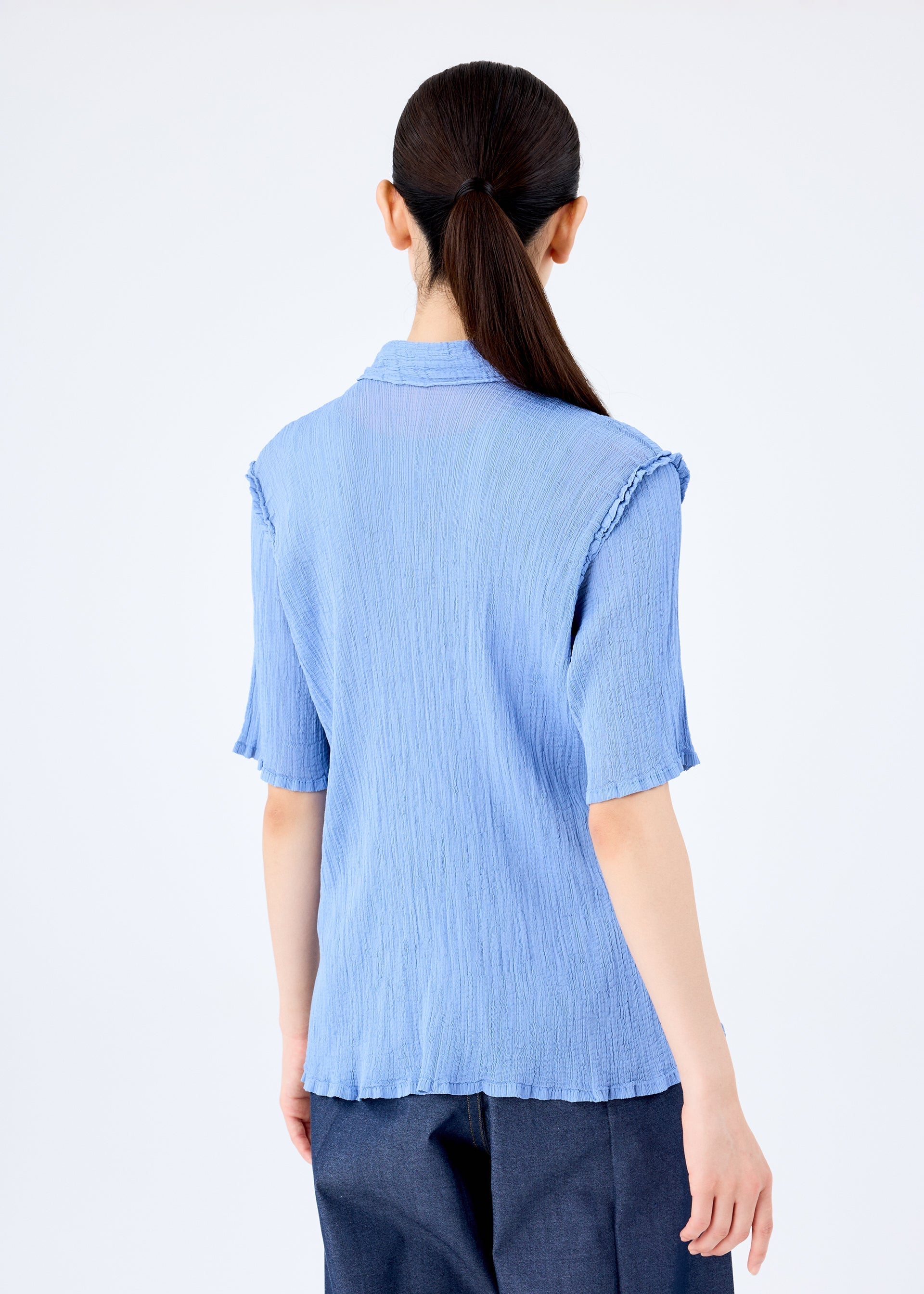 This SEE-THROUGH CREPE short-sleeved top is made from product-dyed fabric that is woven using high-twist thread for the weft. The weft thread is twisted back during the dyeing process, which gives the fabric the unique look of crepe with vertical creases. It has slits on both sides.