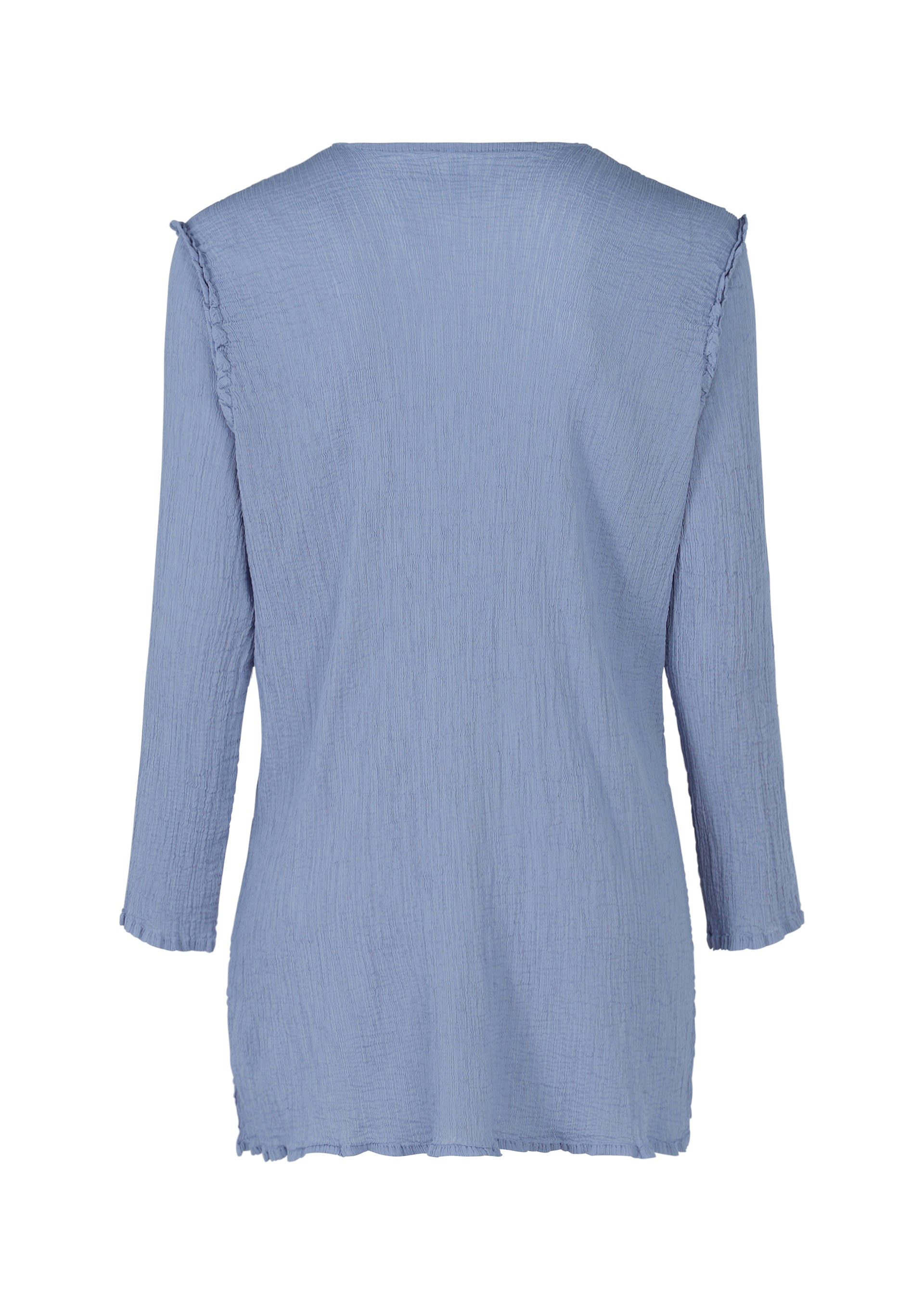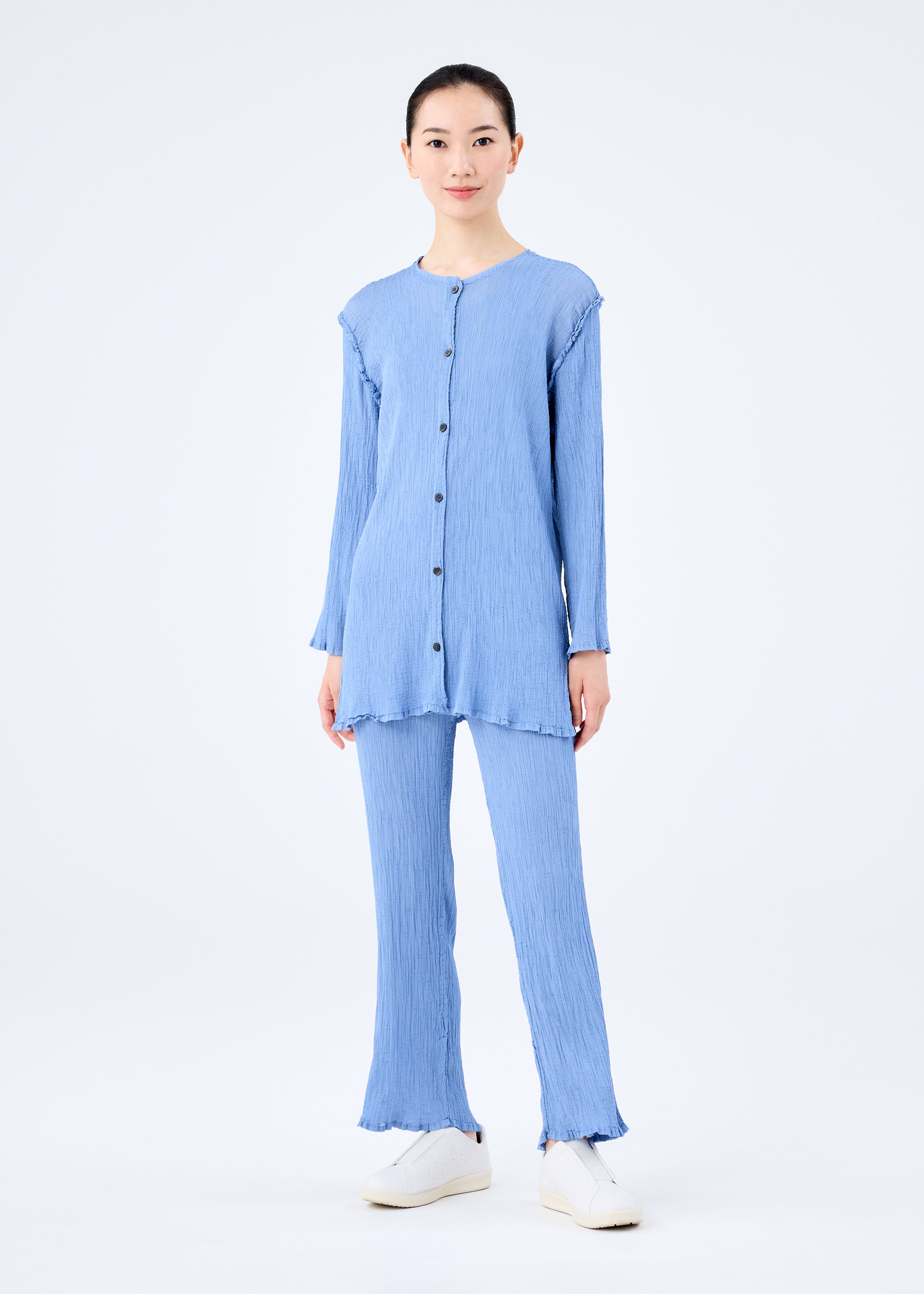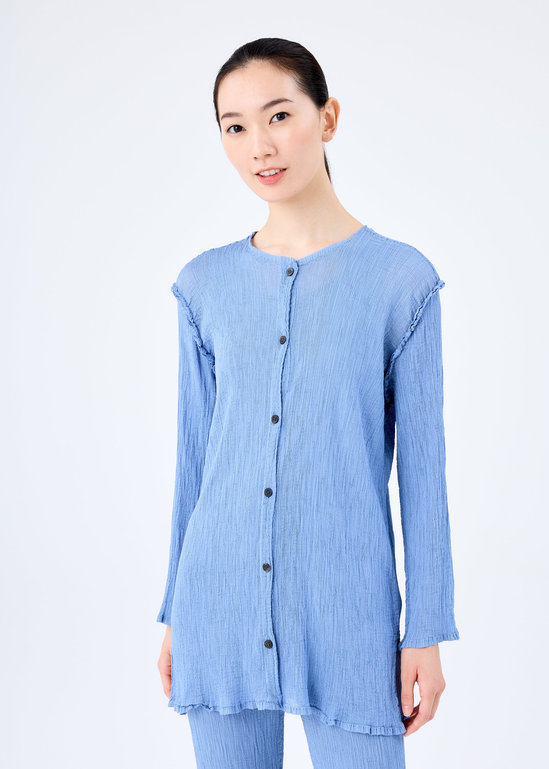 This SEE-THROUGH CREPE long-sleeved cardigan is made from product-dyed fabric that is woven using high-twist thread for the weft. The weft thread is twisted back during the dyeing process, which gives the fabric the unique look of crepe with vertical creases. It has slits on both sides.