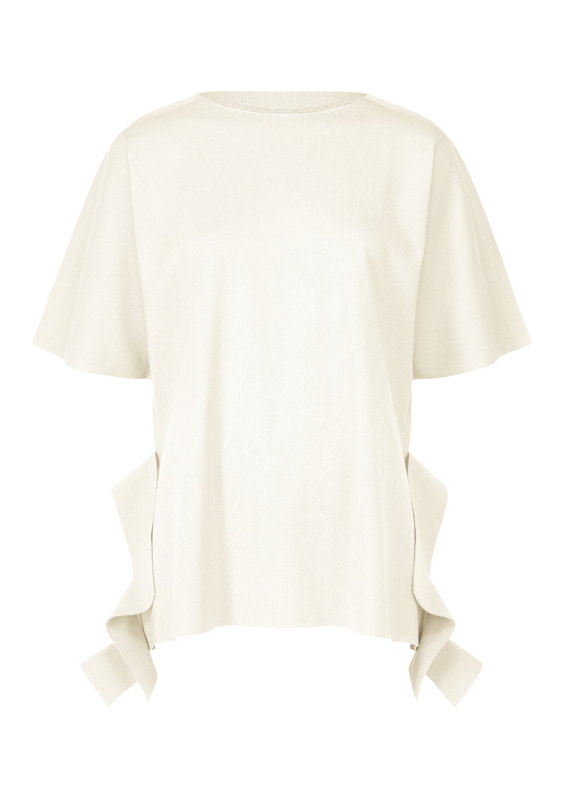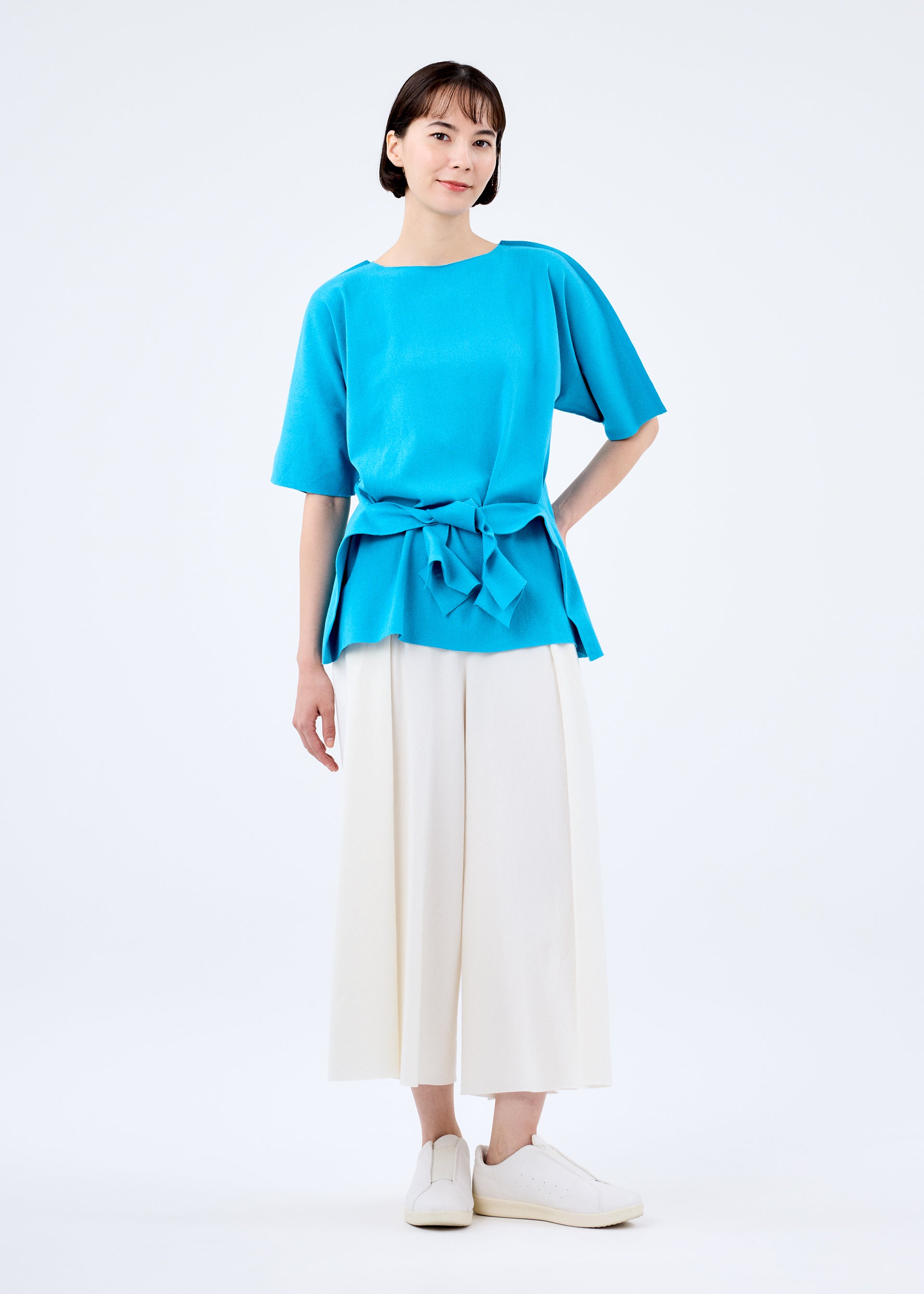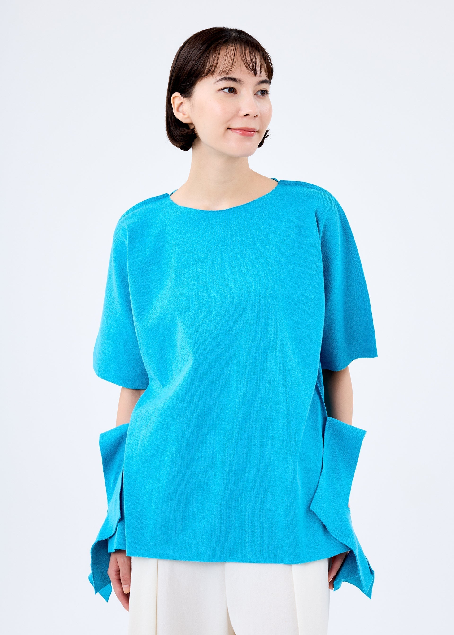 This short-sleeved top features a cotton-blend fabric with excellent stretch and a comfortable design with minimal seams. It is characterized by its sleek texture due to the natural material and puffy feel due to the garment dyeing process. The design leverages the fabric’s margin areas as an effort to reduce leftover material.