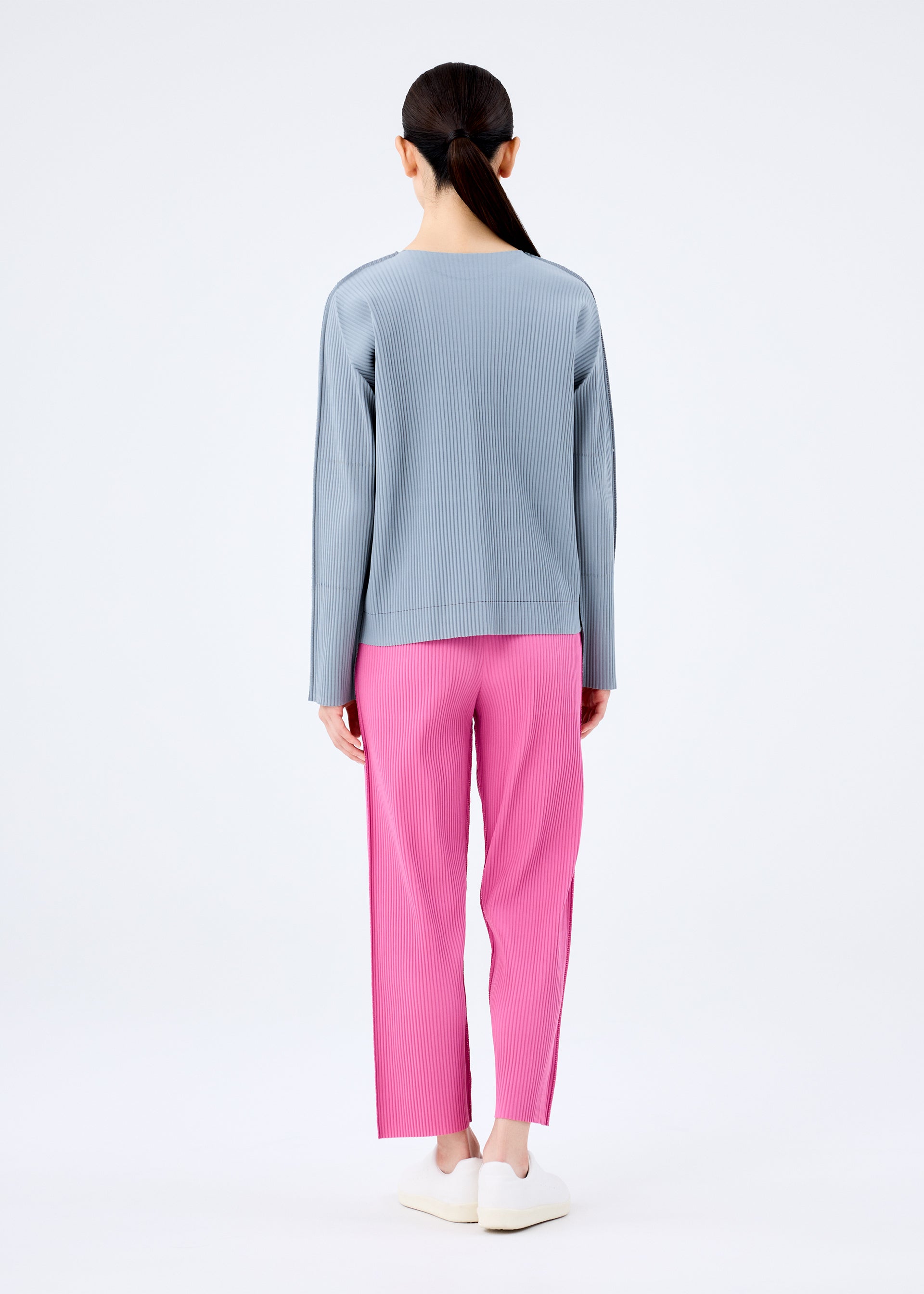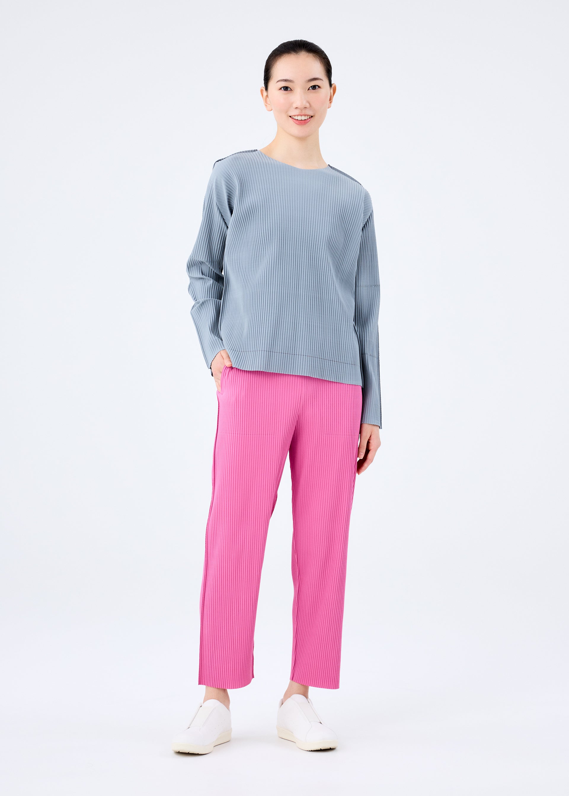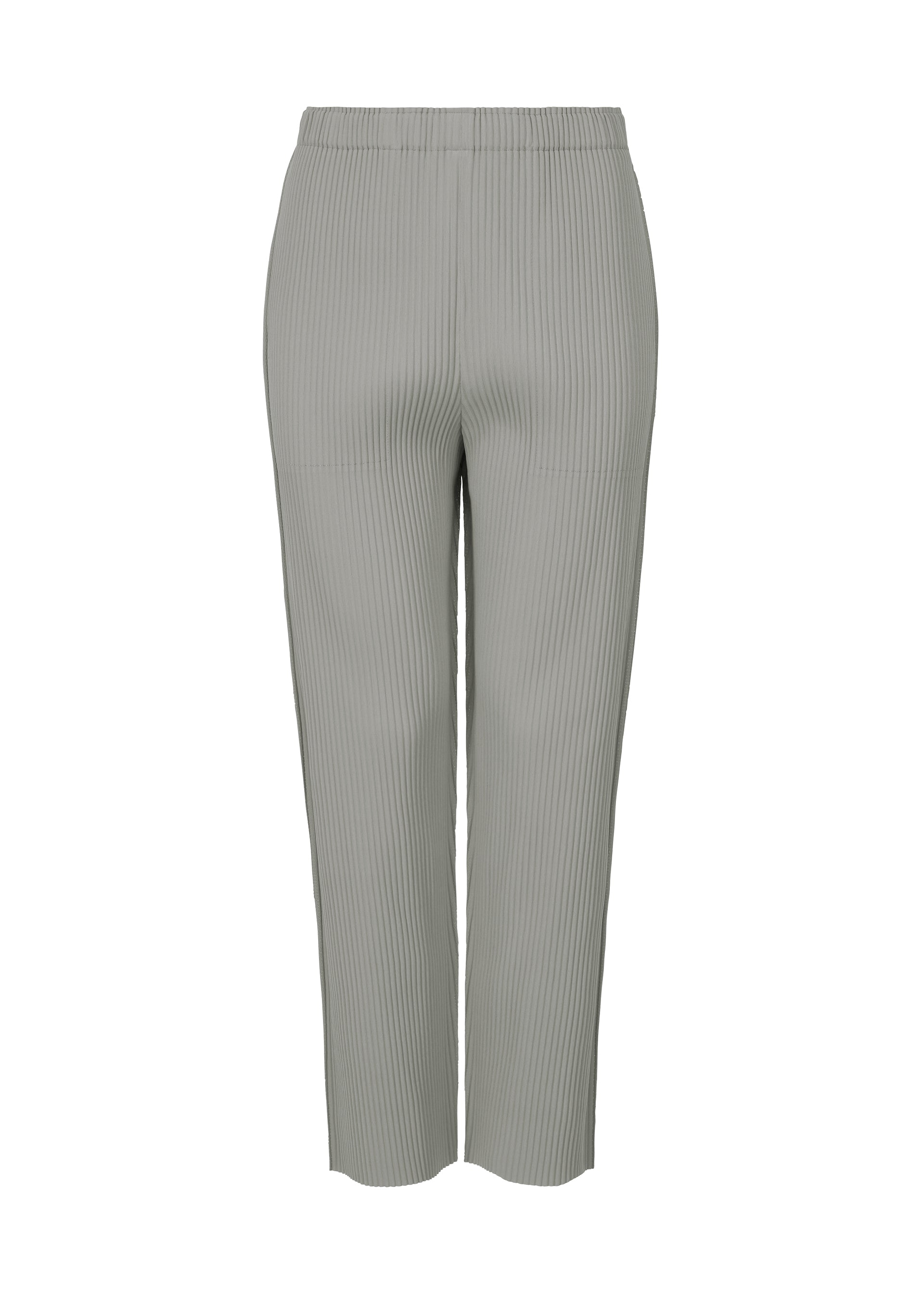 These fine knit, pleated, straight pants are characterized by their lightweight, soft feel and feature pleats applied to knit material made with stretchy, thin, soft yarn. There are pockets on both sides.